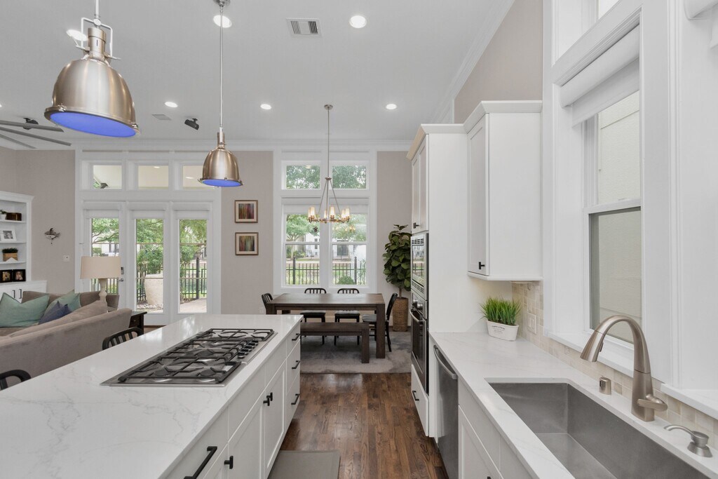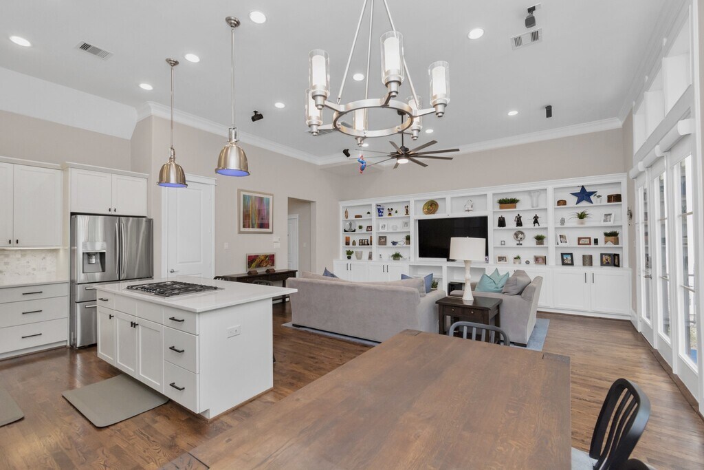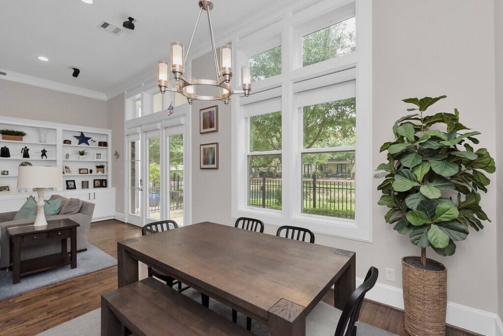 Welcome to 1716 Upland Lakes! Tucked in the quiet,gated Upland Lakes community,this standout home blends Mediterranean charm with cozy bungalow style. The 4-bedroom,3.5-bath residence spans three stories,featuring luxurious hardwood floors and ceilings up to 12 feet. The open-concept first floor is perfect for entertaining,with seamless flow and beautiful lake views. Enjoy automatic blinds,custom built-ins,and a large kitchen island with a 5-burner stove. The primary suite offers a relaxing retreat with large windows,custom shutters,and a versatile flex space. Its updated bathroom features modern finishes and stylish colors from floor to ceiling. Relax on the third-floor balcony and take in the evening views. Walk-out of your patio and onto the walking track around the serene lake! Best of all,you're just minutes from City Centre,I-10 & Beltway 8 for easy city living! MLS# 72876465