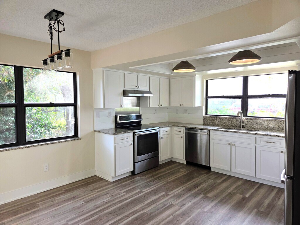 Completely Updated - Very nice single family home with two car garage is available for immediate Annual Lease. This is a one-story updated residence with three bedrooms and two bathrooms with private fenced yard great for pets and for entertaining family and friends. It features a bright open floorplan with a modern vibe that is designed for comfortable living. The bright Great Room has soaring vaulted ceiling and luxury vinyl plank flooring that opens into Kitchen. Enjoy the large updated Kitchen featuring white shaker-style cabinets with lots of storage, stainless steel appliances and solid stone countertops, perfect for the most discerning chef.. The primary bedroom offers a private sanctuary with an en-suite bathroom with vanity and walk-in shower and a roomy closet. Bonus space at rear of home. Application fee $65 per adult, $100 tenant processing fee and $45 month for tenant insurance and benefits package. Pet friendly. Two dogs or cats up to 60 lbs. with $250 non-refundable pet fee. Listed by Drew Carlyle with Keller Williams Realty Gulf Beaches