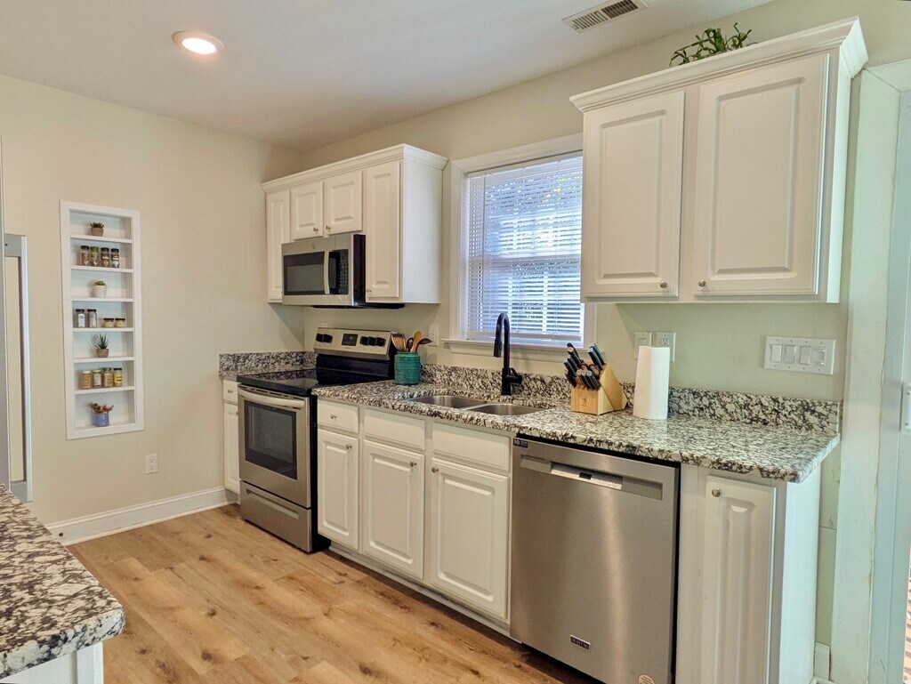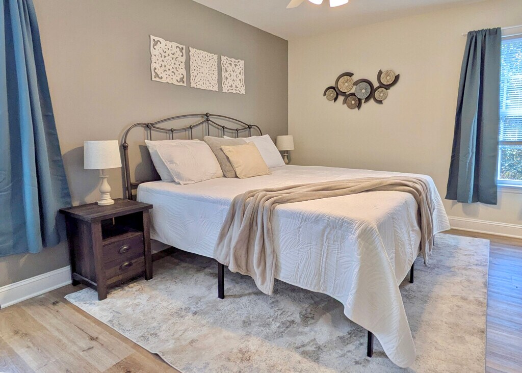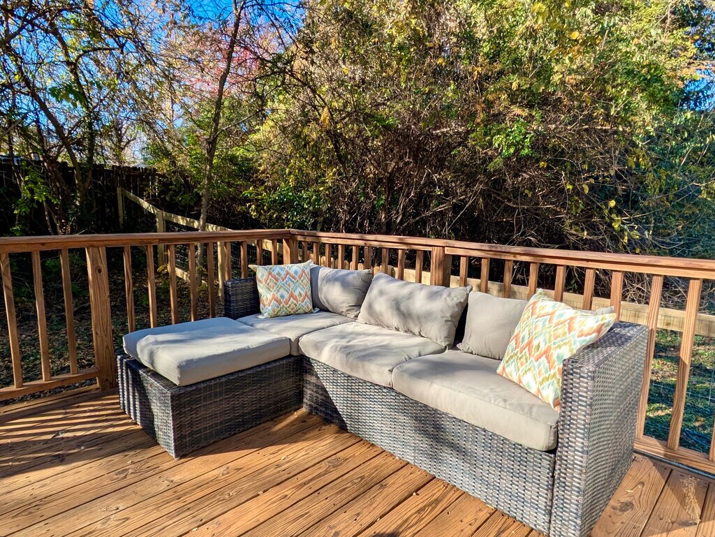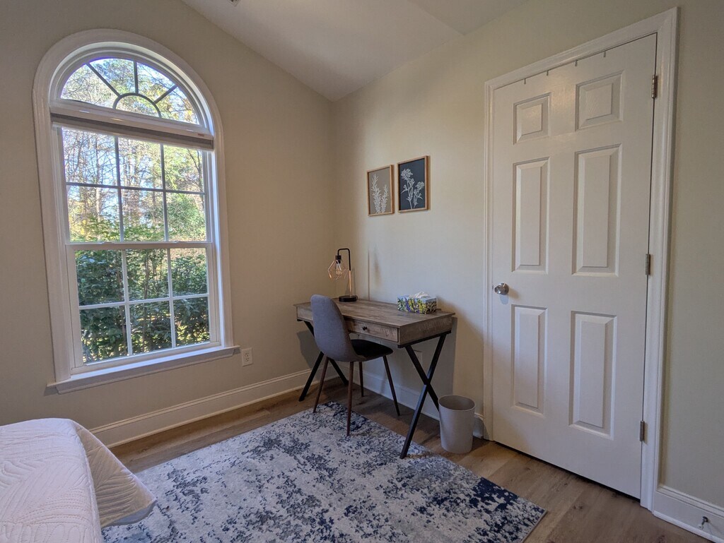 Fully furnished, renovated, cute & cozy 3 bedroom / 2 bath house in the desirable Lakewood neighborhood, available as early as Dec 8 for monthly rental (terms negotiable, please inquire!). Sleeps 5, fully fenced backyard. Enjoy the peaceful privacy of a natural setting surrounded by trees, all while being within only a 4 minute walk to Cocoa Cinnamon, Lakewood Social, and Lakewood shopping center, or a 5 minute drive to Duke's west campus or downtown! Pets allowed on a case-by-case basis, credit and background check required. $2500/mo including utilities, $1500 security deposit, $200 move-out cleaning fee. [interior photos will be updated as staging is completed] Bedroom 1: King bed, en-suite full bathroom, walk-in closet, 40" TV with Roku, nightstands and lamps, blackout curtains Bedroom 2: queen bed, closet, nightstands and lamps, blackout cellular shades and window cover Bedroom 3/office: twin XL bed, closet, nightstand and lamp, desk & chair with lamp, blackout cellular shades and window cover Additional full hall bath for bedrooms 2 & 3 and laundry area with washer/dryer included. Living room: sofa and loveseat, accent chair, 55" 4k smart TV, coffee & end tables Full Kitchen / dining area: granite counters, stainless steel appliances inc dishwasher, dual keurig + regular coffee maker, expandable dining table with seating for 4.