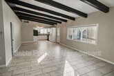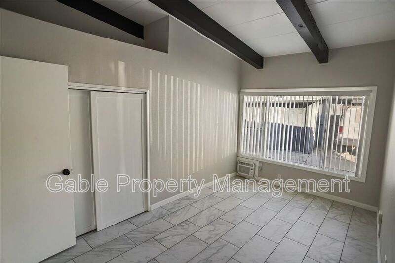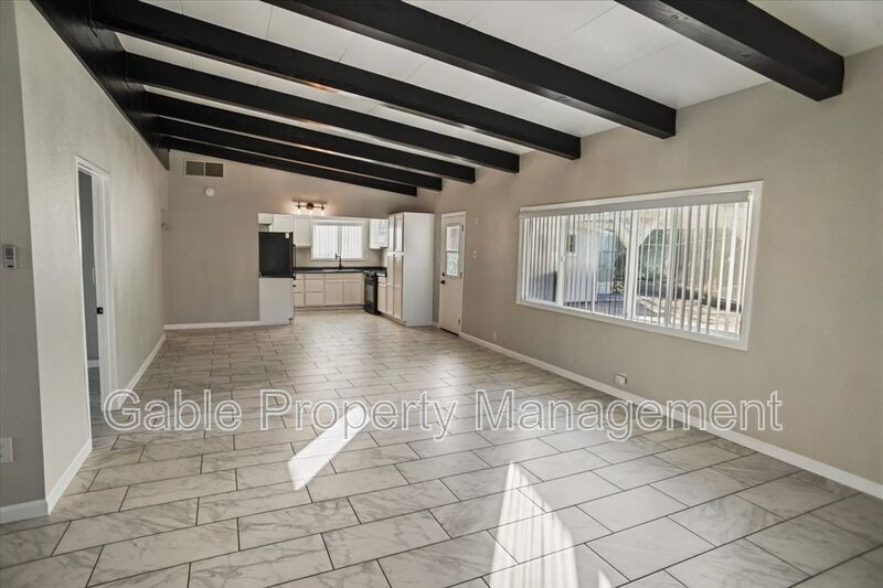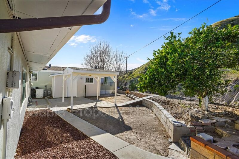 Beautifully remodeled single-story home featuring 2 bedrooms and 2 bathrooms, a private yard, storage shed, parking, and laundry hookups. This move-in-ready property offers fresh paint, high ceilings with exposed wood beams, and a spacious family room with a rock fireplace and ceiling fan. The home features upgraded tile flooring throughout (no carpet), a dining area, and plenty of natural light. The brand-new remodeled kitchen includes custom cabinetry with abundant storage and a pantry, upgraded countertops, a brand-new refrigerator, oven, and microwave, a stainless-steel sink, and an upgraded waterfall faucet. The primary bedroom offers high ceilings, a ceiling fan, closet space, and a beautifully upgraded attached bathroom featuring an upgraded vanity, modern lighting, and a walk-in shower. The second bedroom also features high ceilings and a closet. The second bathroom has been upgraded with a modern vanity, updated lighting, and a walk-in shower. Step outside to enjoy a private backyard with no close rear neighbors, plus a storage shed with laundry hookups. This property is truly move-in ready!