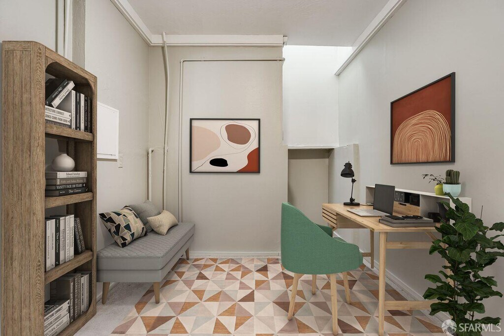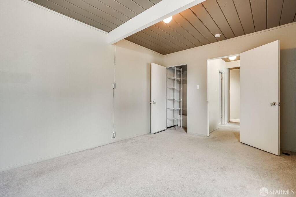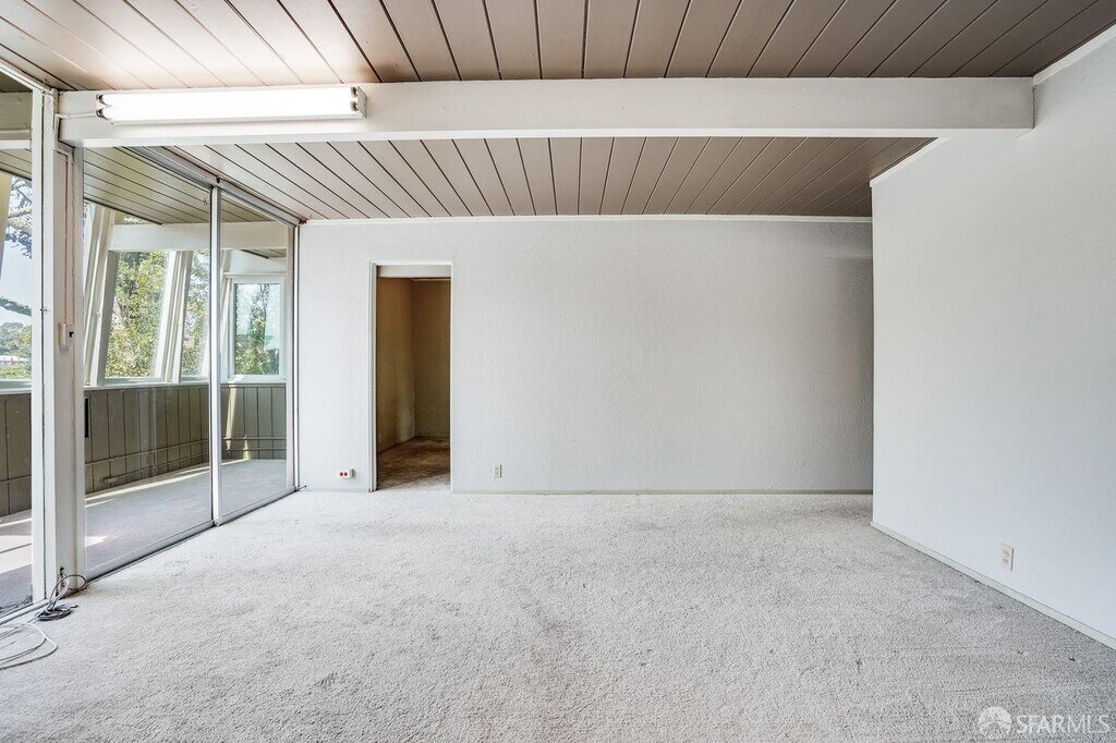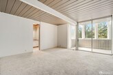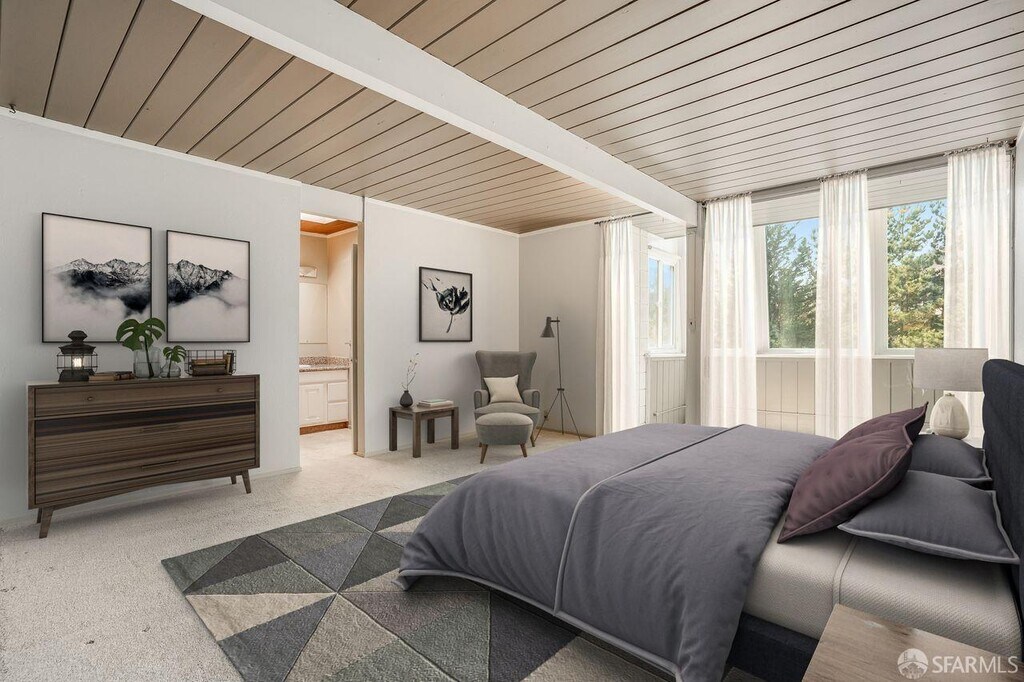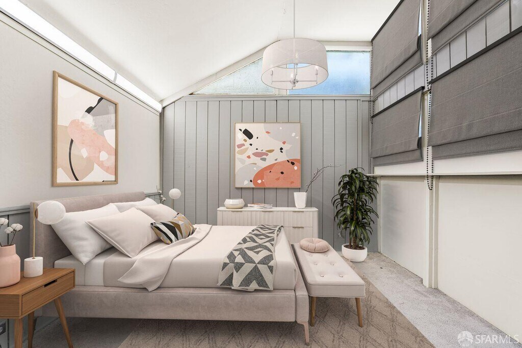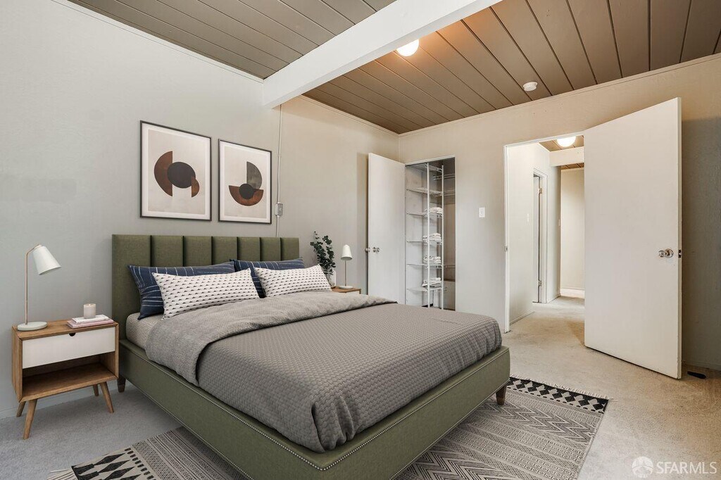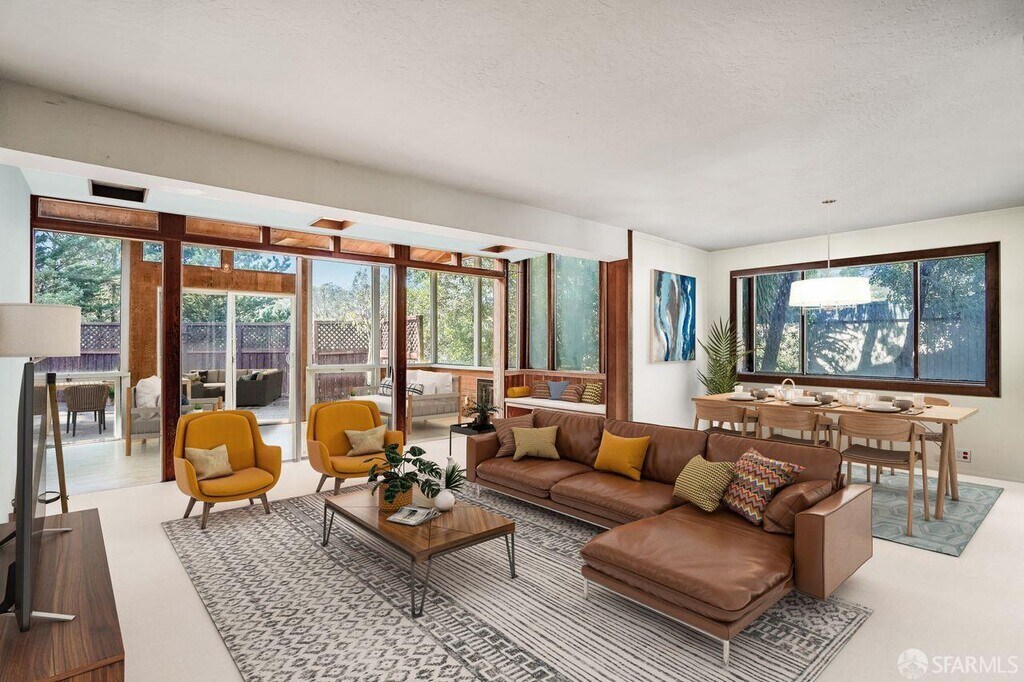Mid-Century five-bedroom Eichler home in Diamond Heights. Indoor outdoor living at its finest. The main level is centered around indoor/outdoor living and features a large living room with fireplace, dining room, fifth bedroom, kitchen with breakfast nook and full bath. The tranquil South-facing garden offers a wood patio and mature vegetation offering seclusion and canyon views. The second level consists of a primary bedroom with en suite bath, walkout balcony and a massive closet with vanity, three additional bedrooms, one guest bath and laundry closet. The home also offers a one-car garage, abundant storage throughout and a courtyard entry. Great opportunity for a true Eichler lover. This is a virtual representation of the property staged with furniture. It is an approximation and not an actual representation of how the property currently looks.
