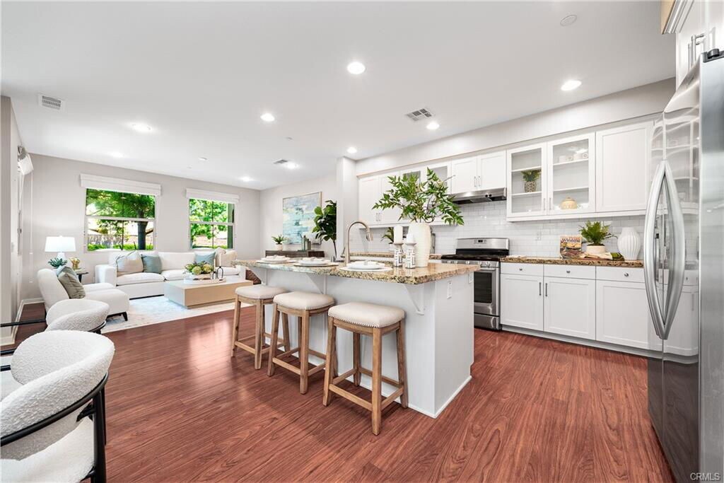 - Welcome to this beautifully maintained end-unit home located in the highly desirable village of Portola Springs, Irvine. Bathed in abundant natural light, this residence offers an inviting open-concept floor plan designed for modern living. The spacious great room seamlessly connects to the dining area and opens to a charming front courtyard—perfect for entertaining or relaxing outdoors. The upgraded kitchen boasts stainless steel appliances, a large center island, granite countertops, tile backsplash, and white shaker cabinets with elegant glass doors. Upstairs features a private primary suite, two generously sized bedrooms, a hallway bath, and a convenient laundry area. The attached two-car garage is equipped with an epoxy-coated floor and overhead storage racks for extra organization. Situated within walking distance to one of Portola Springs’ community centers, residents enjoy easy access to resort-style amenities including pools, spas, sport courts, BBQ areas, playgrounds, and parks. Conveniently close to shopping, dining, and entertainment, this home is also served by the top-rated Irvine Unified School District, including Portola High School. Experience the perfect blend of comfort, style, and convenience in one of Irvine’s most sought-after neighborhoods. Listing provided by: Leanne Tang of Pinnacle Real Estate Group LA State License 2173350 Listing posted by Orange County [SYNDID 4140356 10232025]