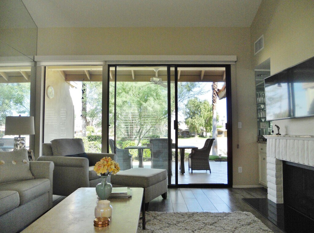 Experience breathtaking golf and lake views from the patio of this beautifully remodeled 2-bedroom plus den that owner has added a bed to,2-bath condo. This stunning home features a cozy fireplace,soaring vaulted ceilings,and porcelain tile that mimics wood grain for a modern touch. Enjoy recessed lighting,ceiling fans,a convenient laundry room,and direct access to the attached garage. The open kitchen is a chef's dream,showcasing granite slab countertops,stainless steel appliances,custom cabinetry,and an elegant backsplash. As an end unit,it benefits from extra windows that flood the space with natural light. Outdoor living is at its finest on the charming patio,perfect for relaxation and entertaining. Centrally located in Palm Desert,Monterey Country Club offers the ideal blend of comfort and convenience. Don't miss out on this incredible opportunity!