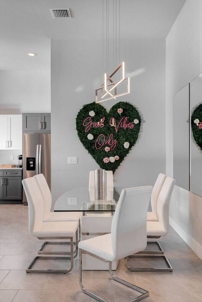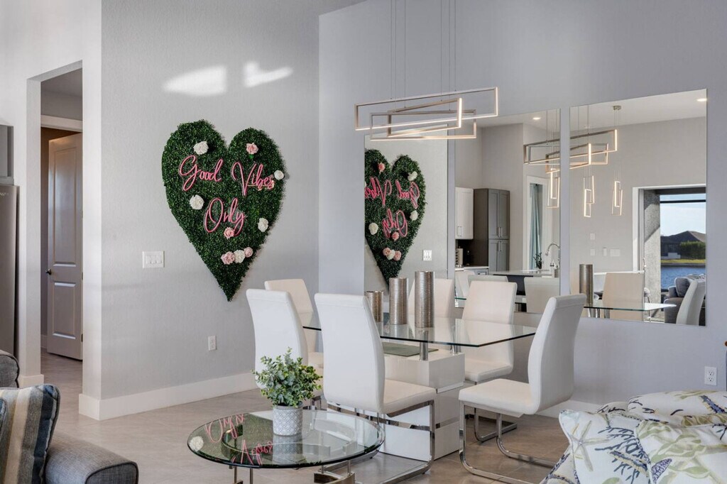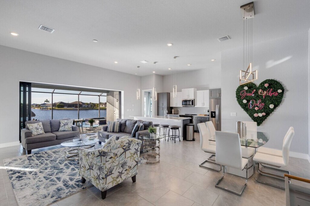 Feel at home in this newly built 5-bedroom modern home in Cape Coral, Florida, where luxury meets tranquility! This one-level home overlooks a heated pool, comfortable patio loungers, a gas grill, and a relaxing in-pool hot tub/spa, offering westward breathtaking views of the canals gulf coast and unforgettable sunsets every evening. This home features two primary suites, both overlooking the water and sunsets. Zero clearance patio sliders allow you to enjoy the Florida life indoors and out. The kitchen island is expansive for easy socializing and preparing meals. For family fun, there is a zone in the garage with darts, ping pong, cornhole, bikes, and more. Keurig and K Cups & Tea are provided for guests' enjoyment. Two pack and plays are available for your little ones. Located in Cape Coral, known for its beautiful canals and proximity to Gulf Coast beaches, this home offers easy access to a variety of outdoor activities, dining options, and shopping destinations. It is directly across from the Coral Oaks golf course and only 35 minutes' drive from RSW airport, and it is nearby to Pine Island. The maximum guest count is 10 allowed on the property. Includes three desks perfect for remote workspaces. [SI]
