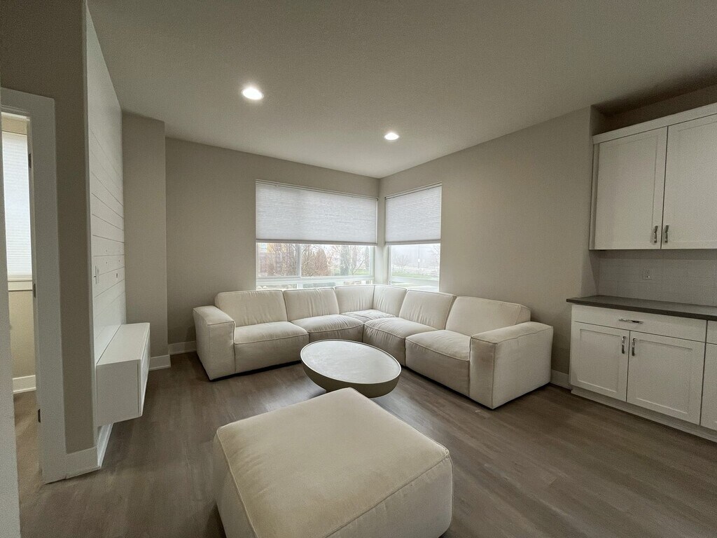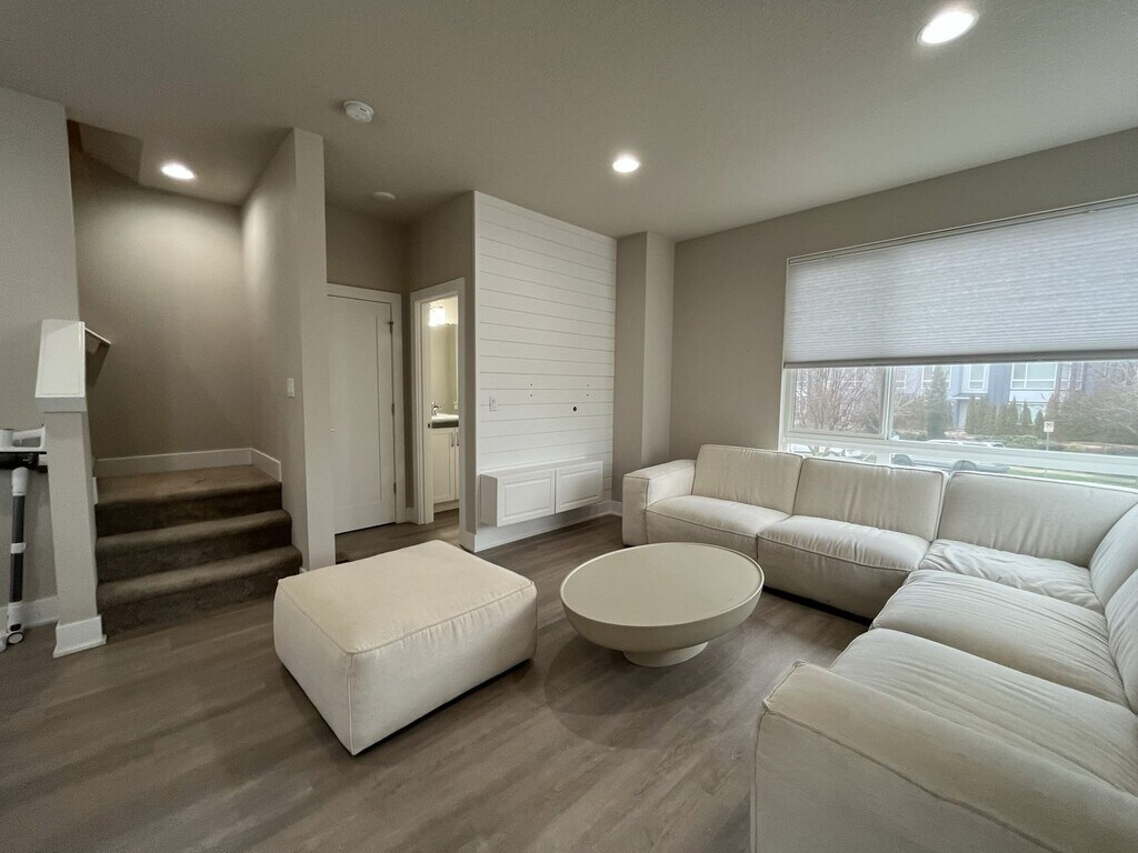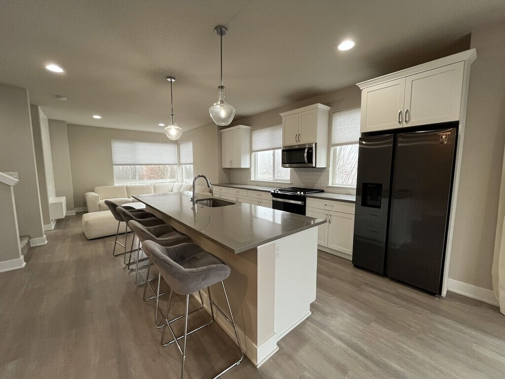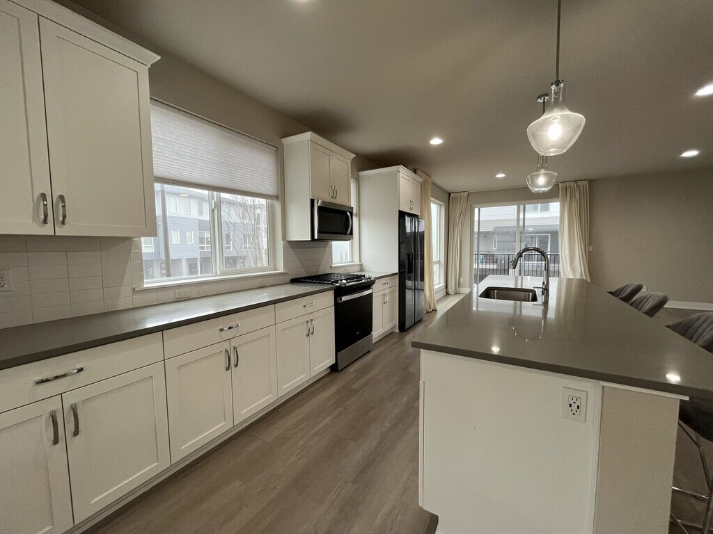 This modern three-bedroom, three-bathroom townhome offers 1,720 square feet of thoughtfully designed living space across three levels and is situated on a true corner lot, providing expansive windows and abundant natural light throughout. Located in a well-maintained community, this end-unit home blends flexibility, contemporary design, and everyday functionality. The ground level offers a welcoming entry area, an oversized single-car or two-car sub-compact garage, and a versatile bonus room. Designed to adapt to your needs, this space is ideal for a home office, gym, creative studio, or quiet retreat. An electric vehicle charger in the garage adds modern convenience. The main living level features open-concept design at its best. The kitchen serves as the centerpiece of the home, complete with a large island offering seating for four, a stainless steel single-basin sink, dishwasher, and generous cabinetry. Along the opposite wall, you’ll find a French-door refrigerator, gas stovetop and oven, mounted microwave, and additional storage. Multiple windows line the kitchen and dining areas, creating a bright and inviting atmosphere throughout the day. The dining area sits between the kitchen and balcony and includes a large window, sliding glass door, and a built-in bookshelf that adds both charm and functionality. The adjacent balcony extends the living space outdoors and includes additional storage—perfect for seasonal items or recreational gear. The spacious living room is framed by large corner windows, offering a comfortable and stylish space for relaxing or entertaining. A half bathroom on this level adds convenience for guests. All three bedrooms are located on the upper level. The primary suite is generously sized and features corner windows, a walk-in closet with built-in shelving, and a private en suite bathroom with a large vanity, matching mirror, and glass-enclosed step-in shower. The second bedroom includes carpeted flooring, a bright window, and a standard closet. The third bedroom stands out with vaulted ceilings, tall windows, and a modern pendant light fixture, creating an airy and distinctive feel. A full bathroom with a tub and shower combination and extended vanity is located between the two secondary bedrooms. A full-size, side-by-side washer and dryer are conveniently located on this floor as well. Wood-vinyl flooring on the first and second levels provides durability and style, while plush carpeting on the stairs and upper level adds comfort. With ducted heating and air conditioning, modern finishes, and multiple flexible living spaces, this home offers a well-balanced layout designed for comfort, productivity, and connection. This townhome combines modern design, thoughtful features, and flexible living options—making it an excellent choice for anyone seeking a polished and comfortable place to call home. Call or Text Our Leasing Agent to schedule a showing! English Speaking Spanish Speaking YouTube Link: Visit our website to apply and view other homes we have available! Do you need property management services? Maximize your income and cut your costs!