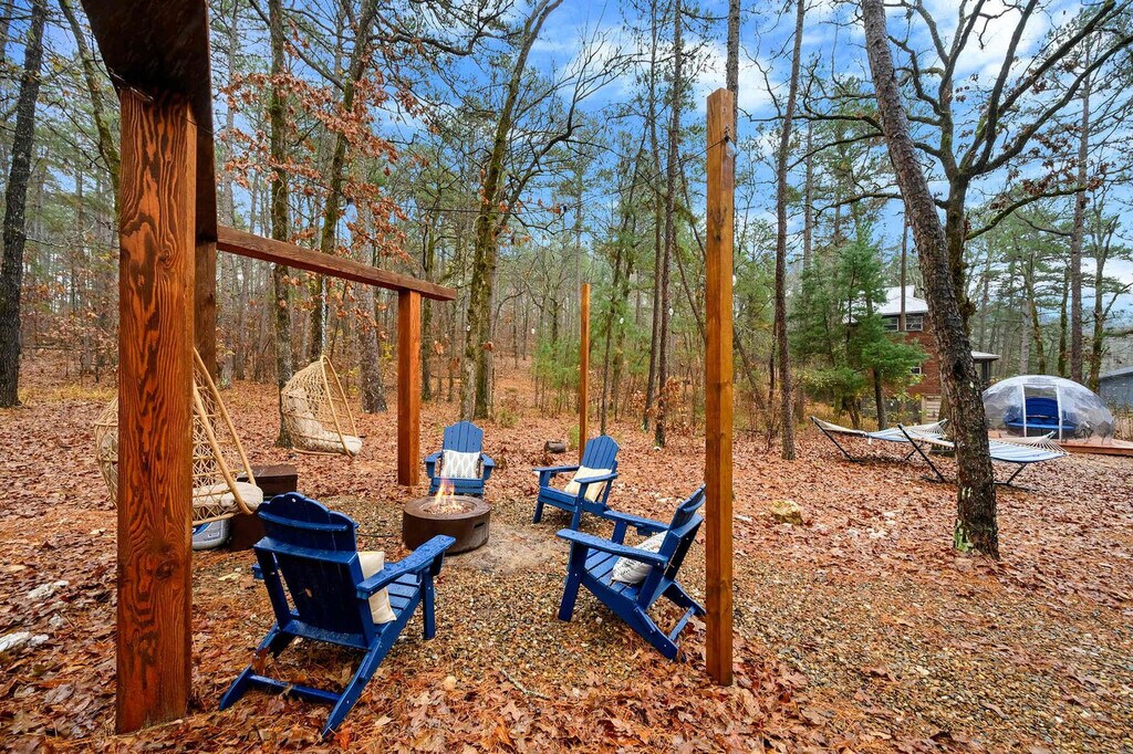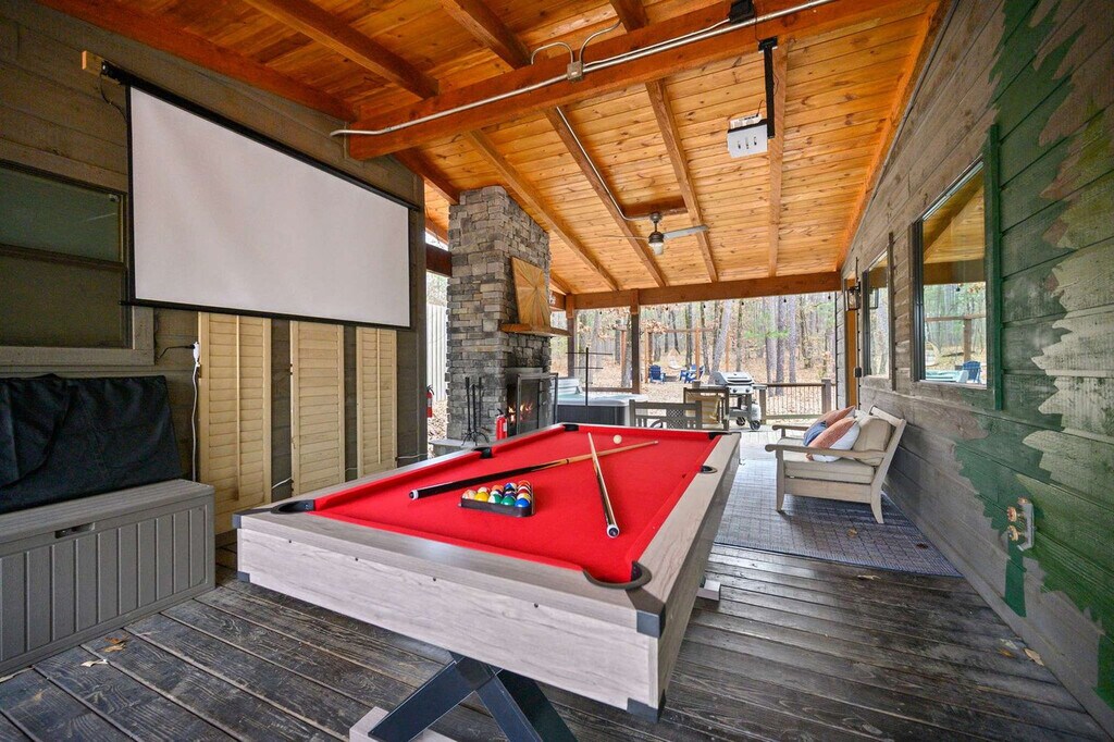 Feel at home in this 2-bedroom luxury home in Broken Bow, OK. This home is in a prime location and has everything you need for an amazing vacation. This serene cabin backs directly up to the breathtaking Wachita National Forest, giving you 1,000 acres of uninterrupted nature right in your backyard. The home features a fully stocked chef’s kitchen with high-end appliances, a large refrigerator, ample cabinetry, and an island with high seating, as well as a Cuisinart 3-in-1 coffee maker. The living room includes a smart TV, a large leathered sofa, an indoor fireplace, expansive windows, and a high ceiling with an open floor concept directing to the kitchen and dining area. Enjoy amenities such as a sauna, hot tub, fire pit, grill, stargazing bubble, white screen and projector, outdoor fireplace, pool table, and patio with ample seating. For families, a Pack N Play and high chair are available. Guests have the option to arrange services with a traveling massage therapist who serves the area. Located in a serene and picturesque area of Broken Bow, this property is surrounded by lush forests, rolling hills, and pristine waterways. Beavers Bend State Park is 7–9 miles away, and Grateful Head Pizza Oven & Tap Room is 2–3 miles away. Outdoor enthusiasts will love the abundance of recreational opportunities nearby, including Broken Bow Lake for boating, fishing, and swimming, and the Beavers Bend State Park trails for hiking, horseback riding, and wildlife spotting. Local restaurants, cafés, and shops are just a short drive away. Check-in is at 4pm and check-out is at 10am. Pets are not allowed. No parties are allowed, and violations may result in immediate termination of the stay. Guests must be 21 years or older to book this property. The bonus wellness room is ideal for in-cabin spa treatments, yoga sessions, or as a dedicated workspace for visiting wellness professionals. [SI]