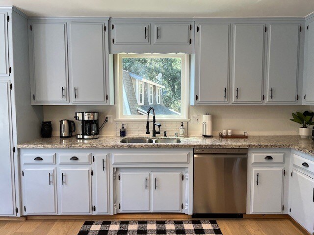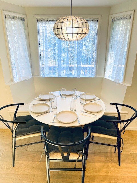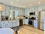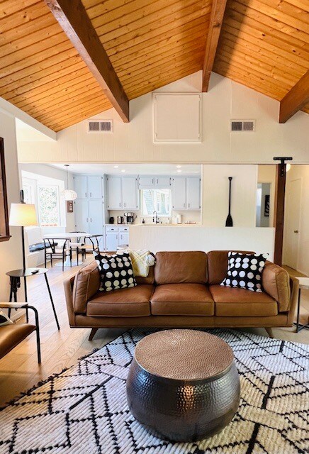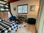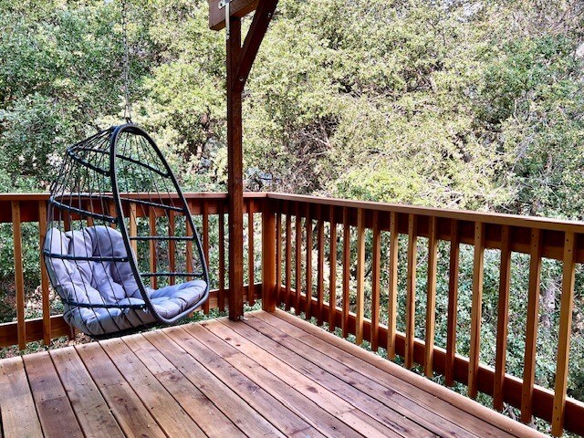 This recently renovated, stylishly decorated, fully furnished house is move-in ready. The spacious home enjoys a cozy wood-burning fireplace in the living room- a well-appointed kitchen- roomy bedrooms- and spa-like bathrooms. Completely renovated with quality materials from top to bottom: all new furnishings, new wood decks on all three levels, and new appliances including a washer/dryer. Level entry parking deck with apron steps from the front door allows parking for four cars. The home is set amongst the tree tops with forest views and Lake Gregory just down the hill. If you're looking for a more relaxing pace in a cozy modern space, you've found it. Get closer to nature while enjoying four-seasons living. Enjoy spring and fall around the public lake walking path- summer swimming and boat rental- and snowy tree-top winter views and hikes. Come for a month, come for six months, our mountain escape is ready for you. Pet and cleaning fee required. Dogs welcome. Close to Lake Arrowhead and not far from Big Bear.