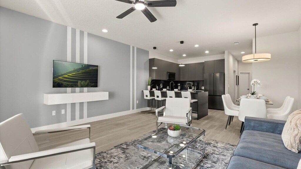 Feel at home in this 3-bedroom, 3-bathroom townhome at Serenity at Silver Creek. This 1,500 sq ft home offers airy living space, a private pool, an upstairs living room with games, and a themed kids’ room. This home features an open-concept living space with a large Smart TV, a fully equipped kitchen with stainless steel appliances, a dining area for 6 plus breakfast bar seating, and an in-unit washer and dryer with detergent provided. Enjoy central air conditioning and heating controlled from the upstairs thermostat. There are 5 Smart TVs throughout, high-speed Wi-Fi, complimentary pool towels and linens, and cleaning supplies, a broom, mop and vacuum provided. Pool heating is available for $35 per night with a 2-night minimum, requiring at least 24 hours’ notice to arrange heating. A one-time refill for the BBQ propane tank is available for $55. Mid-stay cleaning is offered for reservations over 3 days for an extra fee and must be booked in advance. A Pack 'N Play Crib and a Highchair are available for a one-time fee of $40 each. Serenity at Silver Creek is a peaceful, eco-conscious community tucked away in the rolling hills of Clermont, Florida, near local shops, restaurants, and grocery stores. Walt Disney World Resort is just 17 miles away, Universal Studios Florida is approximately 28 miles from the property, and SeaWorld® & Aquatica® are approximately 20 miles away. For those who love the outdoors, Lake Louisa State Park is close by and features hiking, biking, and kayaking opportunities. Parties, events, and smoking/vaping of any kind are prohibited in or around the property and risk a fine of $150. Late departures will result in a fine of $150 for each additional hour the property cannot be accessed for turnover. Outside of service animals, pets are not permitted at this property. Any evidence of pets will result in a fine. Quiet hours are between 10:00 p.m. and 7:00 a.m. [SI]