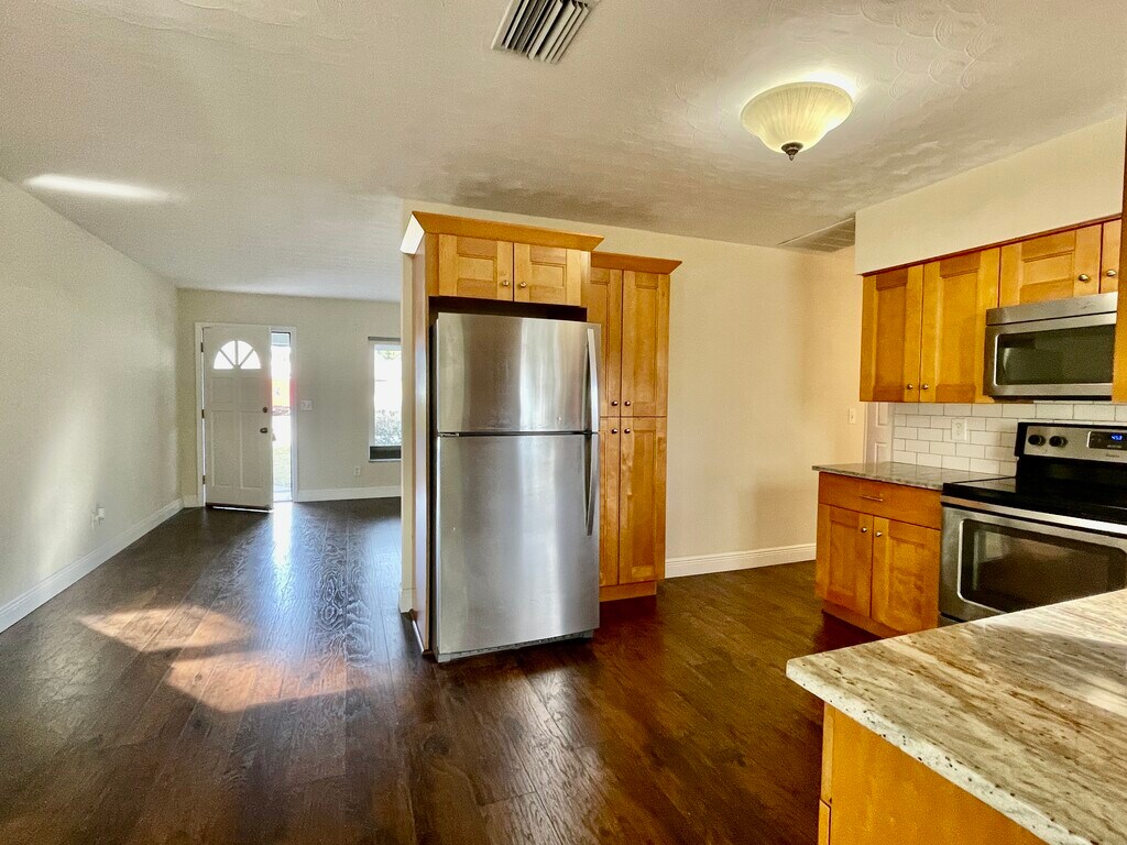 Enjoying living in this beautifully maintained, freshly painted 2-bedroom/2-bathroom + Den/Office house with a big fenced back yard. The landlords just bought this home today (Jan 12th) and are already upgrading it beyond what you can see in the photos. There will be a painted garage floor and upscale modern white blinds on the windows. The home is very spacious and well laid out with lots of windows bringing a lot of natural daylight. The large kitchen has lots of storage including a pantry. The large bonus room has windows on three sides and could be used as an office, playroom or dining room overlooking the back yard. The home has been renovated with great taste. For instance, in the bathroom, while leaving the original mid-century tile in place, new granite counters were installed with flecks of the same color, tying it all tastefully together. Presently, there is no washer or dryer in the garage but the landlords are willing to put one in for you. This will be a very well-maintainted home, moving forward with great landlords. The neighborhood is very quiet and safe-feeling.