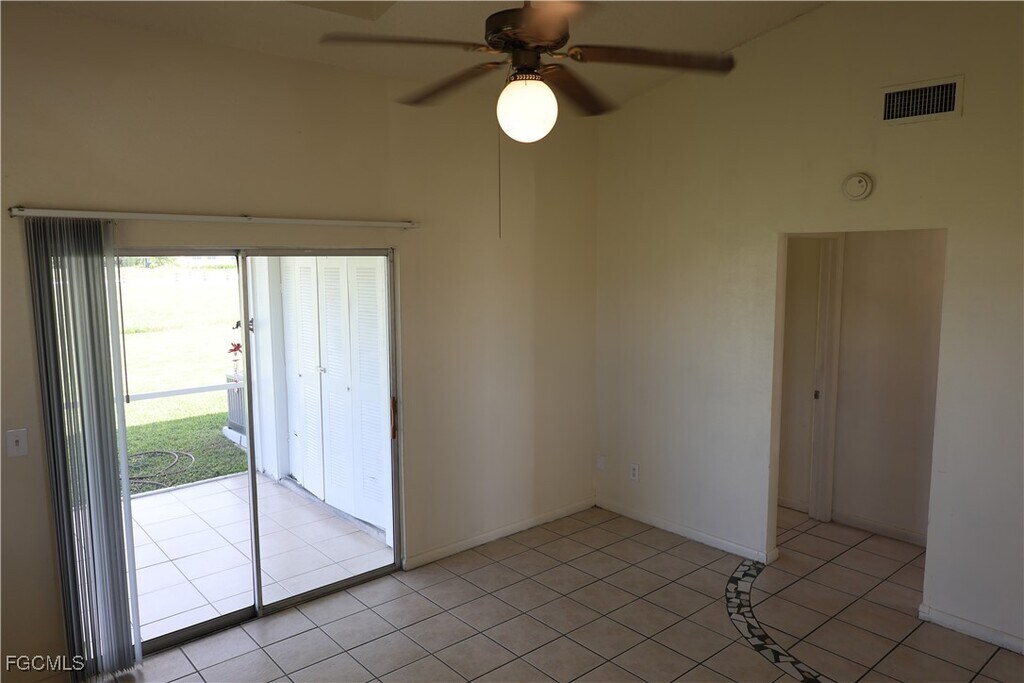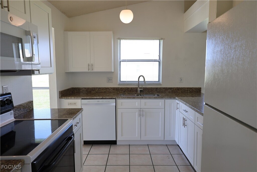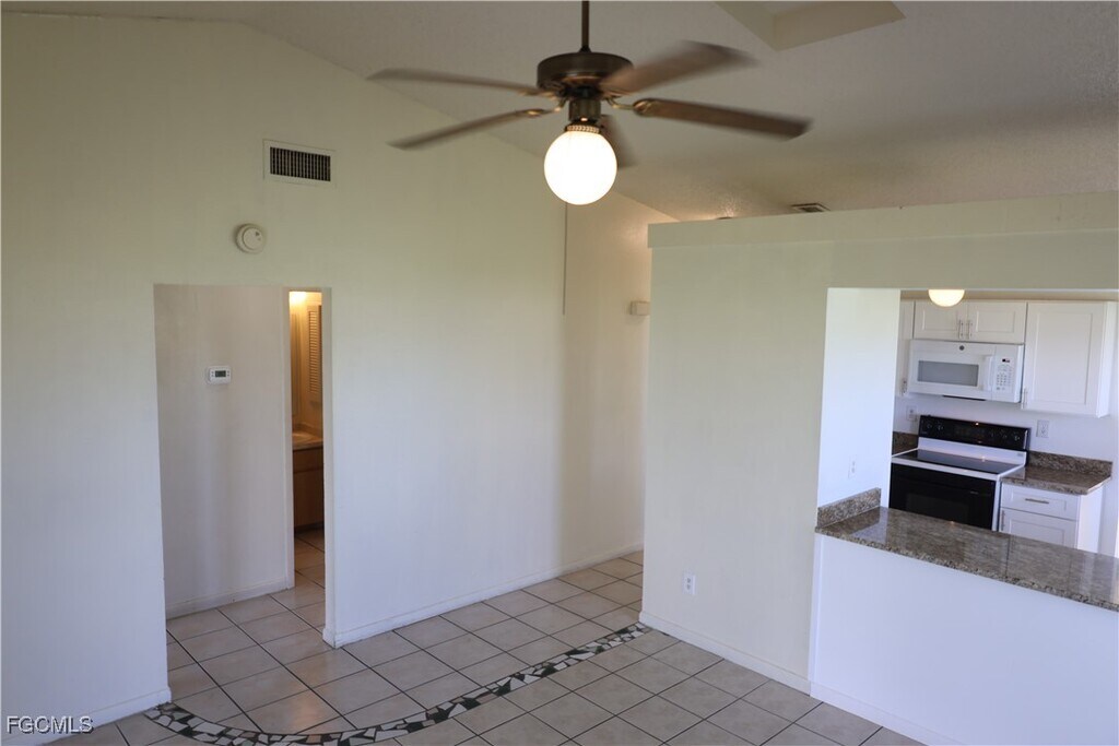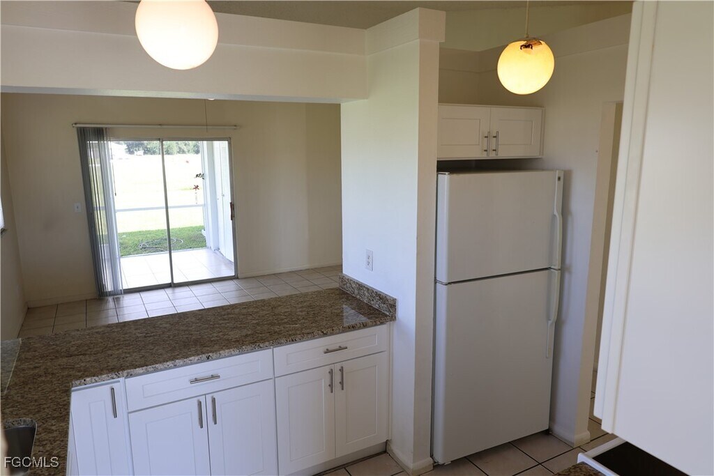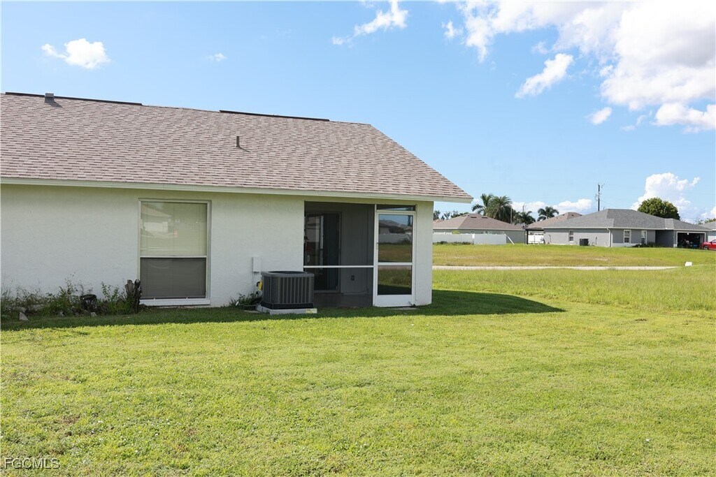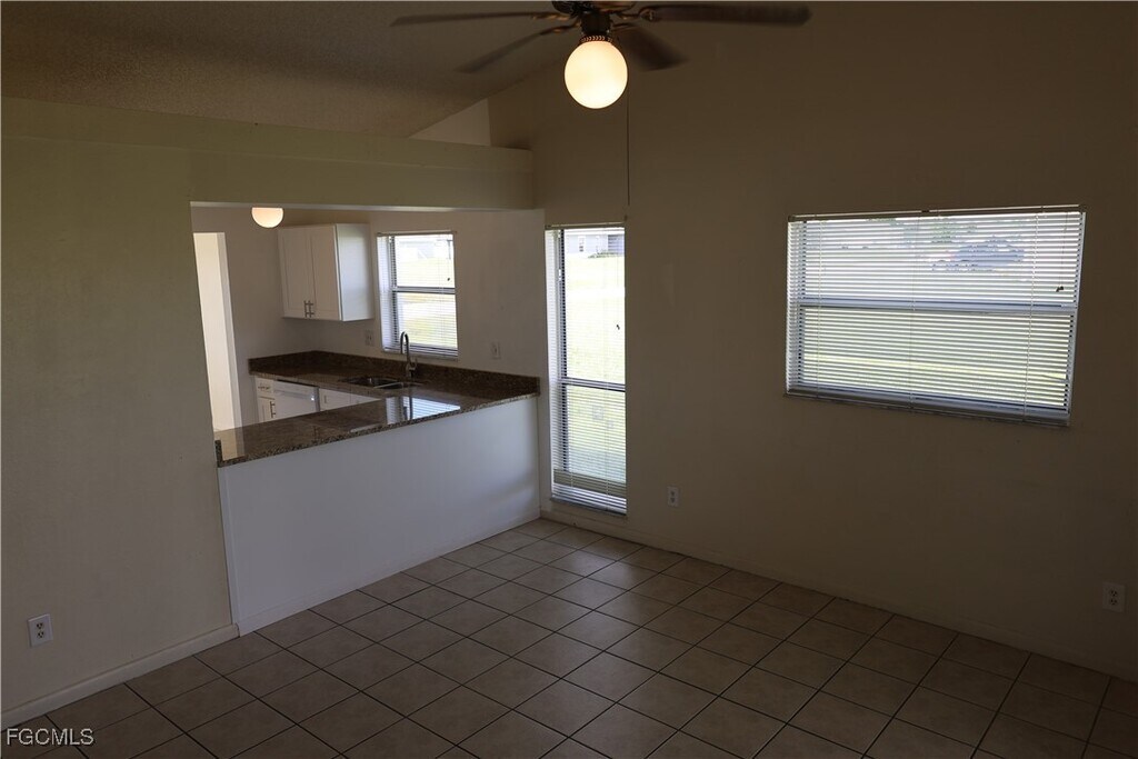 2 bedroom 2 bath duplex is conveniently located in NE Cape near Andalusia & Diplomat. Be welcomed by the large screened entry. Brand new wrap-around kitchen with granite counters opens to the great room for family conversations. Enjoy the bonus room however you choose.... office,den,exercise or additional entertainment room. Primary bedroom features two closets & en suite bathroom .New A/C & new water heater for efficiency with electric. The unit is all tile including the lanai. Vaulted ceilings provide a spacious,open feeling Private laundry located on lanai. Nice open back yard. Easy to see!
