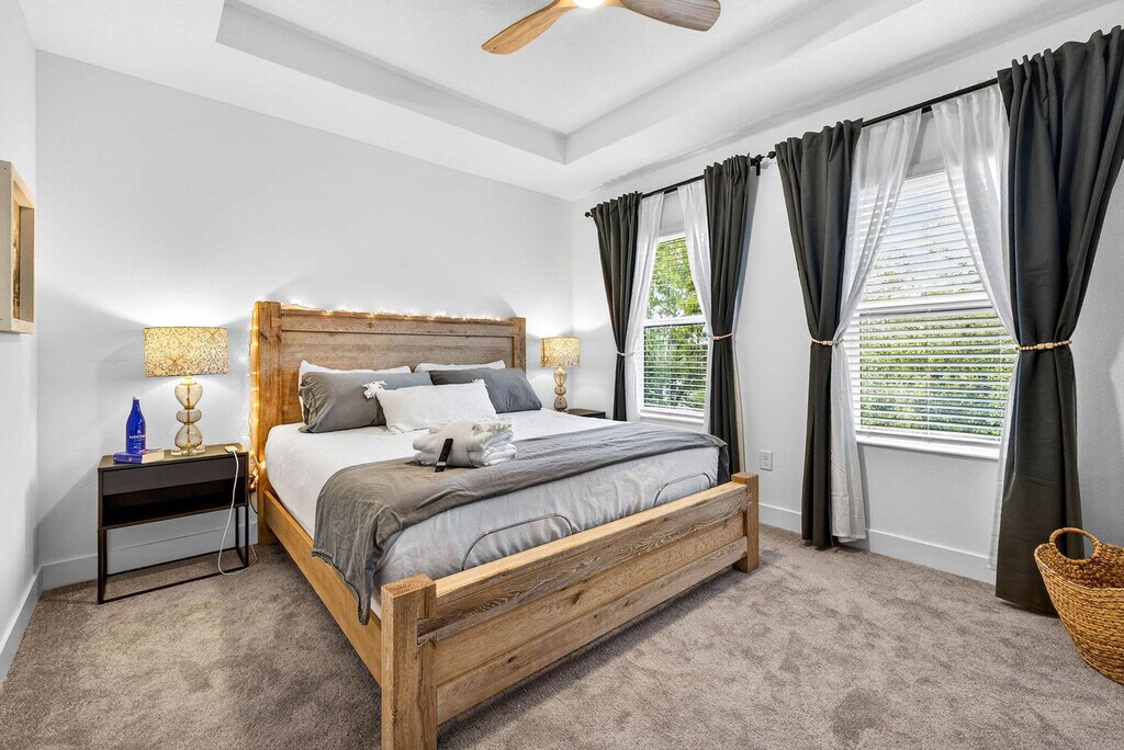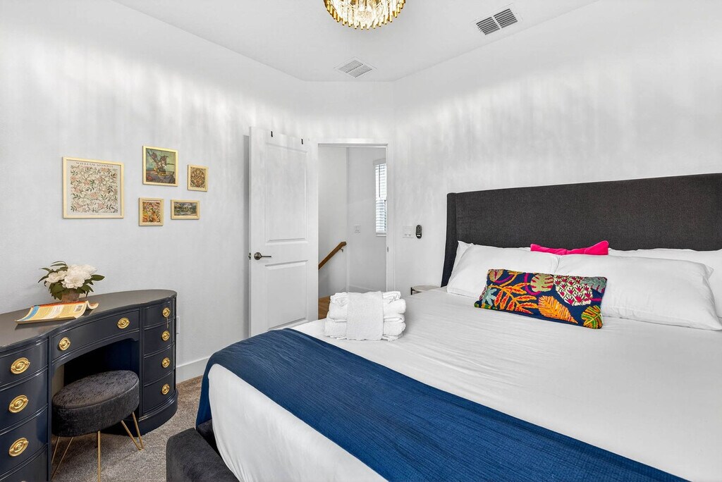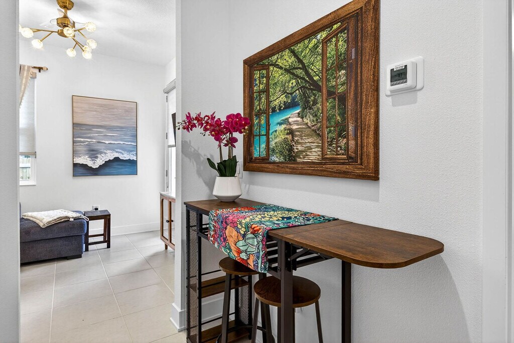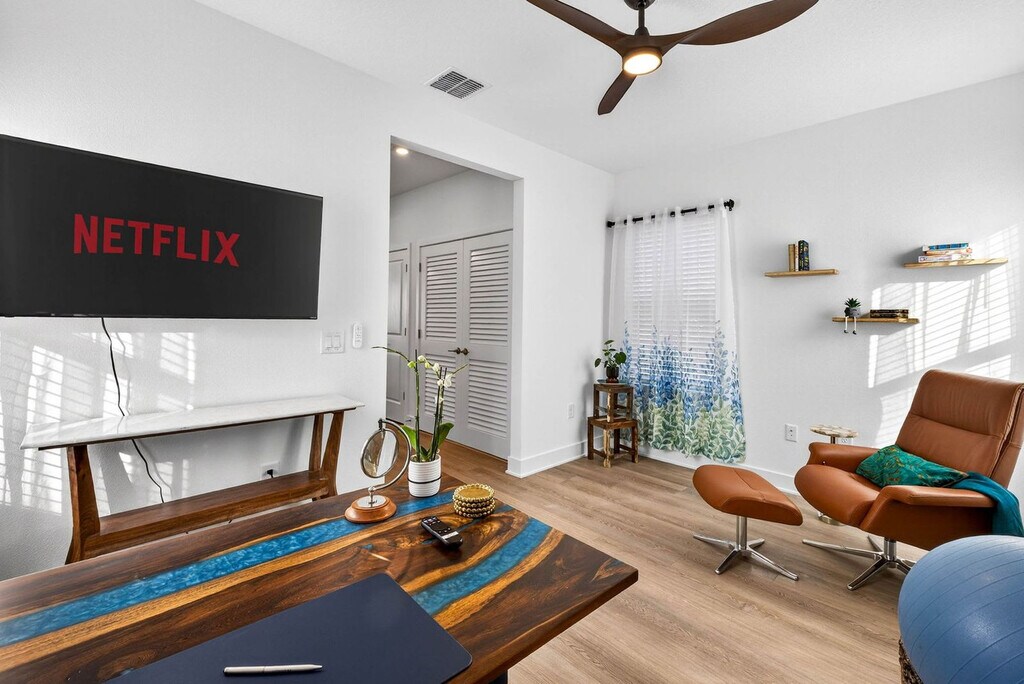 Welcome to The Hibiscus House, a 3-story home designed for groups, where you'll feel at home. This property solves the biggest friction point of group travel: privacy. This "Life-Ready Basecamp" is designed for productivity and comfort across three vertical levels. It features two full kitchens and two separate living areas for ultimate privacy. The chef’s kitchen has stainless steel appliances, dark modern cabinetry, and ample counter space. The communal dining area features a solid wood table with high-capacity bench seating for meals. The living room has a deep, oversized sectional and electric fireplace console. There is a full-size washer and dryer for your convenience. Additional amenities include keyless entry and thermostat control, as well as high-speed Wi-Fi throughout. Pets are welcome with pre-approval. A fee of $100 per pet per stay, or per month for stays exceeding 28 days, is applicable. Permits for professional video or photo shoots can be requested for a fee. The Hibiscus House is located in West Tampa, a historic neighborhood rapidly transforming into the city's next urban hub. You are on the front lines of the "West River" expansion, a dynamic district mixing authentic local culture with massive modern development. Armature Works, a premier waterfront food hall, is a 5-minute drive away, as is Rick’s on the River, an iconic local marina bar & grill. Downtown Tampa and Midtown Tampa are also a 5-minute drive. St. Joseph’s Hospital and Raymond James Stadium are 5 minutes away, the University of Tampa and Downtown are 7 minutes away, and Tampa General Hospital (TGH) and Hyde Park Village are 10 minutes away. Tampa International Airport (TPA) is 12 minutes away. Ride-sharing services are fast and affordable due to the centrally located location, and there is easy access to I-275 and Columbus Drive bridges. Guests must be comfortable climbing stairs to access the main living areas and bedrooms. As a high-demand development zone, you may see construction nearby. Quiet hours are from 8 PM-8 AM. Smoking violations or the presence of a smoke smell may incur a $250 remediation fee minimum. A fee of $50 will be charged for late check-outs past 10 AM. Disabling or removing security devices or any technology results in a fee or removal from the home without a refund. If the AC unit is set lower than 68 degrees, leading to a technician call-out, additional fees may be incurred. Includes a dedicated, enclosed workspace right off the main living area. It features a desk, ergonomic task chair, leather reading lounge, and wall-mounted smart TV. [SI]