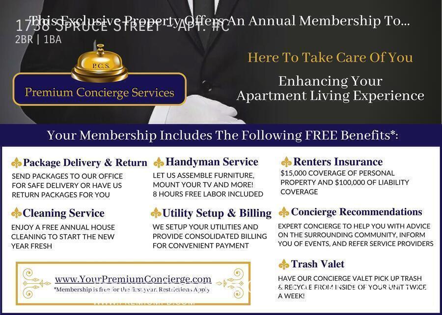 There is currently a 2 Bed 1 Bath Apartment for rent with 605 listed at 1738 Spruce St. It is Available June 1, 2026.