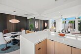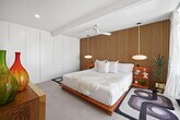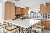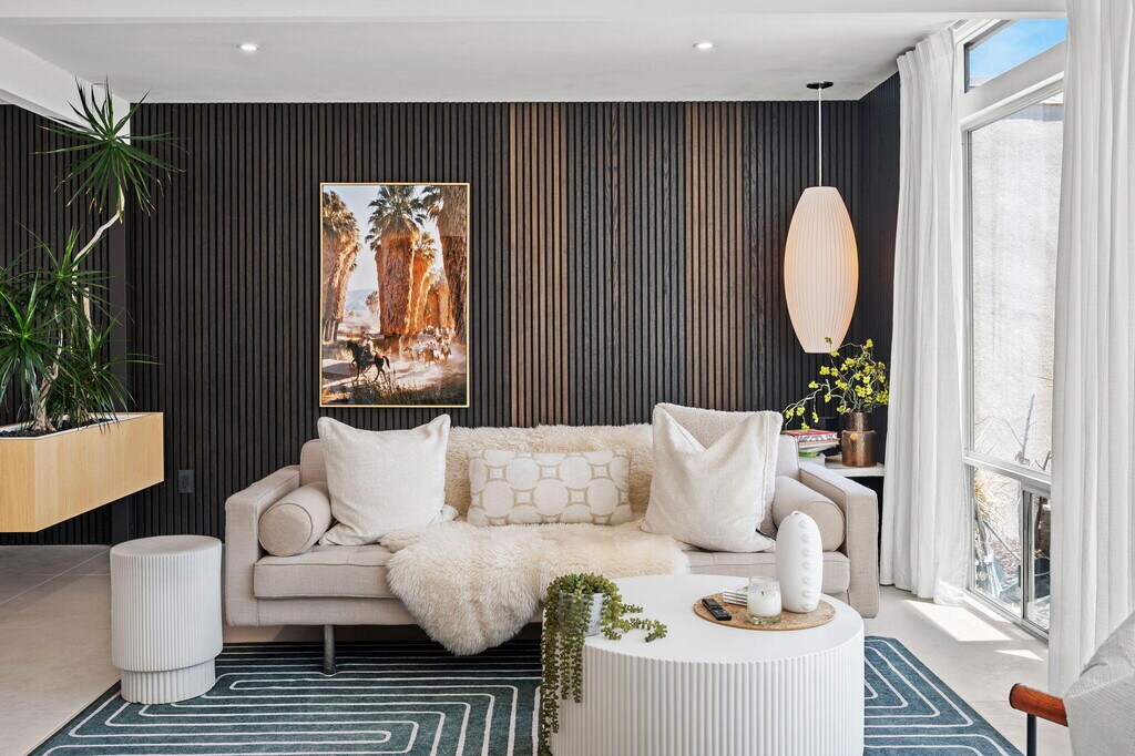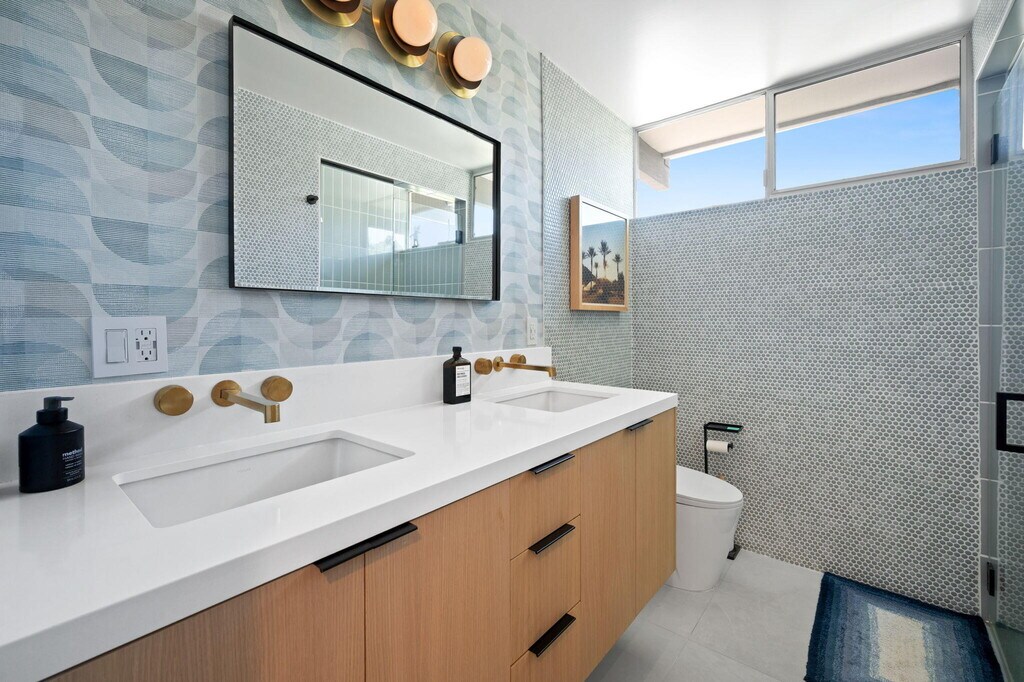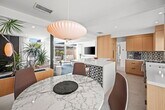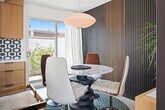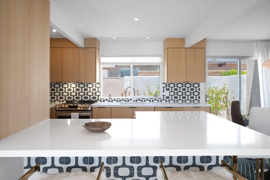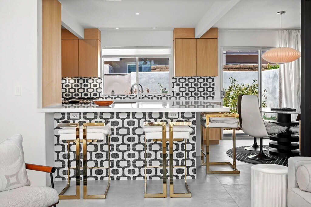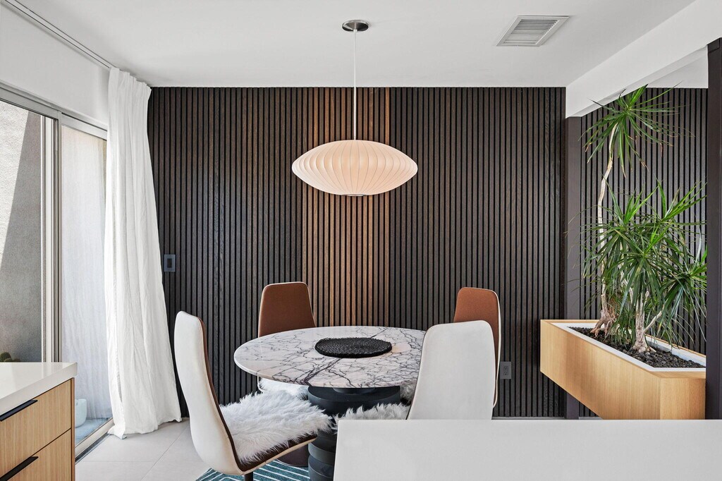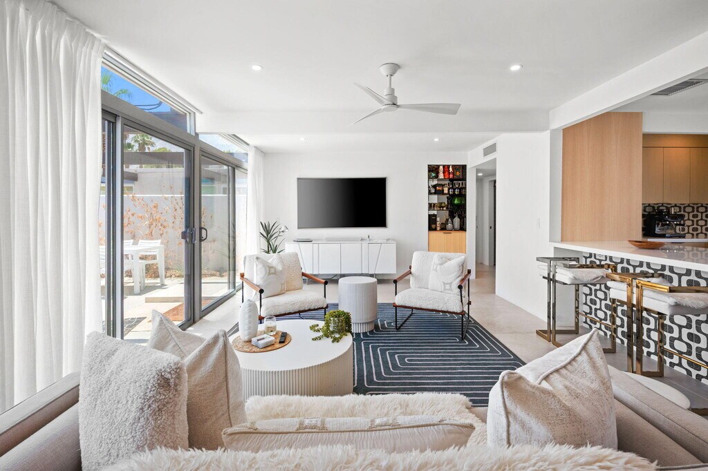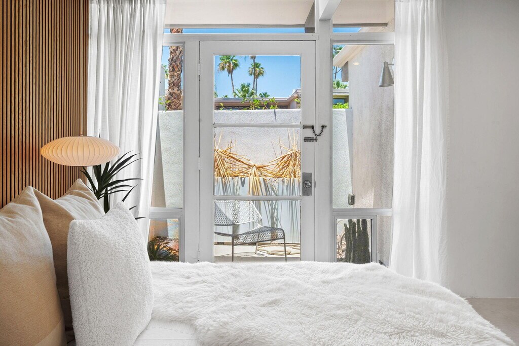 1740 N Via Miraleste is a striking mid-century modern condo reimagined with stunning contemporary flair. Featured during the 2024 Modernism Week,this show-stopping home instantly captured attention with its thoughtful design and high-end finishes. This hidden gem has been completely renovated from the ground up,with the transformation completed in December 2023. Every system has been updated for peace of mind including newer plumbing,electrical,ductwork,double-pane windows and sliders,a newer electrical panel,tankless water heater,and a newer HVAC unit. Step inside to find a sophisticated blend of clean modern lines and timeless mid-century character. Highlights include custom acoustic wood wall treatments,a one-of-a-kind floating planter,paneled high-end appliances,and a sleek induction cooktop. Thoughtful soundproofing in the walls and ceilings offers serenity and privacy throughout the home. The bathrooms are outfitted with luxurious Kohler 'Components' fixtures and wall-mounted faucets,while the kitchen and baths are finished with custom rift white oak cabinetry. Additional design toucheslike George Nelson lighting,a bronze mirrored bar,and playful penny tile accentsadd a sense of authenticity and style. The open floor plan is bathed in natural light,with three patios that extend your living space outdoors and capture the desert's indoor-outdoor lifestyle. Enjoy resort-style amenities including two community pools,a spa,and breathtaking views of Mt. San Jacinto. Offered turnkey furnished,this residence is a rare blend of architectural pedigree and modern luxuryready to enjoy or showcase from day one.