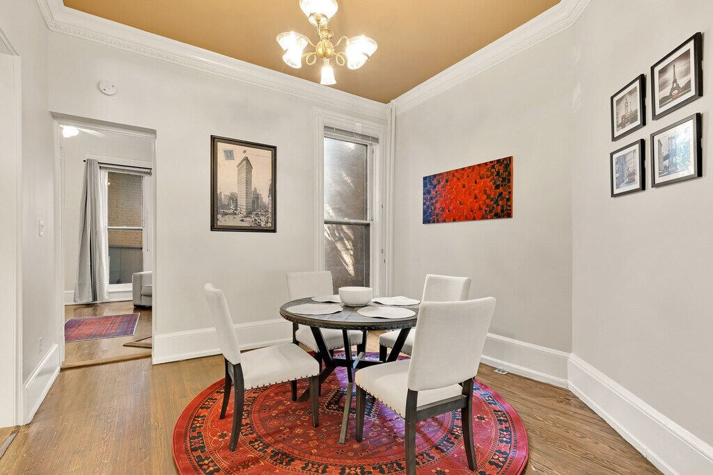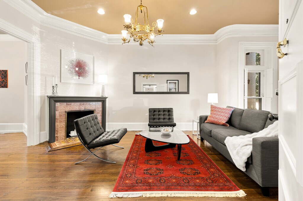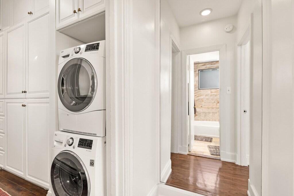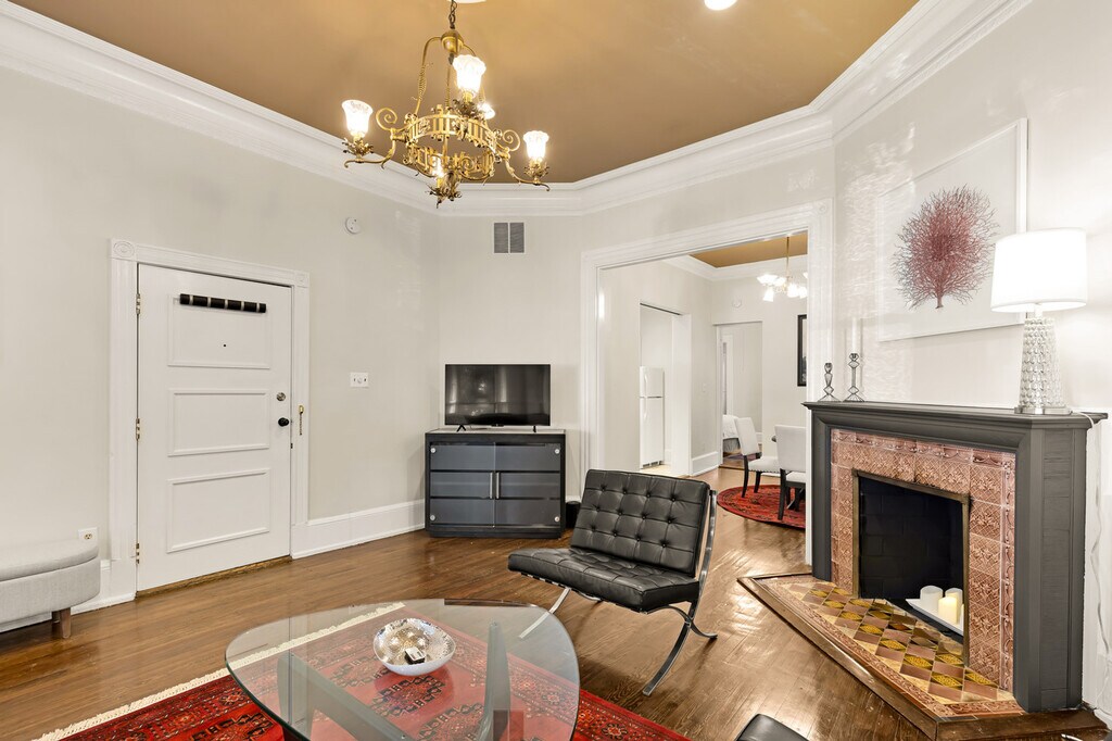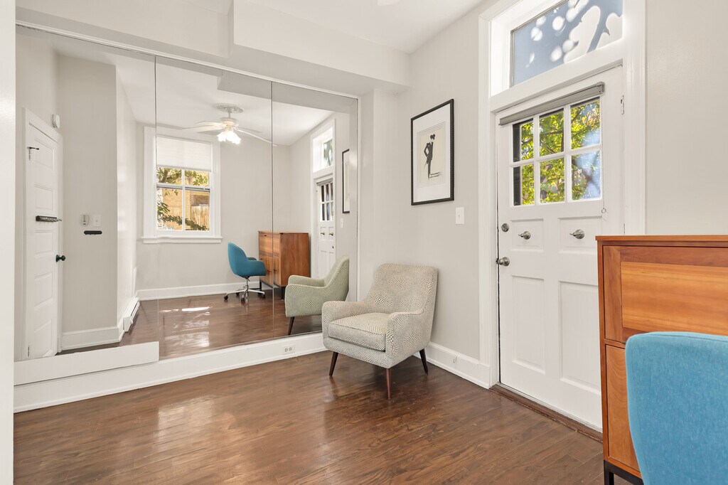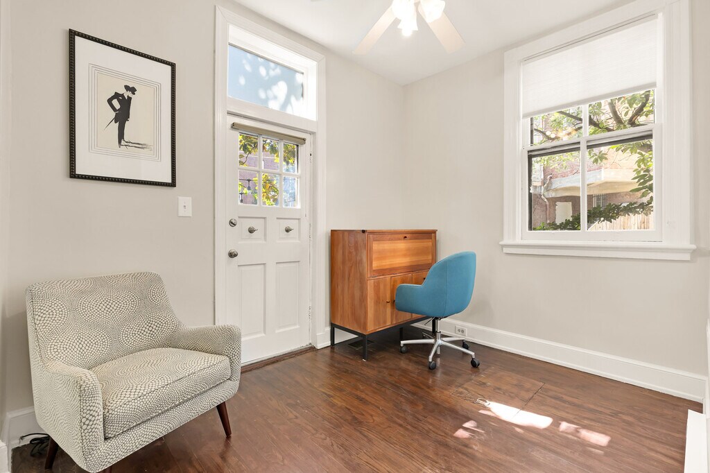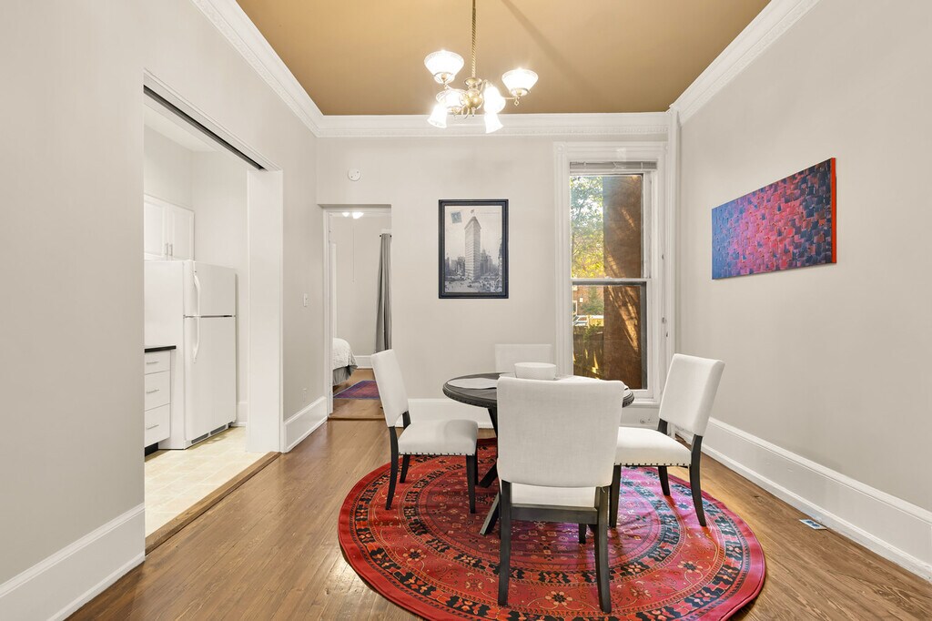 Feel at home in this fully furnished 1-bedroom apartment (with a second room that can be used as a second bedroom, office, or home gym) in a historic D.C. rowhome. This space has been updated to include modern amenities, including an in-unit washer/dryer, built-in storage and closet space, and double glazed windows to reduce noise and keep the space warm through winter. The apartment benefits from a very large living space with a working fireplace, as well as a separate dining room, small but functional kitchen, large main bedroom with a working fireplace, closet built-ins as well as an additional storage closet, bathroom with a tub and marble tiling, and a second bedroom at the back which opens onto the private patio. Period features include 13-foot ceilings with original crown molding, original and well-maintained wood floors throughout, an original pocket door running the length of the kitchen, and charming vintage light fixtures original to the home. A reserved off-street parking spot is available. Outside you have a private patio space shaded by a large magnolia and surrounded by a garden area. The second bedroom at the back which opens onto the private patio makes the perfect guest space, home office, or home gym. Parking is available for an additional $10 per day [SI]
