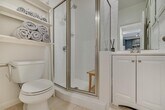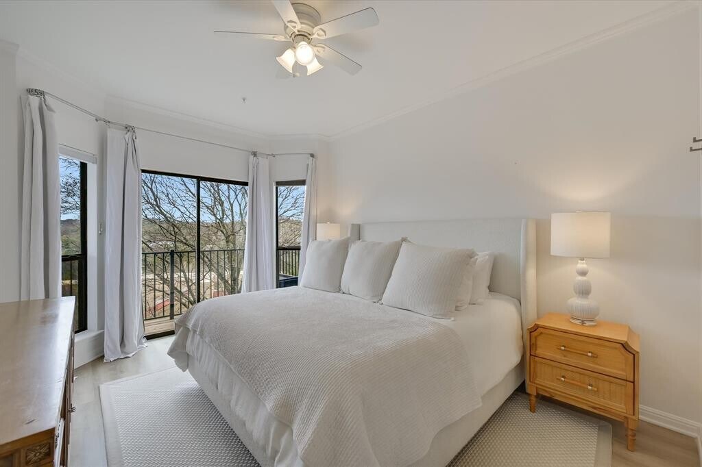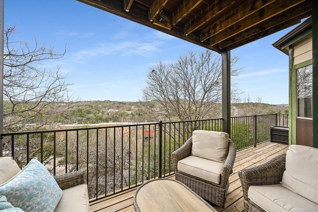 Tucked beside the rolling hills of the Barton Creek greenbelt, this light filled condo offers a rare blend of clean design and everyday comfort in an amazing central Austin location. Inside, white walls, crown molding, and engineered wood floors create a crisp, cohesive backdrop throughout. The kitchen introduces a cool, modern tone with slate gray cabinetry, white quartz countertops, and a subtly shimmering tile backsplash. A charming decorative window above the sink brings in natural light, while stainless steel appliances including an electric range, microwave, dishwasher, and refrigerator complete the space. The open layout flows effortlessly into the dining and living areas, creating an easy rhythm for both entertaining and quiet evenings at home. The living room feels warm and inviting with tranquil preserve views and a cozy gas fireplace. A built in wet bar with extra storage offers the perfect opportunity to create a stylish bar or coffee station. The large balcony becomes an extension of the living space, overlooking the iconic greenbelt and offering the perfect setting for morning coffee or sunset relaxation. The primary suite is minimal and serene, featuring a bay window overlooking the greenery with direct access to the spacious balcony. The ensuite bath includes dual sinks, light gray cabinetry, quartz countertops, and ample storage. A second bedroom with crown molding, engineered wood floors, and a ceiling fan provides flexibility for guests or a home office. The secondary bath is finished with white tile and a walk in shower. Community amenities include a pool and hot tub nestled among mature trees. Just steps from the Spyglass Trailhead at Barton Creek Greenbelt and minutes from Zilker Park and Barton Springs Pool, this home invites you to begin and end each day grounded in nature while enjoying the ease and low maintenance of condo living. MLS ID 7709989