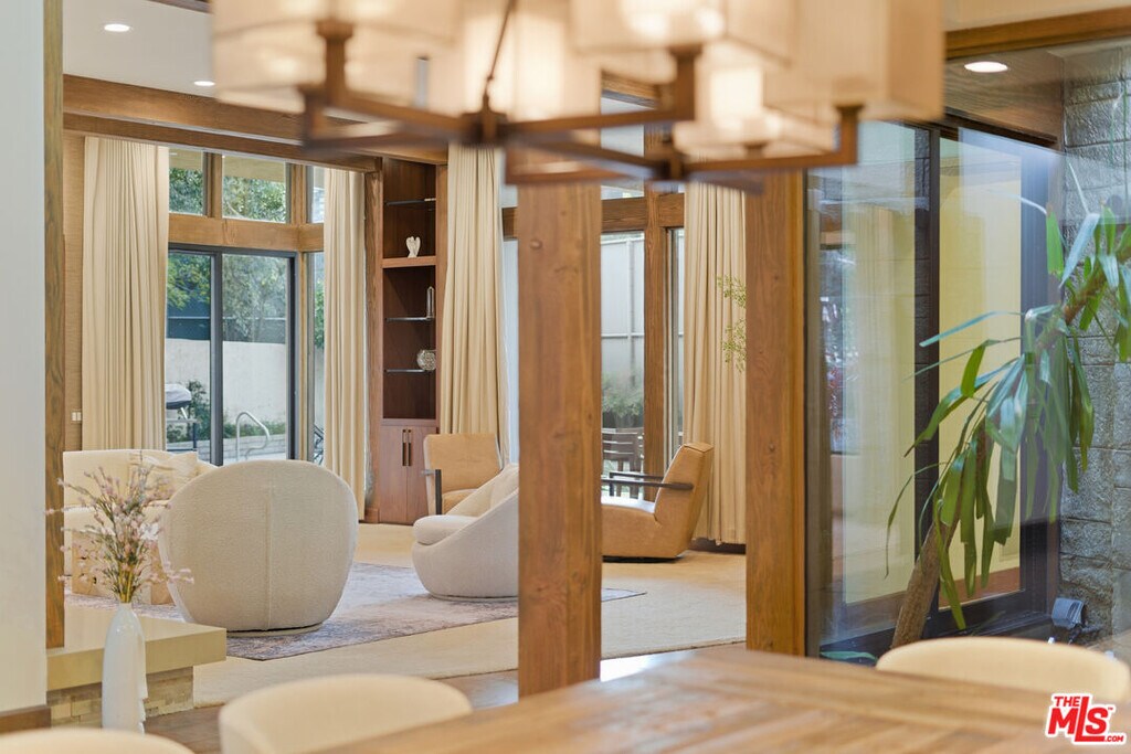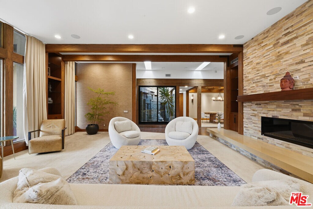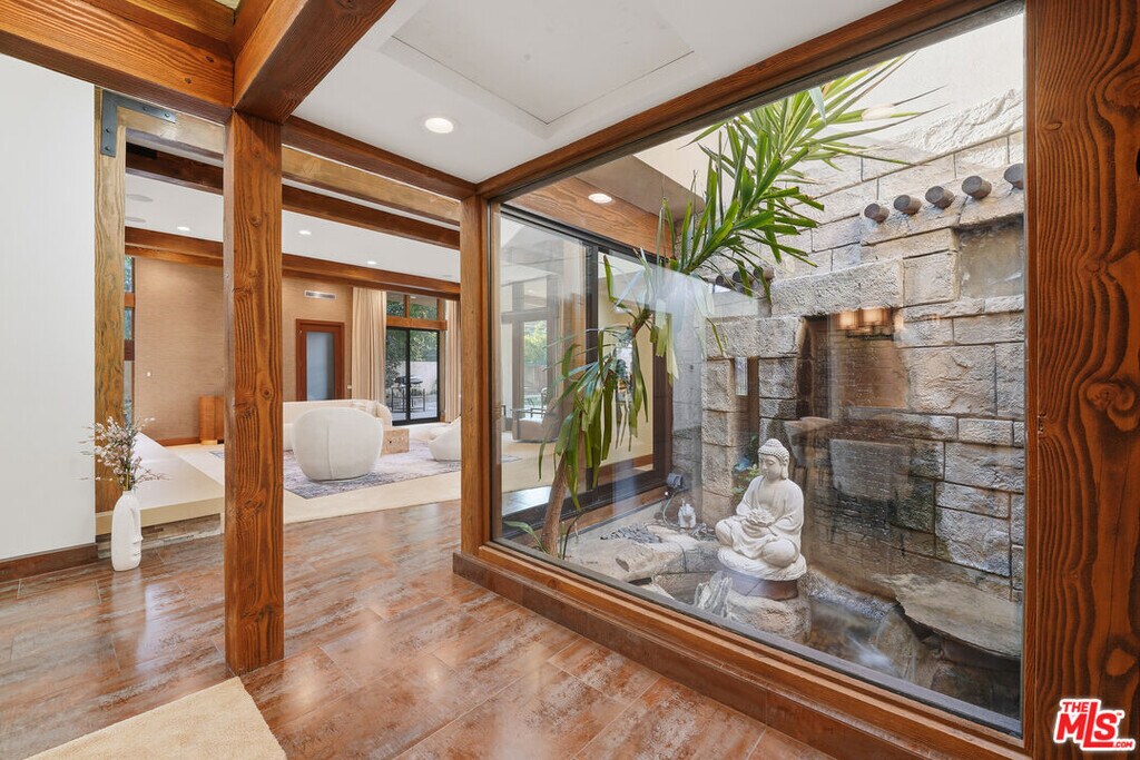 Welcome to a rare architectural masterpiece in the heart of prestigious Amestoy Estates. Rebuilt in 2014, this single-story mid-century modern estate blends timeless design with today's most refined luxury, offering an unparalleled living experience on a private cul-de-sac. Spanning approximately 3,835 square feet, this four-bedroom, three-and-a-half-bath residence is a true showpiece of craftsmanship and intention. Exposed wood beams, clerestory windows, skylights, coffered ceilings, and exquisite inlaid wood details create a warm yet sophisticated atmosphere, while stacked stone facades and designer lighting elevate every space. At the heart of the home, the great room flows effortlessly into a stunning open-air atrium with cascading waterfalls and lush greenery. A serene, resort-style focal point that blurs the line between indoor and outdoor living. Custom built-in cabinetry, stone slab countertops, and heated floors reflect a level of quality rarely found. The gourmet kitchen is a chef's dream, featuring premium Thermador appliances, a dual-oven gas range with custom hood, two wall ovens, built-in refrigerator and dishwasher, walk-in pantry, and elegant finishes ideal for both entertaining and everyday living. A sophisticated wine bar completes the experience. The primary suite is a private sanctuary with its own fireplace, spa-inspired bath with jetted soaking tub and steam shower, and luxurious finishes throughout. Three additional bedrooms offer walk-in closets with cedar paneling and automated lighting, providing both beauty and function. Modern comforts include solar panels, a whole-house water filtration system, dual tankless water heaters, dual HVAC systems, a dedicated utility room, and a three-car garage with epoxy flooring and custom storage cabinetry. Step outside to your private resort-style backyard, where you will find a full tennis court alongside a sparkling pool perfect for both active living and elegant entertaining. This is not simply a home, it is a statement of lifestyle, design, and distinction. A one-of-a-kind opportunity in one of Encino's most coveted neighborhoods. MLS# 26654703