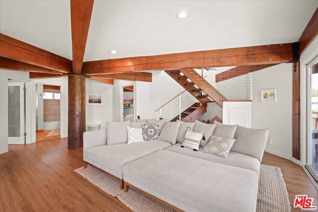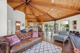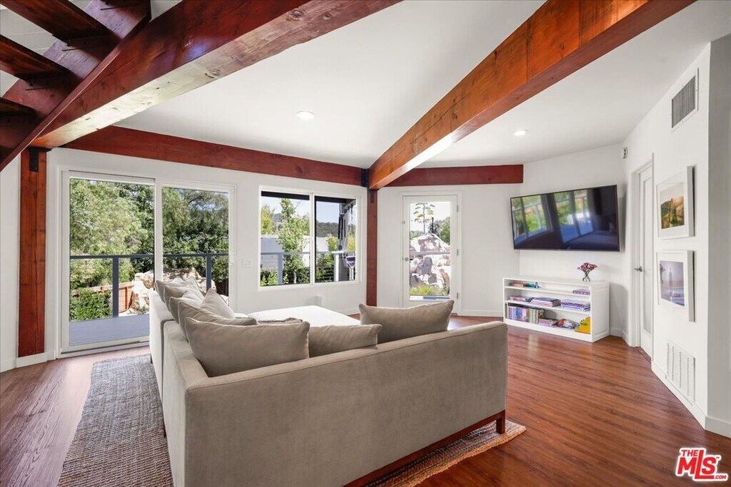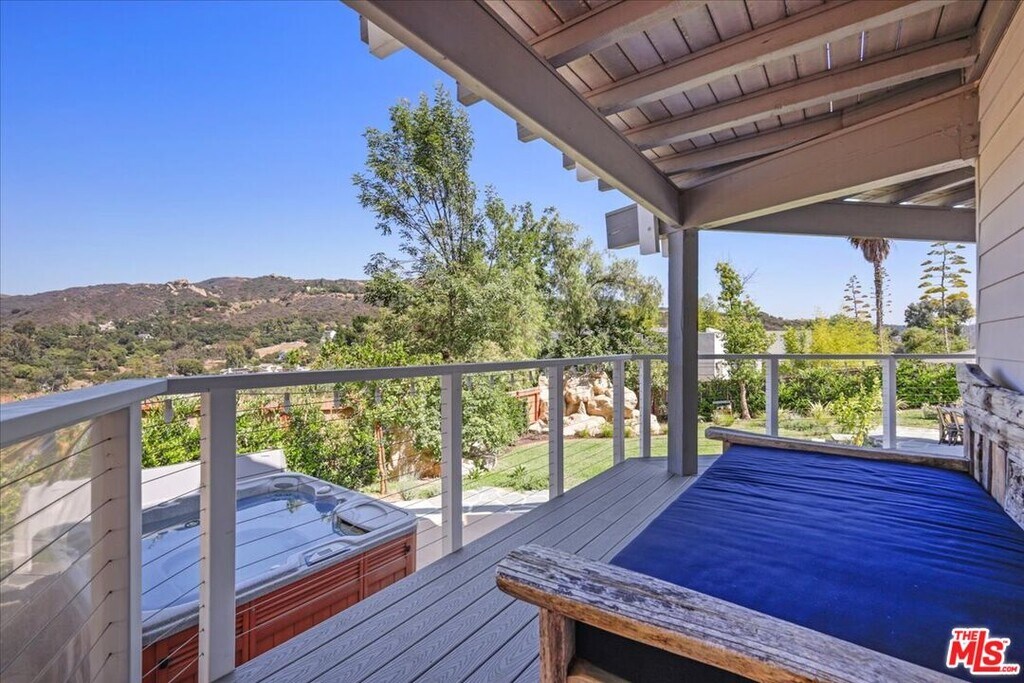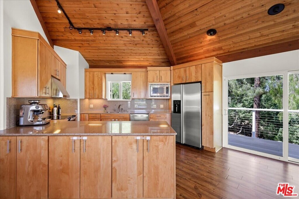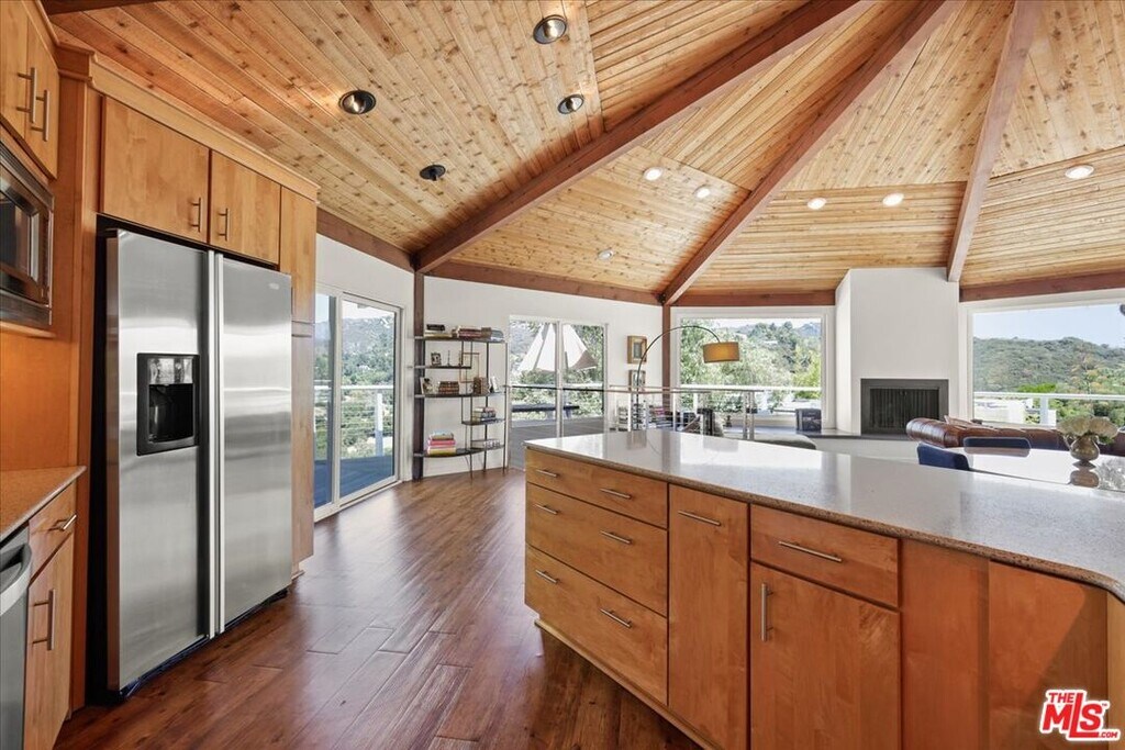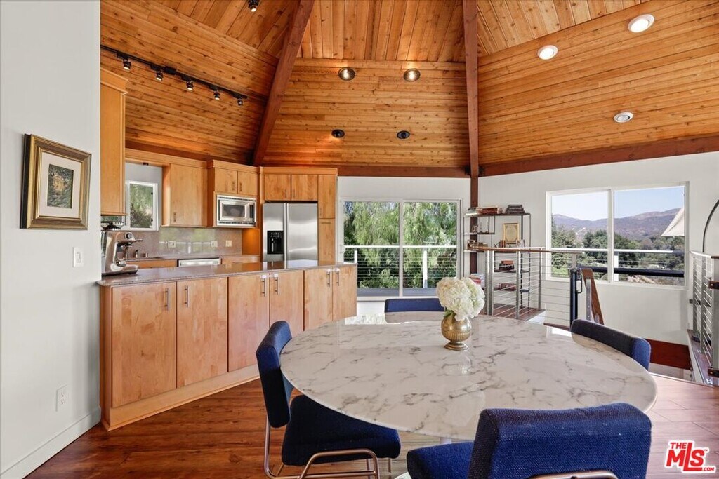 Available furnished or unfurnished. Welcome to this architecturally distinctive home, thoughtfully designed as a true retreat and quietly nestled in the heart of Topanga. Set on a spacious, newly landscaped lot, this 3 bedroom, 2 bathroom home blends architectural charm with seamless indoor-outdoor living. Inside this striking octagon-shaped home, vaulted cedar-beamed ceilings soar above expansive windows that capture mountain and canyon views, flooding the space with natural light. A cozy fireplace anchors the open living area, which flows onto a wraparound deck ideal for sunrise coffee or unwinding at sunset. The kitchen is outfitted with granite countertops and stainless steel appliances and opens directly to the main living areas, making it ideal for both entertaining & everyday living. The private backyard oasis features a hot tub and new landscaping with fully enclosed rattlesnake fencing. Whether you are soaking in the hot tub beneath the stars or strolling through the garden, every corner of this property invites a sense of calm. Located just a short walk to Topanga Living Cafe and nearby hiking trails, this home offers the perfect blend of nature and convenience. It feels worlds away while still being just minutes from both the coast and the valley. Additional features include a two-car garage, EV charger, and generous parking in the driveway. This inviting canyon sanctuary is ready for its next chapter! MLS# 25569843