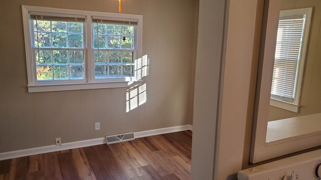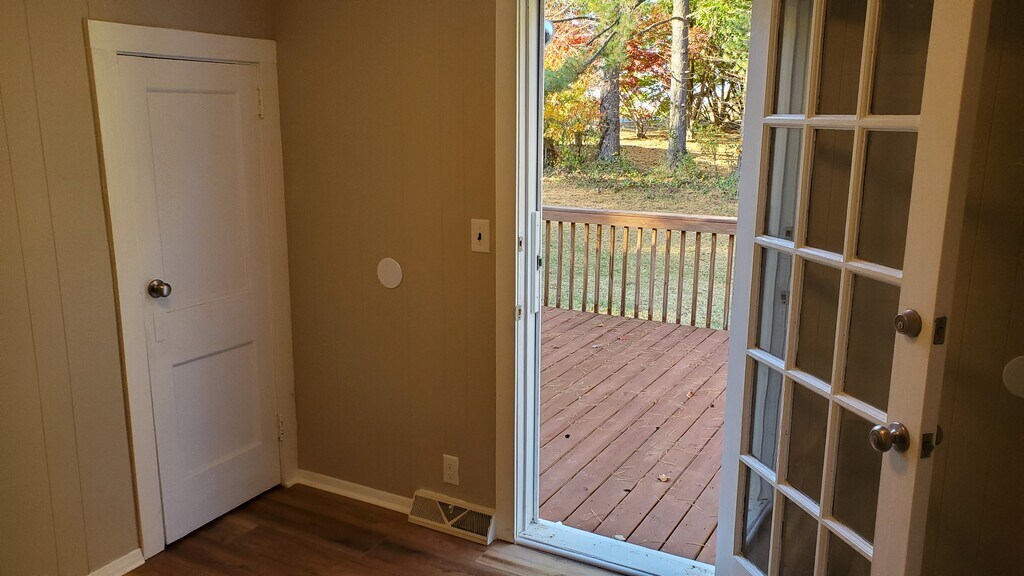 Great location! Lots of privacy while still being near schools, shopping and churches. Clean, nice neighborhood. Newly renovated with 2 bedrooms, 1 bath, blinds and rods for window dressings, like new refrigerator, energy efficient heat pump w/central air. Turnkey alarm system and internet ready. Nice deck overlooking property. Spacious, easy to maintain, graded yard with acres of wooded area surrounding, privacy fence, and large 2 car parking space. Renter responsible for utilities and lawncare. No pets. No smoking. No section 8. 1st and last months rent and security deposit.
