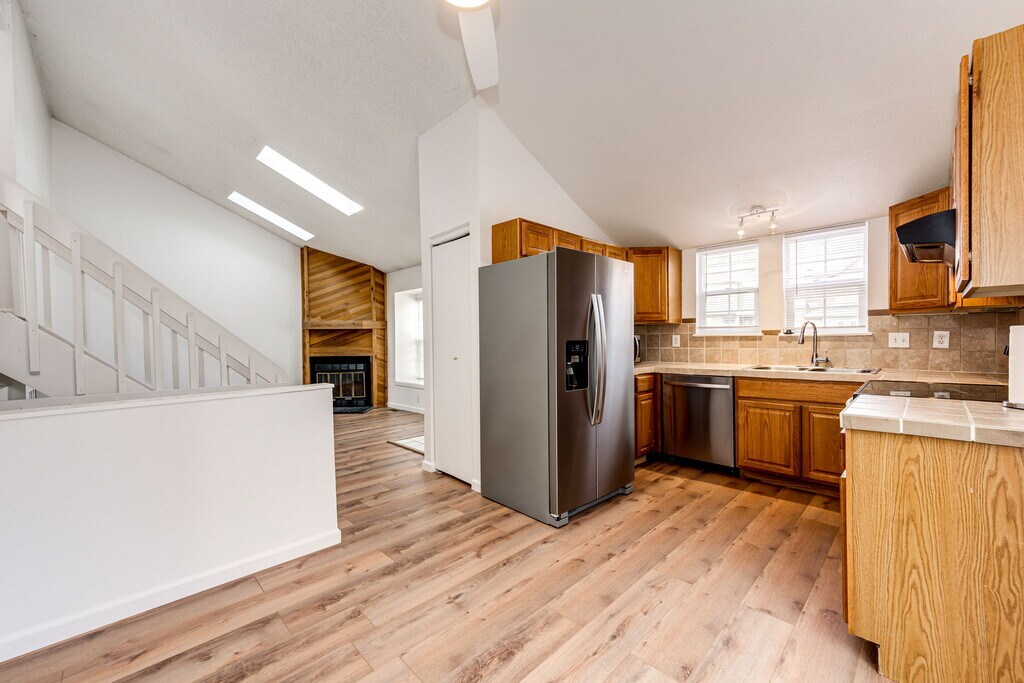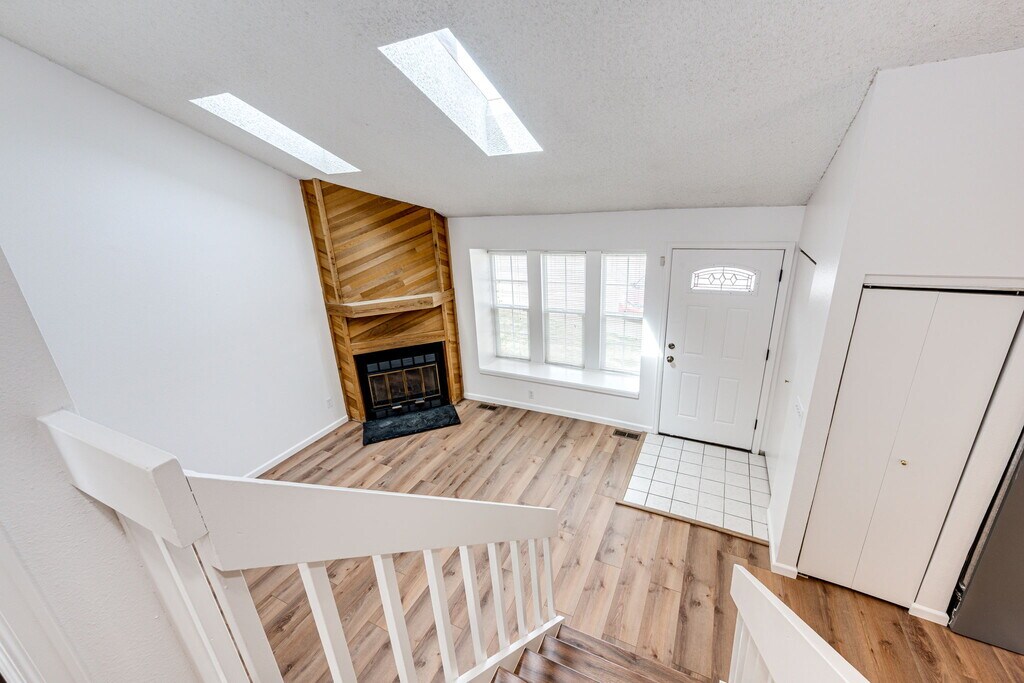 Nicely updated 3 bed + bonus room, 2 bath, 1200 SF end unit townhome backing to Quincy Reservoir in Cherry Creek School District. New vinyl flooring and paint throughout. Kitchen has tile counters and black/stainless appliances including washer and dryer. Private patio off the kitchen with additional storage closet. Wood burning fireplace, central air and 1 reserved parking space with plenty of open parking. Community pool and clubhouse. Email for faster response. Good income and credit required. Small pets ok with additional pet deposit.