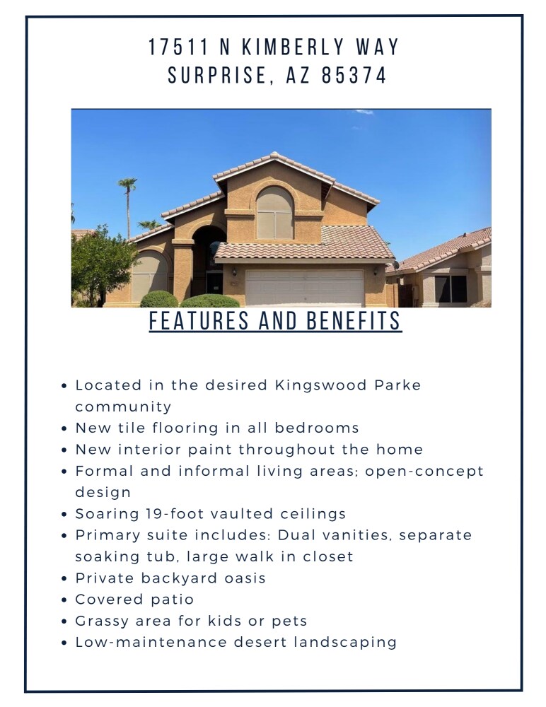 **Lease to purchase option only* Stunningly Updated Shea Home in Desirable Kingswood Parke Welcome to this beautifully refreshed 4-bedroom,3-bathroom residence offering 2,337 sq ft of refined living space. Thoughtfully upgraded with brand-new carpet in all bedrooms and fresh interior paint throughout,this home blends modern comfort with timeless style. Soaring 19-foot vaulted ceilings create a grand first impression,leading into spacious formal and informal living areas perfect for entertaining or everyday living. The open-concept kitchen features a convenient breakfast bar,ample cabinetry,and a walk-in pantry ideal for both casual dining and hosting guests. Retreat upstairs to the expansive primary suite,complete with dual vanities,a separate soaking tub and shower,and a generous walk-in closet. Three additional bedrooms and two more full bathrooms offer flexibility for family,guests,or a home office setup. Step outside to your private backyard oasis,featuring a covered patio,low-maintenance desert landscaping,and a grassy area perfect for kids or pets. Whether you're relaxing or entertaining,this space offers the best of Arizona living. Situated within the highly regarded Dysart Unified School District and just minutes from shopping,dining,and parks,this move-in ready gem is the perfect blend of luxury,functionality,and location. Don't miss your opportunity to live in this exceptional home!
