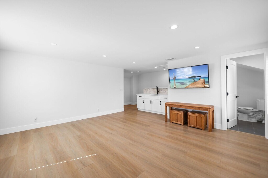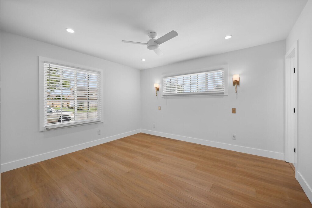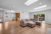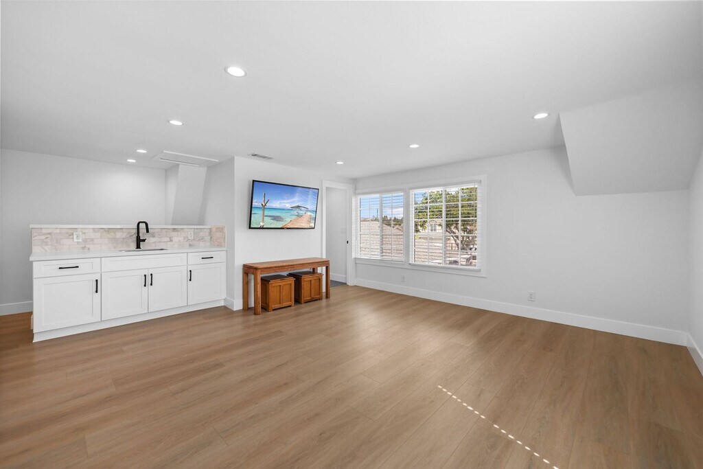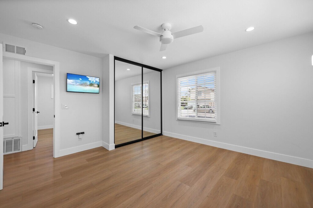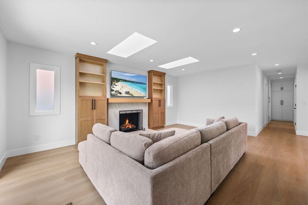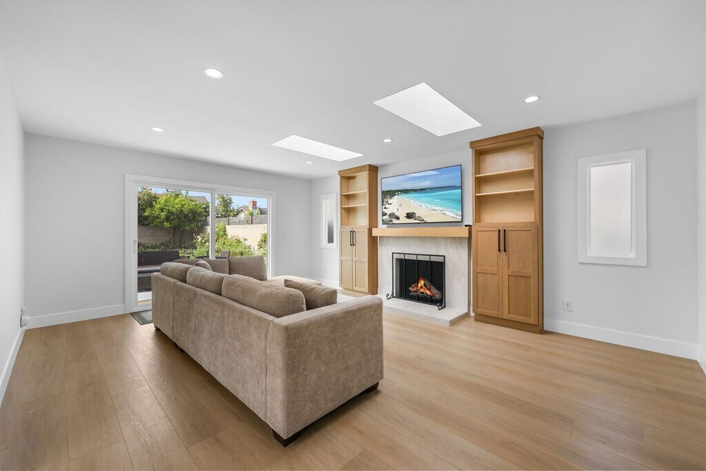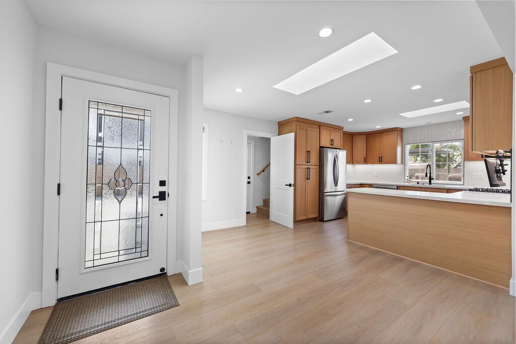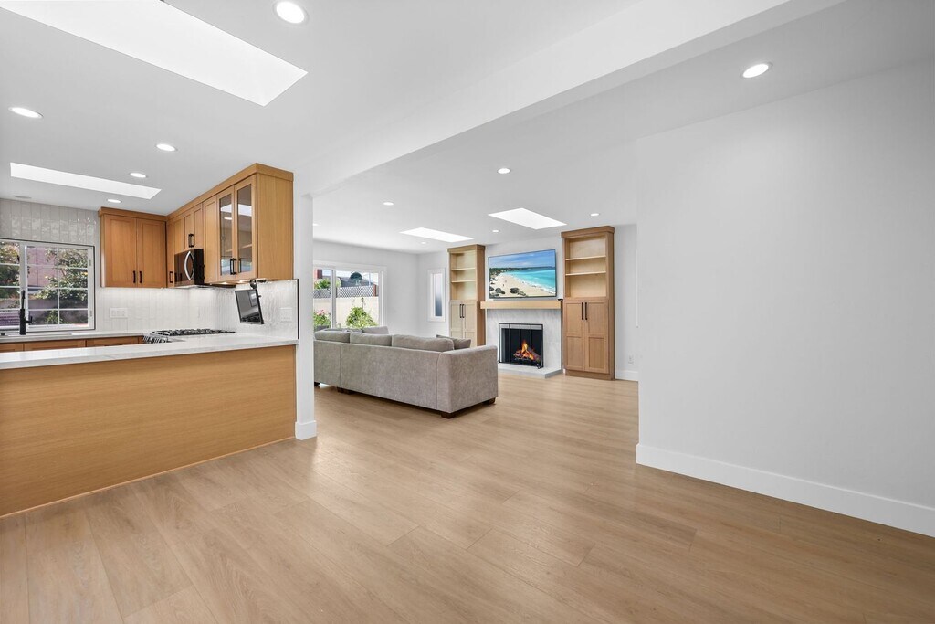 Completely renovated inside and out, this designer-updated 4-bedroom, 3-bath residence delivers modern California living in one of the most desirable neighborhoods of Fountain Valley. Offering approximately 1,789 square feet of thoughtfully reimagined living space, the home showcases a bright open-concept layout, wide-plank flooring, recessed lighting, and multiple skylights that fill the interior with natural light. The chef’s kitchen serves as a stunning focal point, featuring custom cabinetry, quartz countertops, stainless steel appliances, generous prep space, and an oversized peninsula that flows seamlessly into the main living and dining areas—ideal for both everyday living and elevated entertaining. Expansive sliding glass doors create effortless indoor–outdoor flow to a beautifully redesigned backyard retreat. Designed for lifestyle, the outdoor space features lush landscaping, artificial turf, multiple entertaining areas, a covered pergola lounge, and curated gathering spaces perfect for hosting and relaxing. A standout feature of the home is the private upstairs bonus suite located above the garage—an ideal flexible space for a home office, media room, guest suite, or multigenerational living. All bedrooms are well-sized and versatile, while three fully remodeled bathrooms showcase modern vanities, designer fixtures, and sleek contemporary tilework. A spacious finished garage with epoxy flooring and built-in storage adds both function and polish. Ideally located within the highly regarded Fountain Valley School District and just minutes from award-winning schools, neighborhood parks, shopping, and dining. Commuters will appreciate quick access to the Interstate 405, while beach lovers are a short drive from the Orange County coastline. This turnkey home offers comfort, style, and convenience in one exceptional lease opportunity. Available for immediate occupancy.