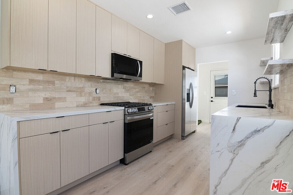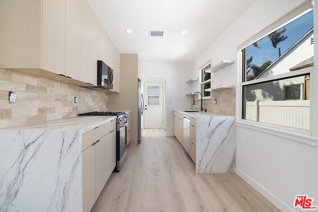 This beautifully fully remodeled home is ready for tenant to call home. It is hard to find a rental done with such high end finishes. The home has incredible natural light with a great living and magnificent designer done kitchen. The home has 3 bedrooms, one full bathroom and a half bath near the kitchen. The home has central air and heat making it extremely comfortable. All of the bedrooms are similar in size. One bedroom leads out to the backyard as well as a door off the kitchen. The backyard is extremely spacious with a large orange tree and perfect for outdoor gatherings and dinners. The street and location is a quiet beautiful residential area in the the highly desired Lake Balboa pocket. MLS ID 26653129