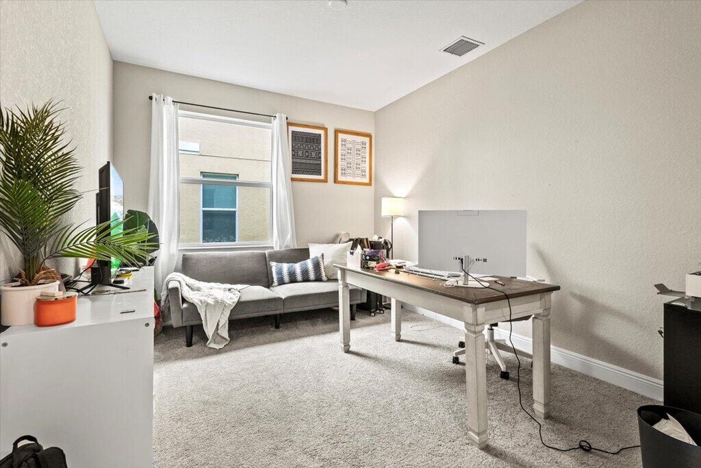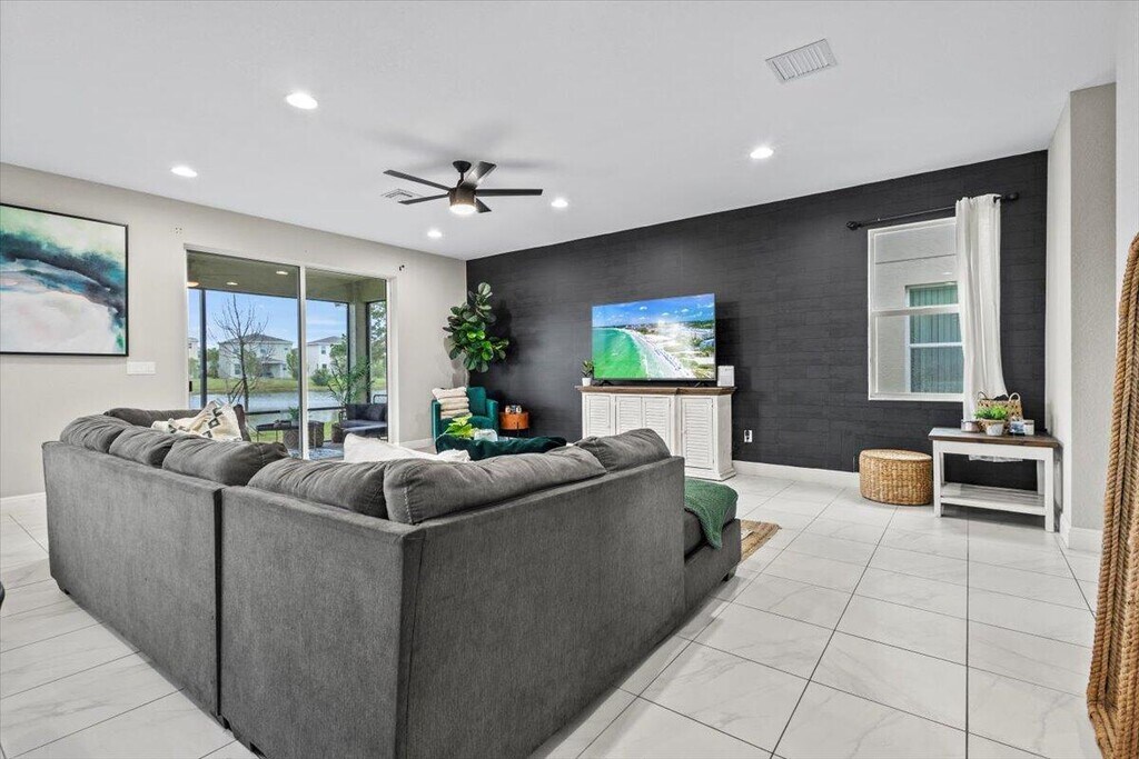 . The open-concept living area is highlighted by high ceilings and large windows, while the kitchen offers stainless steel appliances, granite countertops, and a sizable island. The master suite boasts a luxurious en-suite bathroom with a walk-in shower. The beautifully landscaped yard and covered patio, which offers a serene lake view, creating an ideal setting for outdoor living. The community also provides amenities such as a clubhouse, pool, fitness center, and walking trails.