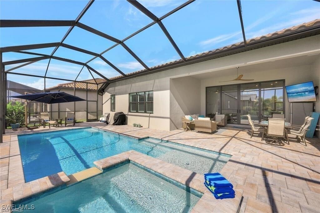 Wonderful home in the resort style community of The Place at Corkscrew. This spacious home is beautifully furnished with a private pool and hot tub. This Creekview floorplan has 3 BRs plus a den which has a sleeper sofa. Enjoy the private outdoor area at the home and head over to the clubhouse to grab some dinner and drinks at the restaurant or pool-side bar area. Other amenities include a 2-story fitness center,cafe,tennis,pickle ball,and Bourbon Bar with live music on the weekends. Available Off season August and