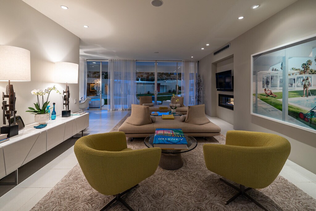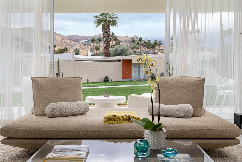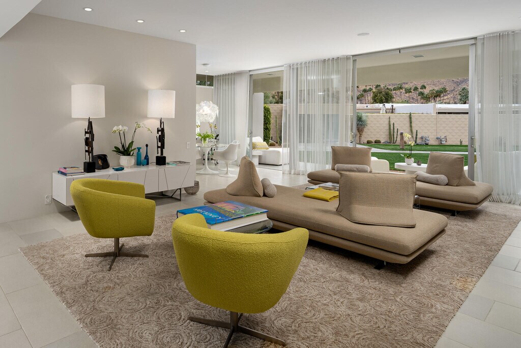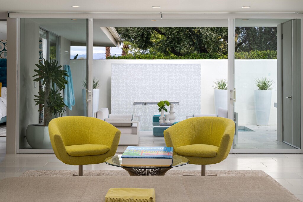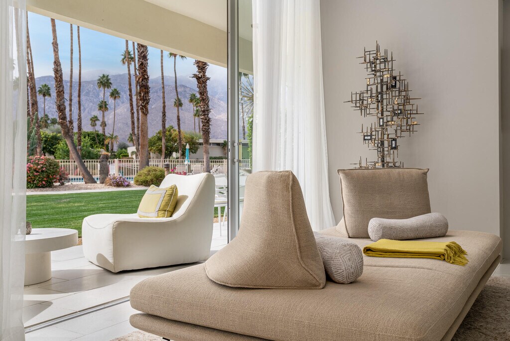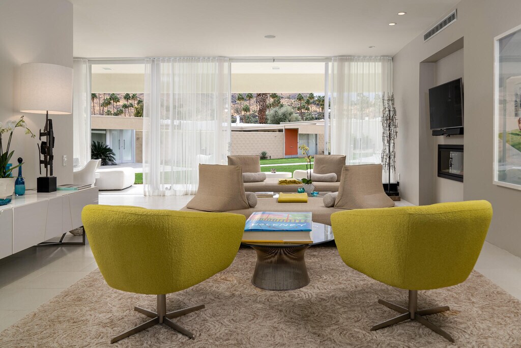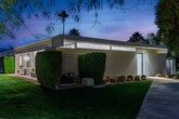 Stunning and sophisticated mid-century modern home in South Palm Springs. Timeless design with modern comforts,featuring sleek quartz countertops,stainless-steel appliances,and polished concrete floors throughout. Walls of glass and 10-ft ceilings capture breathtaking mountain views. Enjoy a cozy double-sided fireplace,remote shades,and updated spa-like baths. Located in the iconic Seven Lakes Country Club with golf,15 pools,spas,and a clubhouse with restaurant and bar.
