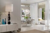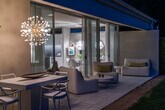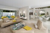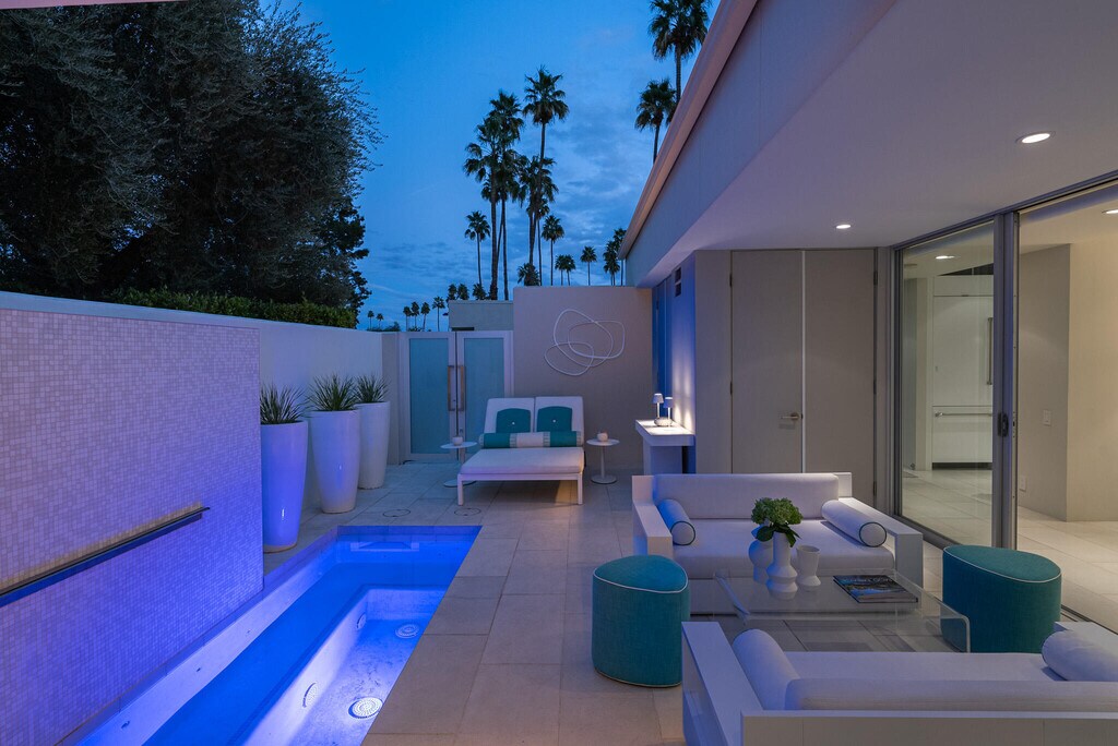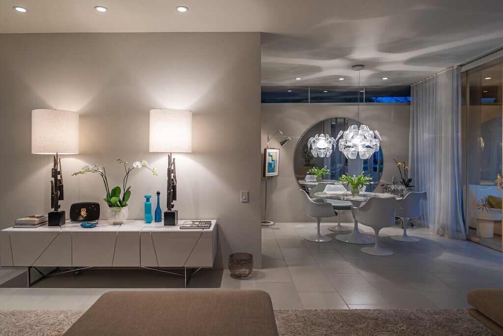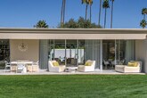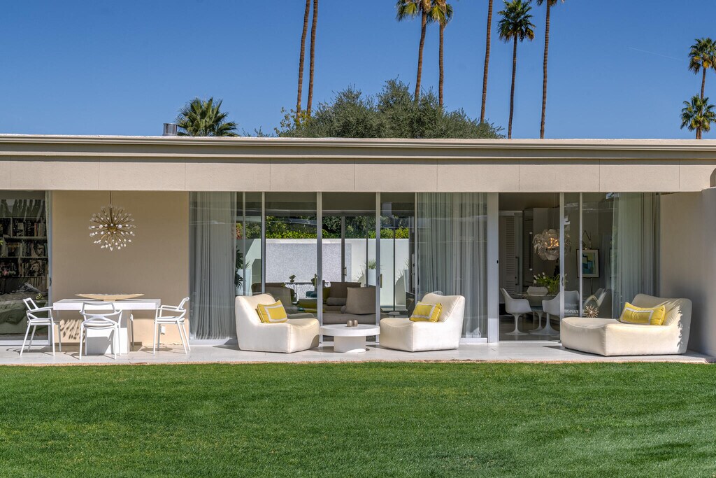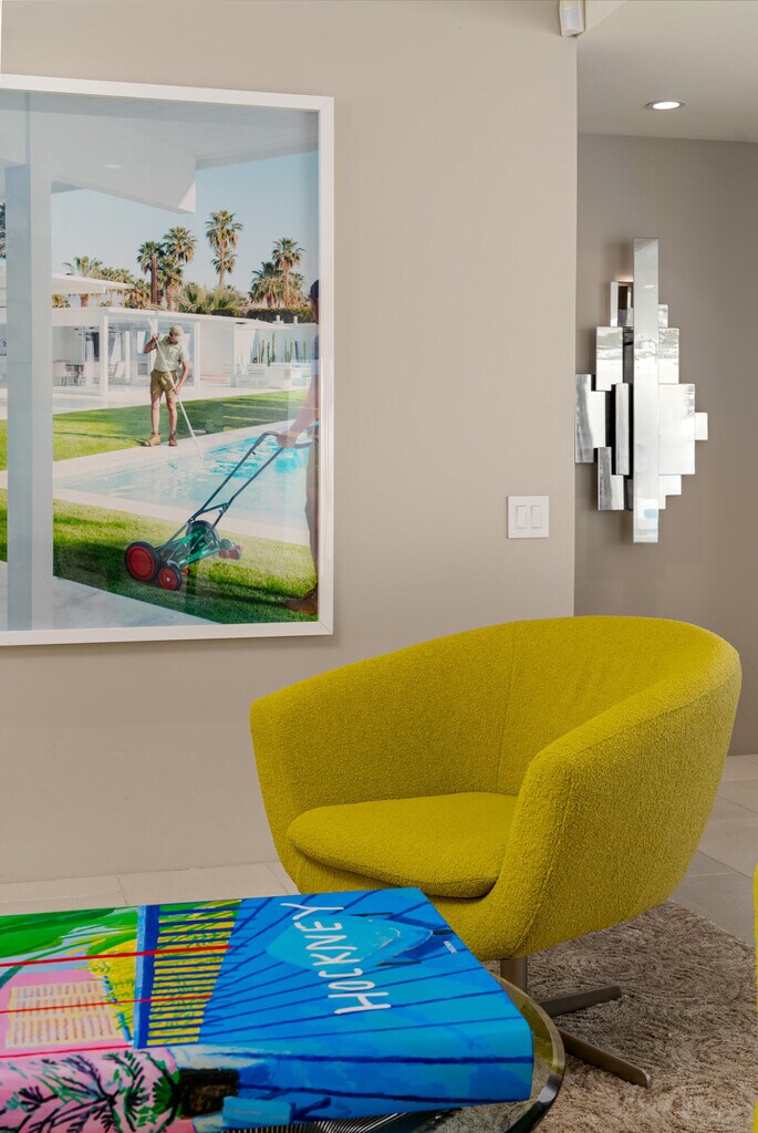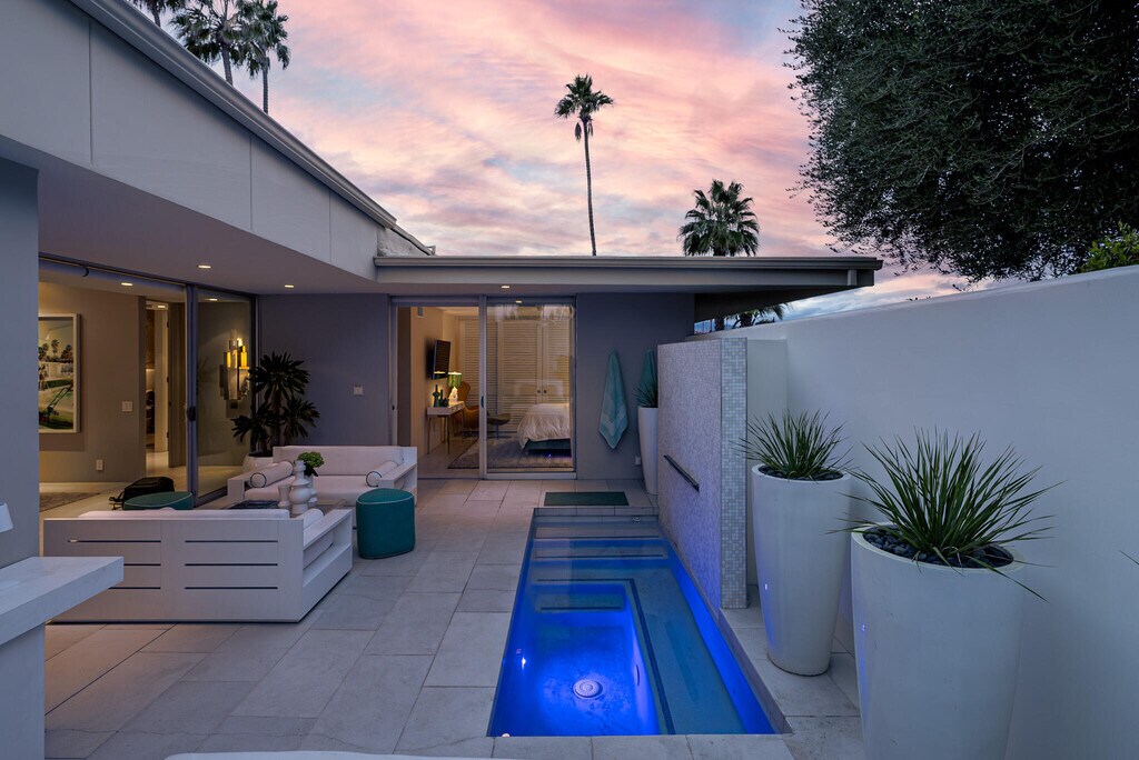 Stunning and sophisticated mid-century modern home in South Palm Springs. Timeless design with modern comforts,featuring sleek quartz countertops,stainless-steel appliances,and polished concrete floors throughout. Walls of glass and 10-ft ceilings capture breathtaking mountain views. Enjoy a cozy double-sided fireplace,remote shades,and updated spa-like baths. Located in the iconic Seven Lakes Country Club with golf,15 pools,spas,and a clubhouse with restaurant and bar.