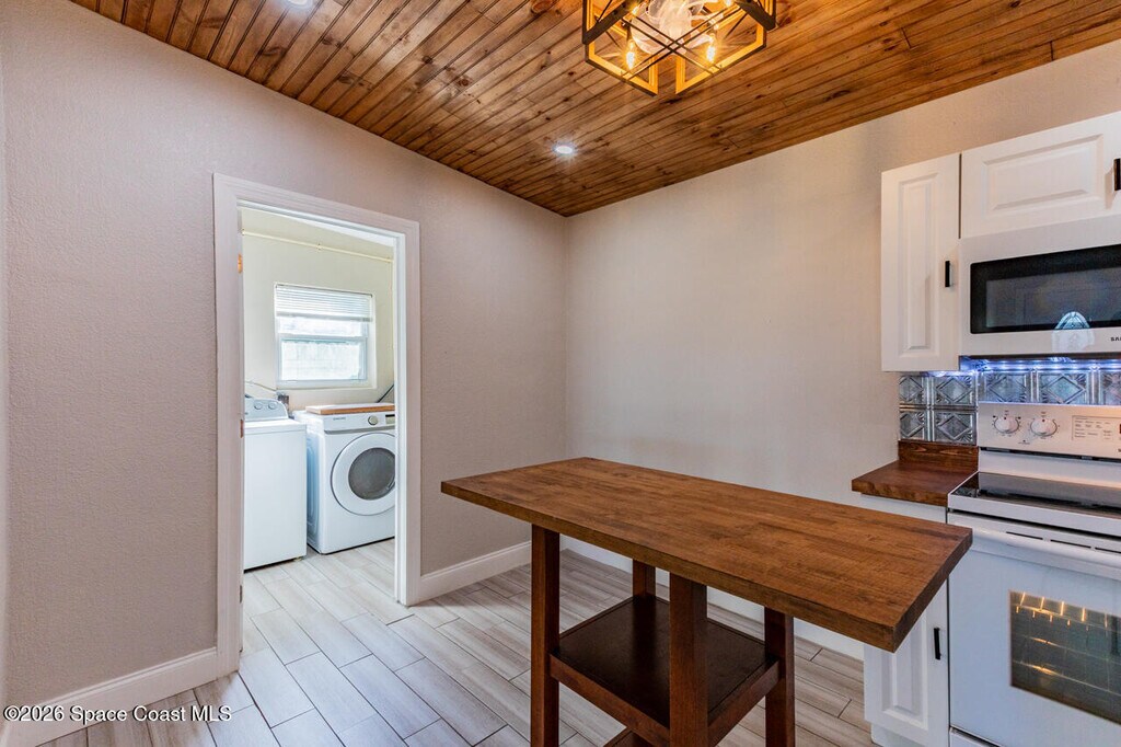 Water,FPL & yard maintenance included! Tesla charging station available,EV compatible with adapter. Live under the oaks in one of Melbourne's best-kept secret neighborhoods! This stunningly updated home has 3 bedrooms and is not your typical generic rental. Bursting with character,the living area showcases rustic beam ceilings and wood-look tile floors for a warm,inviting vibe. The gorgeous,updated kitchen features a beadboard ceiling,tin-look backsplash,under-cabinet lighting,glass-top stove,dishwasher,wood countertops,and a center island perfect for cooking and entertaining. Enjoy a split floorplan with a large primary bedroom highlighted by a dramatic wood-look accent wall,plus new wood laminate in all bedrooms. The spacious indoor laundry room includes washing machine and new dryer. Step outside to your own private oasis: a fully fenced side yard,lush landscaping,and sweeping oak trees draped in moss. Peaceful,PRIVATE,picturesqueand truly one-of-a-kind. MLS # 1065980