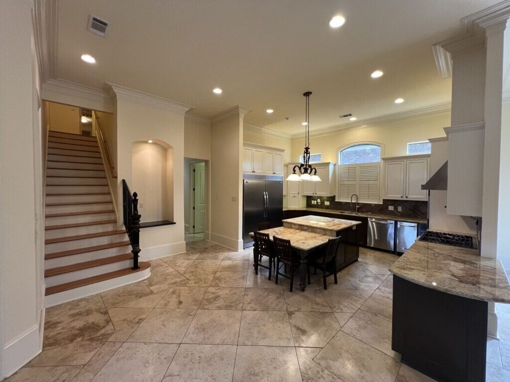 This stunning two-story home in the desirable Shadows Lake Subdivision offers space, comfort, and beautiful finishes throughout. The open living room features built-in shelving and a cozy gas fireplace, while the dining area is highlighted by an elegant chandelier. The spacious kitchen is designed for both function and style with granite countertops, a gas cooktop with vent hood and pot filler, built-in microwave/oven, dishwasher, trash compactor, extra-large refrigerator/freezer, and plenty of cabinetry along with a hallway pantry. Step outside from the kitchen to enjoy the covered outdoor kitchen and patio area, complete with a gas stove, grill, and sink—perfect for entertaining. The home also features a large laundry room with washer, dryer, counter space, and sink, a convenient half bathroom, and a 3-car garage with additional storage. Downstairs includes a flexible bedroom or office space along with the spacious master suite featuring a luxurious bathroom with separate shower, jacuzzi soaking tub, dual vanities, and a large walk-in closet that connects to the laundry room. The master suite is also accented with a private patio. Upstairs offers beautiful wood flooring, two generously sized bedrooms with ceiling fans, a Jack-and-Jill bathroom, and an additional workout or flex room with a full wall mirror. The fenced backyard and private outdoor kitchen area complete this beautiful home. Security Deposit Alternative Available: This property offers Obligo, allowing qualified renters to move in without paying a traditional security deposit while still providing protection for the property owner.