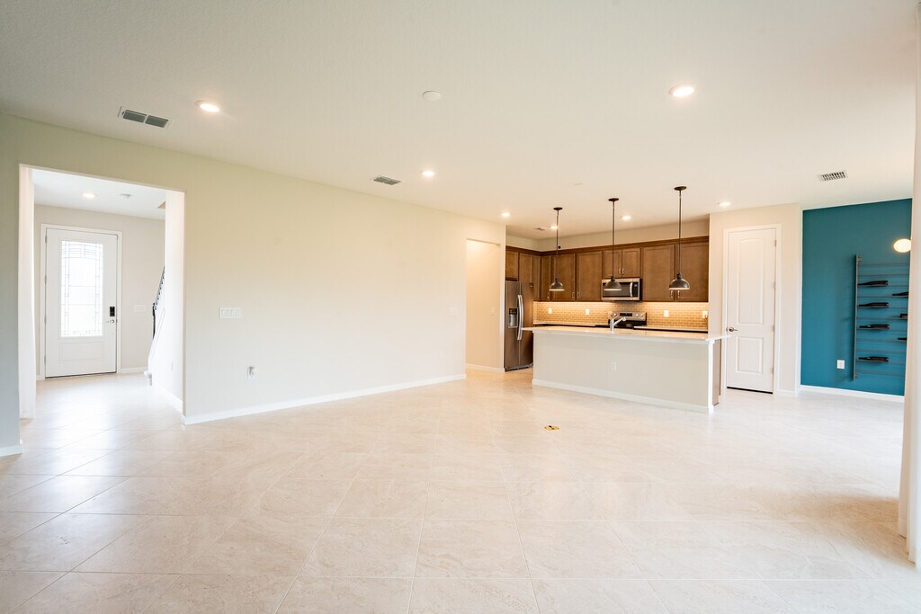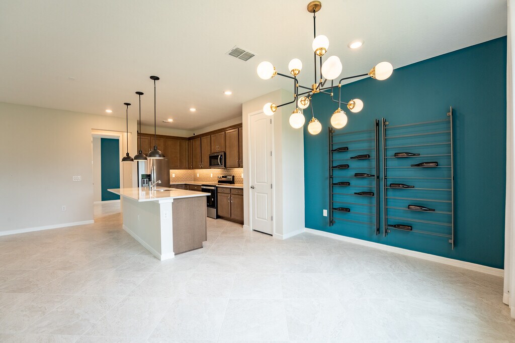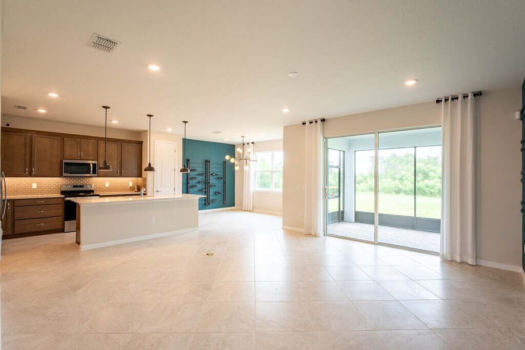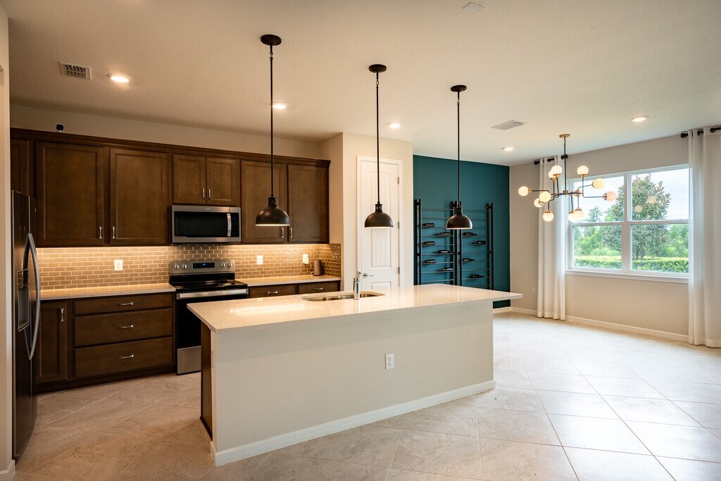 MODEL HOME move in ready . Located in the rolling hills of Clermont FL, minutes from Disney World entertainment & amusement parks. Over 2500 sq ft of living space, that includes high ceilings, 5 bedrooms and 3 bathrooms. Enter your home to an open living and dining area off of an open family room & eat in kitchen with granite counter tops, stainless steel smart appliances, pendant lights and a massive island. Upstairs a large loft, spacious master bedroom, large walk in closet. Large master bath, with dual sinks & lots of counter space, shower, water and linen closet. 3 additional bedrooms, another bath & laundry room, 1 bedroom down stair, bath and lanai.
