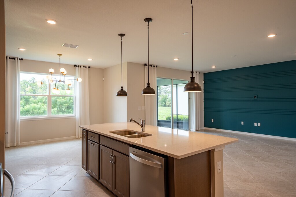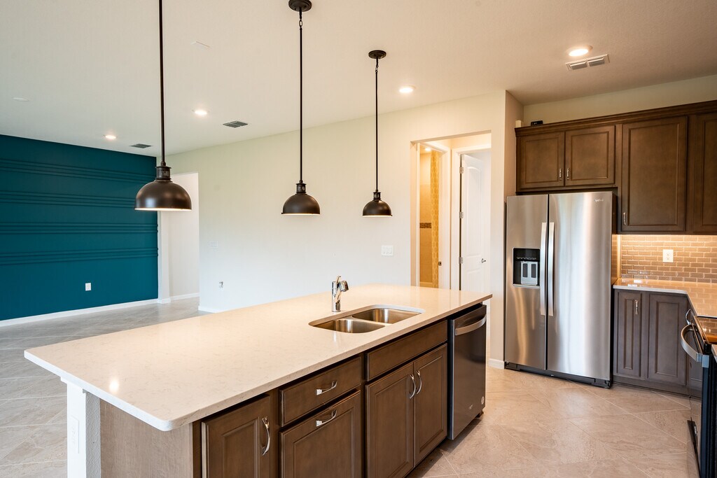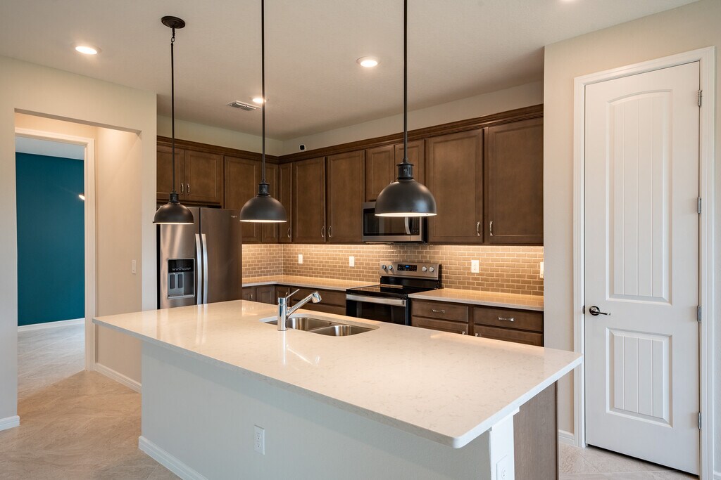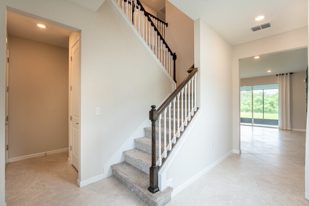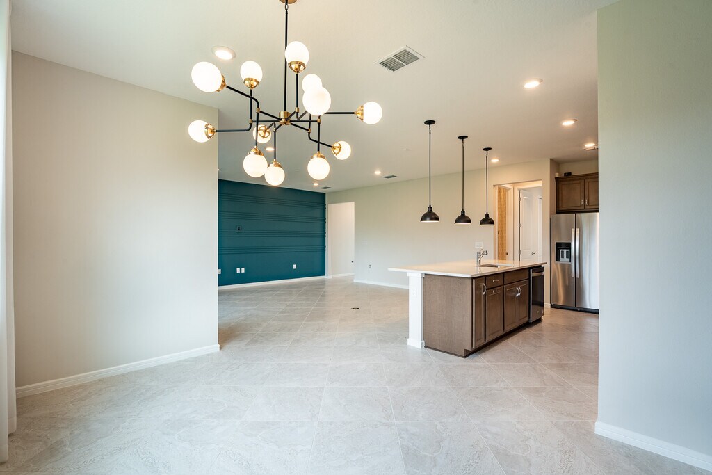 MODEL HOME move in ready . Located in the rolling hills of Clermont FL, minutes from Disney World entertainment & amusement parks. Over 2500 sq ft of living space, that includes high ceilings, 5 bedrooms and 3 bathrooms. Enter your home to an open living and dining area off of an open family room & eat in kitchen with granite counter tops, stainless steel smart appliances, pendant lights and a massive island. Upstairs a large loft, spacious master bedroom, large walk in closet. Large master bath, with dual sinks & lots of counter space, shower, water and linen closet. 3 additional bedrooms, another bath & laundry room, 1 bedroom down stair, bath and lanai.