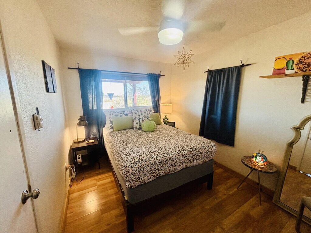 This is a fantastic rental opportunity to live in the peace and seclusion of a remote area in Joshua Tree. This remodeled 2 bd, 1 ba cabin sits on 1.5 acres nestled in panoramic views of the mountains and wide open desert. The yard is complete with a stargazing bed, cowboy tub, and a convenient irrigation system for the landscaping. Inside the home is updated and well maintained. There are hardwood patterned vinyl floors and this house is available furnished or unfurnished. Mini-splits for heating and cooling. Appliances include refrigerator, oven, stove, dishwasher, washer, and dryer. The 1.5 acre yard is fully fenced. Small dogs are negotiable with Petscreening. Rent is $1,675/month for a 12 month lease. Shorter leases are negotiable. Security Deposit is one month's rent. Tenant pays utilities: water, electric, propane, and trash pick up. Access to this house requires driving just over 2 miles on a dirt road. Available furnished or unfurnished. To see a video walk through or apply, check out the listing on Desert Home Management Services website . For questions or to schedule an appointment to see the house, contact Annie Semmelroth at or .