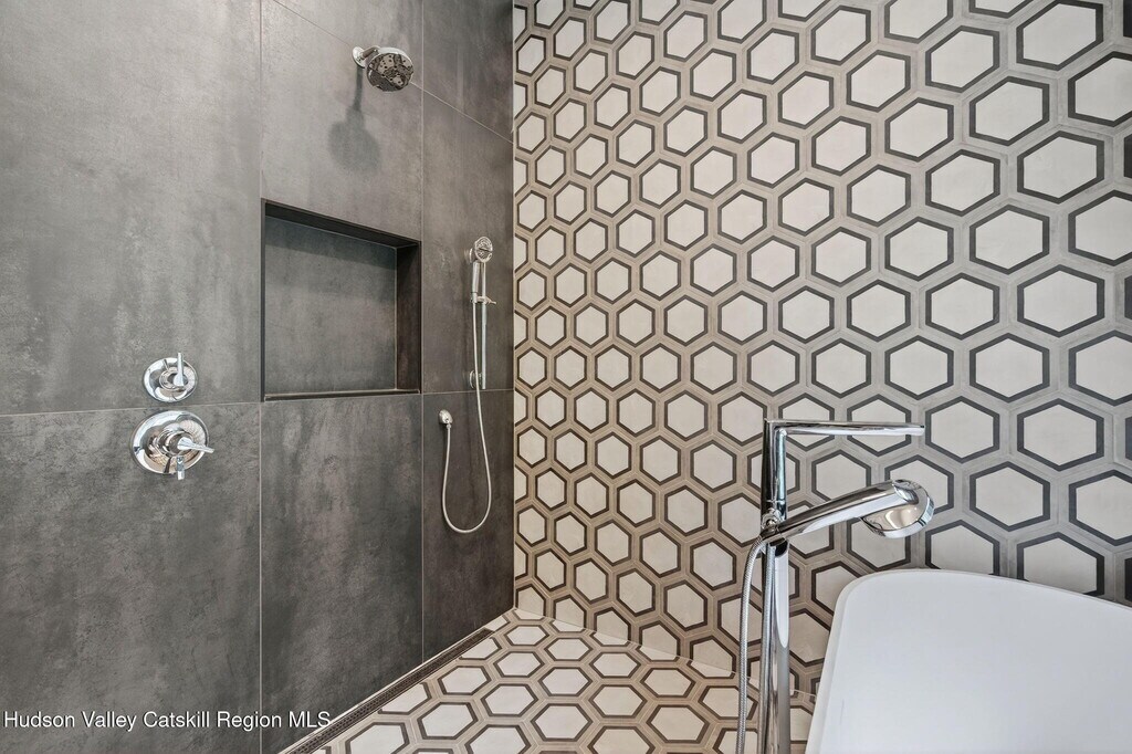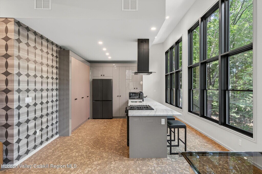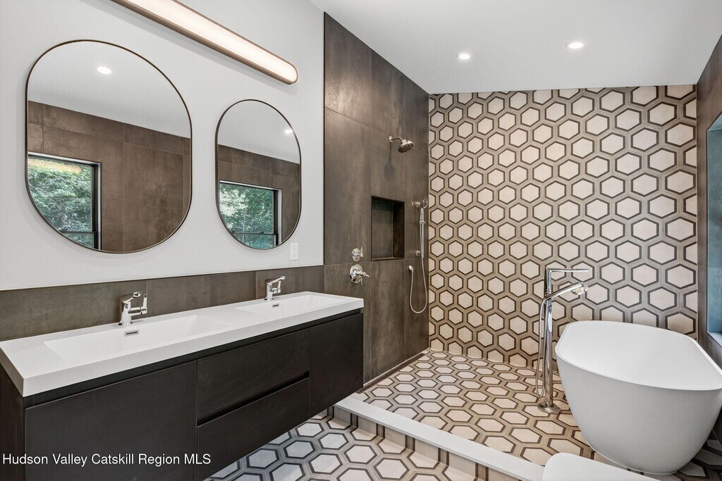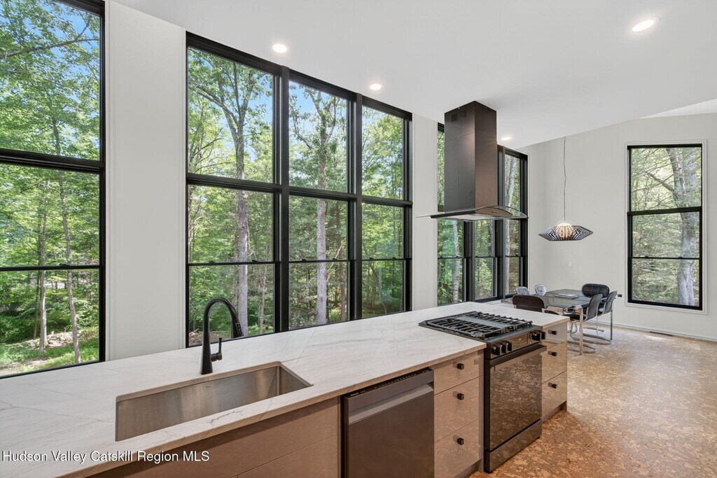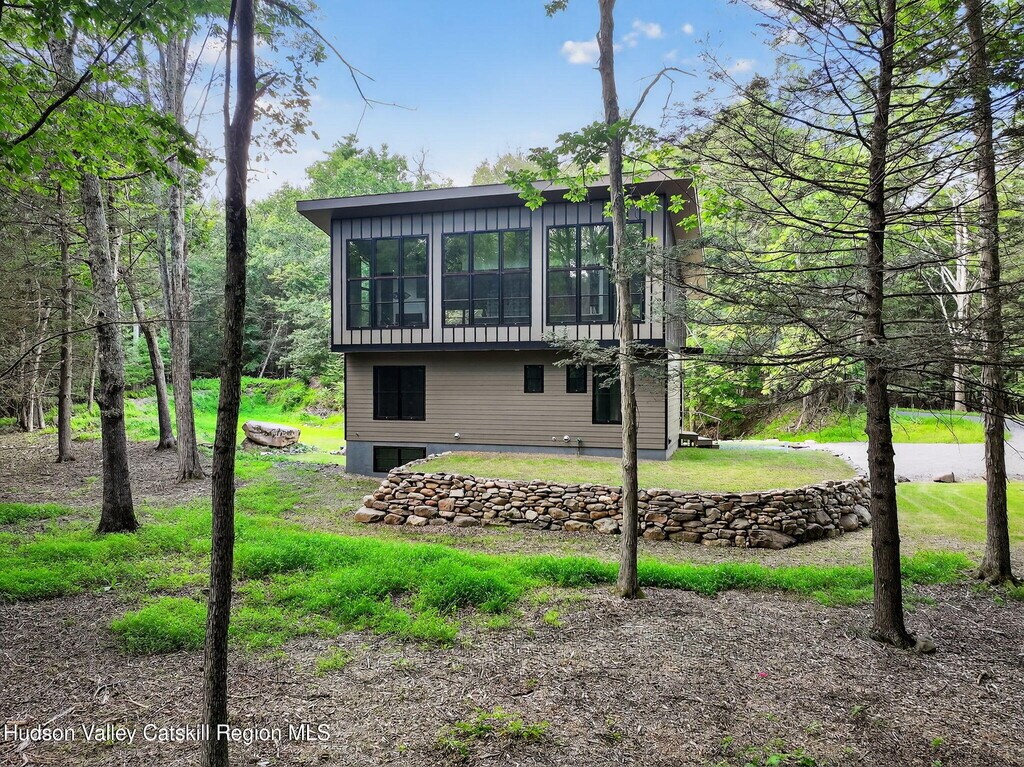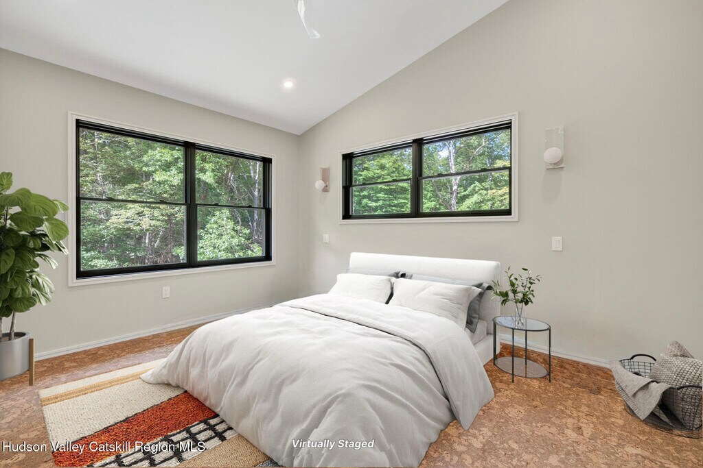 Welcome to your serene and stylish escape in the heart of the Catskills. This brand new,fully furnished rental offers the perfect blend of modern luxury and natural beauty,just minutes from the shops,restaurants,and culture of Woodstock. Using ecological and state of the art building practices highlighted by exceptional craftsmanship and distinctive design. Ascend an impressive switchback floating staircase to a stunning wall of windows that flood the open concept,living,kitchen,and dining area with natural light. A double-sided wood-burning fireplace serves as a striking centerpiece,creating an inviting atmosphere,perfect for entertaining. The heart of the home is a fully equipped Euro kitchen with custom cabinets,high-end appliances and expansive counter space,an ideal place for culinary enthusiasts and friends to gather. Retreat to the spacious primary suite,with a stunning ensuite bath that features a double vanity,rain shower,exquisite tile work,and a soaking tub overlooking the property,don't miss the walk-in closet. This loft style design highlights expansive glass,ecological cork flooring and Infinity molding that flows seamlessly throughout the home. The first floor offers three additional bedrooms,each designed with comfort and style in mind. These rooms are spacious and versatile,easily adaptable to suit your needs,whether as guest rooms,home offices,or personal sanctuaries. The full bath on this level is elegantly appointed with contemporary fixtures and finishes,ensuring that every aspect of the home maintains its luxurious and modern aesthetic. A conveniently appointed laundry closet with washer and dryer hookups and chic powder room complete this level. The finished walk out basement featuring radiant floors beckons your creative touch,ideal for a home gym,media room,yoga studio and more. Nestled on 4.5 acres with a serene pond and stream,this home offers a perfect blend of modern luxury and nature,creating an unparalleled sanctuary. All of this is just 1 mile from the heart of Woodstock,where art,music,and nature meet. Whether you're seeking a weekend getaway or a longer-term escape from the city,this move-in ready rental offers comfort,privacy,and a modern Catskills lifestyle at its finest.