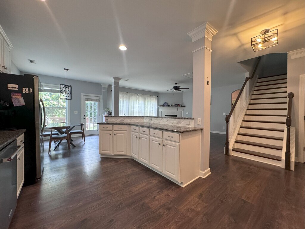 Beautiful house in Cornelius with plenty of natural light, 4 beds, 3 full baths, 2840 sq. ft. Spacious master bedroom with walk in closet and remodeled bathroom. The first floor includes a convenient bedroom and full bathroom. First floor also offers a cozy office with built-ins and French doors, a formal dining room, a breakfast nook, and kitchen with granite countertops, stainless steel appliances, and a large island. Vinyl flooring through the first floor and kitchen. Spacious family room with decorative fireplace. Backyard is fenced. Dog friendly (with pet fee). Parking: two-car garage attached. Access to community pool. Nearby attractions include greenway, Lake Norman Jetton Park, Birkdale Village for shopping, fine dining, and entertainment. Easy access to I-77. Family friendly neighborhood. Photos are from prior residency. Current tenant furniture are different. Property condition may vary. Tenant is responsible for utilities and lawn care. Renters insurance required. Dog friendly, with pet fee of $200 per dog.