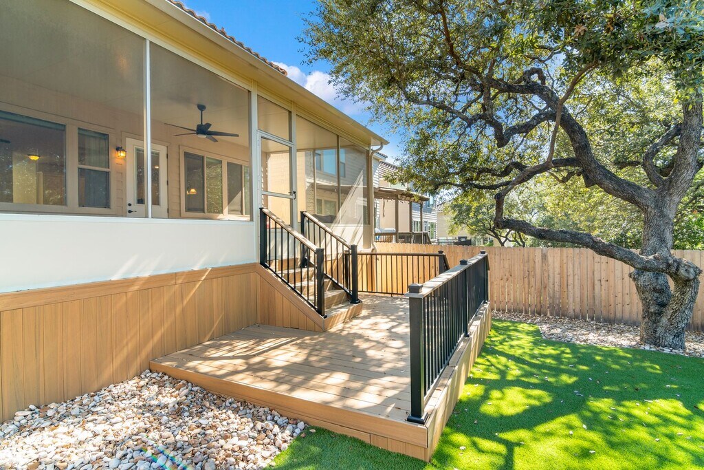 This beautifully refined two-story residence in Presidio Heights blends warm Spanish-inspired design with thoughtful modern updates. The inviting main level features an open layout anchored by a bright kitchen equipped with new stainless steel appliances and freshly updated cabinetry. Generous living and dining spaces create a comfortable flow for everyday use and hosting. Upstairs, the primary suite offers a peaceful setting with a spacious layout and a well appointed bath that includes a soaking tub and dual vanities. Two secondary bedrooms provide ideal flexibility for guests, family, or a home office. The outdoor living space is a standout feature. A fully screened-in porch with durable decking allows you to enjoy the outdoors in comfort, free from seasonal pests. Fresh turf enhances the backyard's usability and creates a low-maintenance, private retreat. Convenience is unmatched. The home sits minutes from Loop 1604, I-10, The Rim, La Cantera, and a wide range of restaurants, shops, and everyday amenities. The neighborhood pool is located just across the street for added enjoyment. Enjoy style, comfort, and exceptional access to the best of San Antonio.