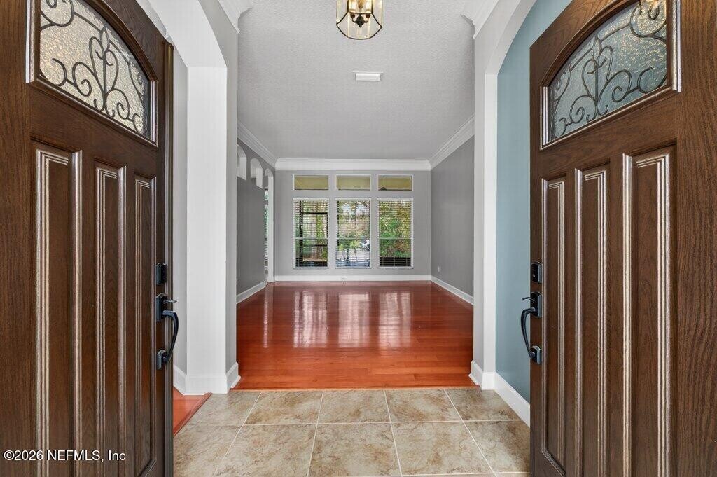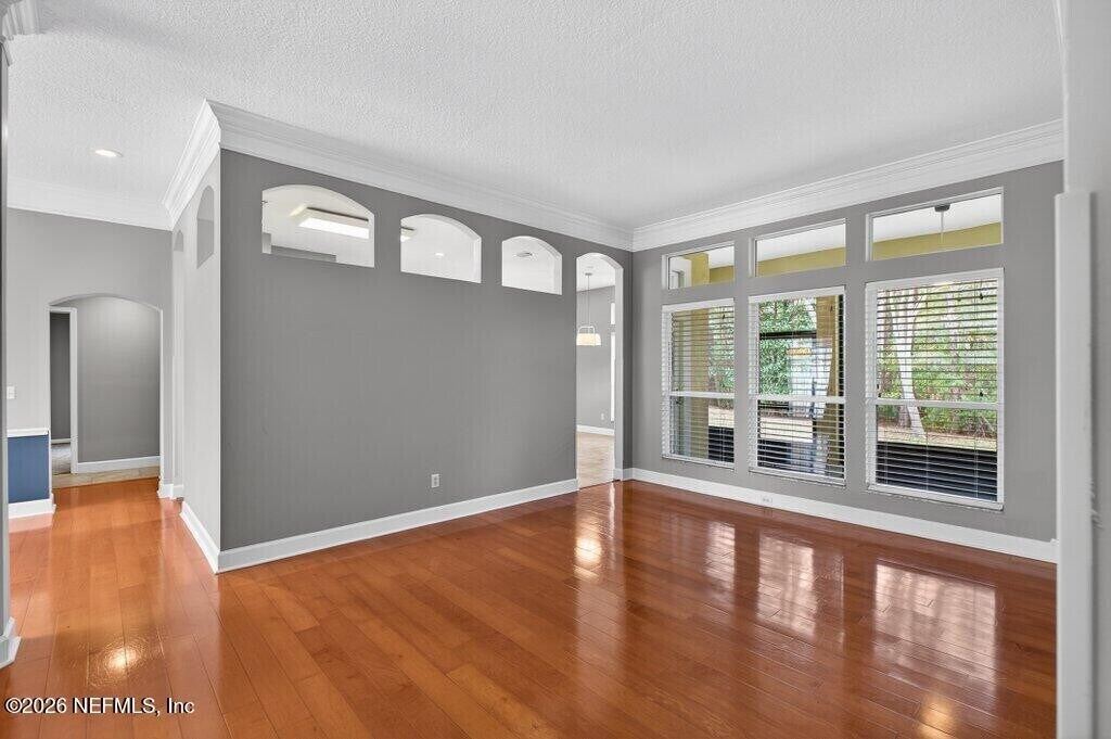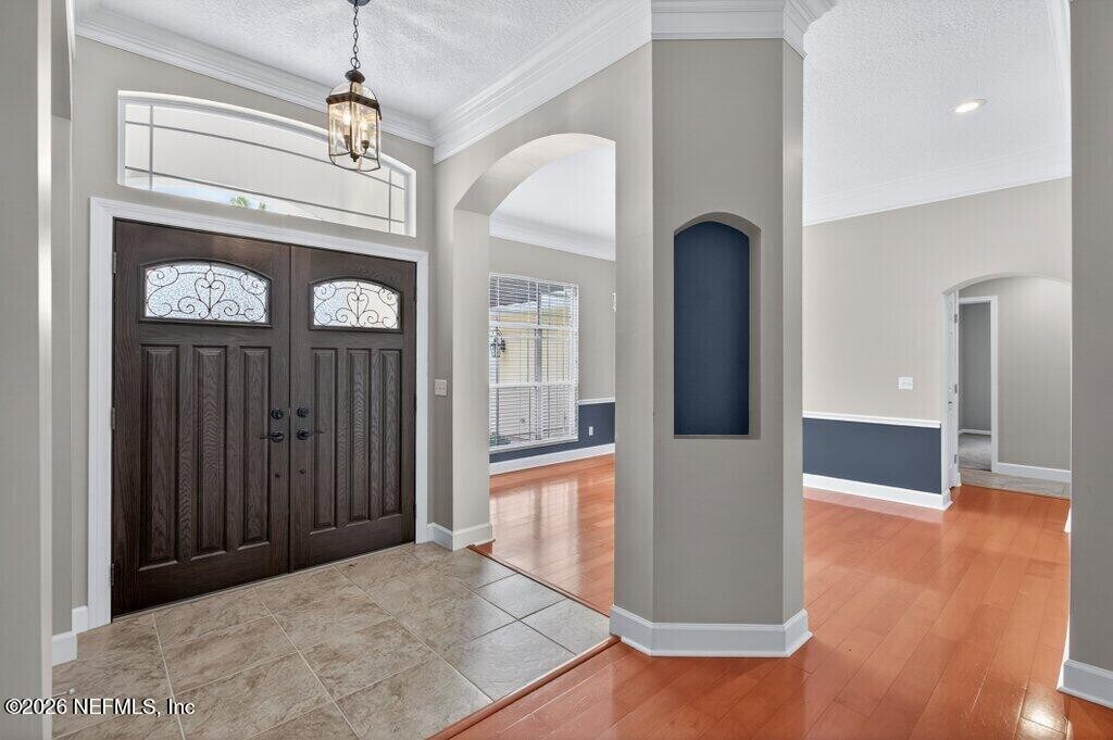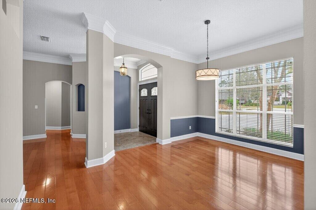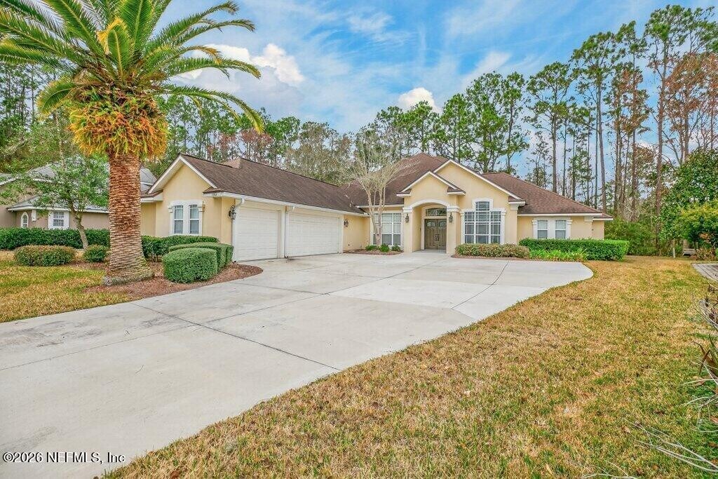 Welcome to this spacious 6 bedroom,4 bathroom traditional home nestled on a private .27-acre cul-de-sac lot in the highly sought-after Eagle Harbor Golf Community. Offering 2,923 square feet of thoughtfully designed living space,this home features a 3-car garage and an expansive driveway,perfect for multiple vehicles and guests. Step through the double door entry into a light-filled interior showcasing engineered hardwood floors,crown molding details,and soaring ceilings. The open living area is anchored by a built-in fireplace and flows seamlessly into the kitchen with ample cabinetry,breakfast bar,and large windows overlooking the wooded backyard. The primary suite is conveniently located downstairs and features carpet,a beautifully updated bathroom with dual vanities,a garden tub,and separate shower. On the main level,you'll find two secondary bedrooms connected by a Jack and Jill bathroom -providing exceptional flexibility for guests and extended family. Upstairs bedrooms provide generous space and flexibility for family,guests,office,or bonus rooms. Enjoy peaceful mornings and private evenings on the covered and screened back porch backing to mature woods. Lawncare and landscaping are included,along with HOA and CDD. Residents of Eagle Harbor enjoy resort-style amenities including pools,golf,tennis,pickleball,clubhouse,boat ramp,pier,and miles of sidewalks. Conveniently located near NAS JAX and Baptist Hospital,plus shopping,dining,and entertainment. MLS# 2131290