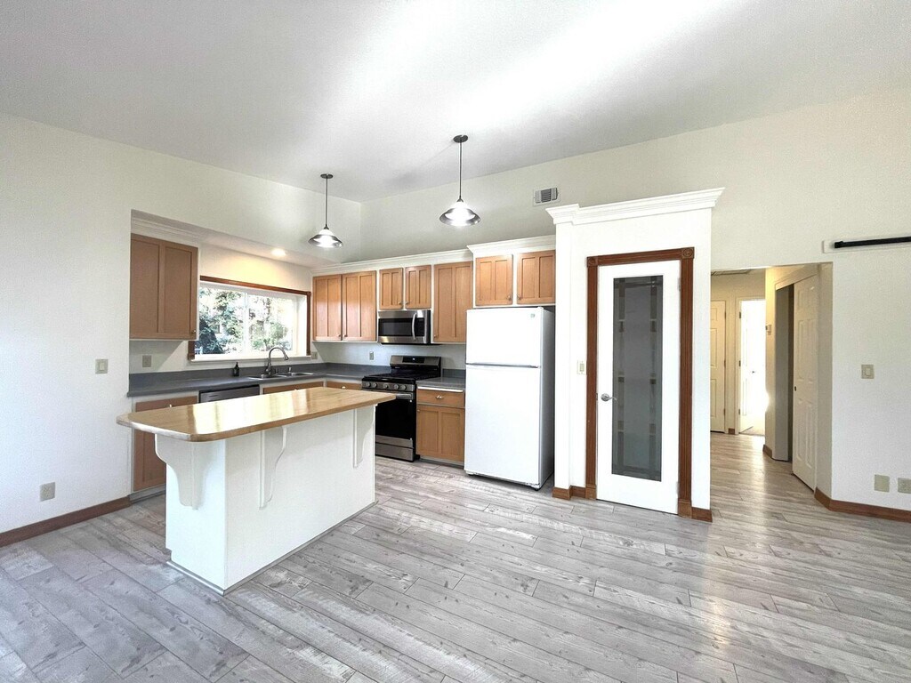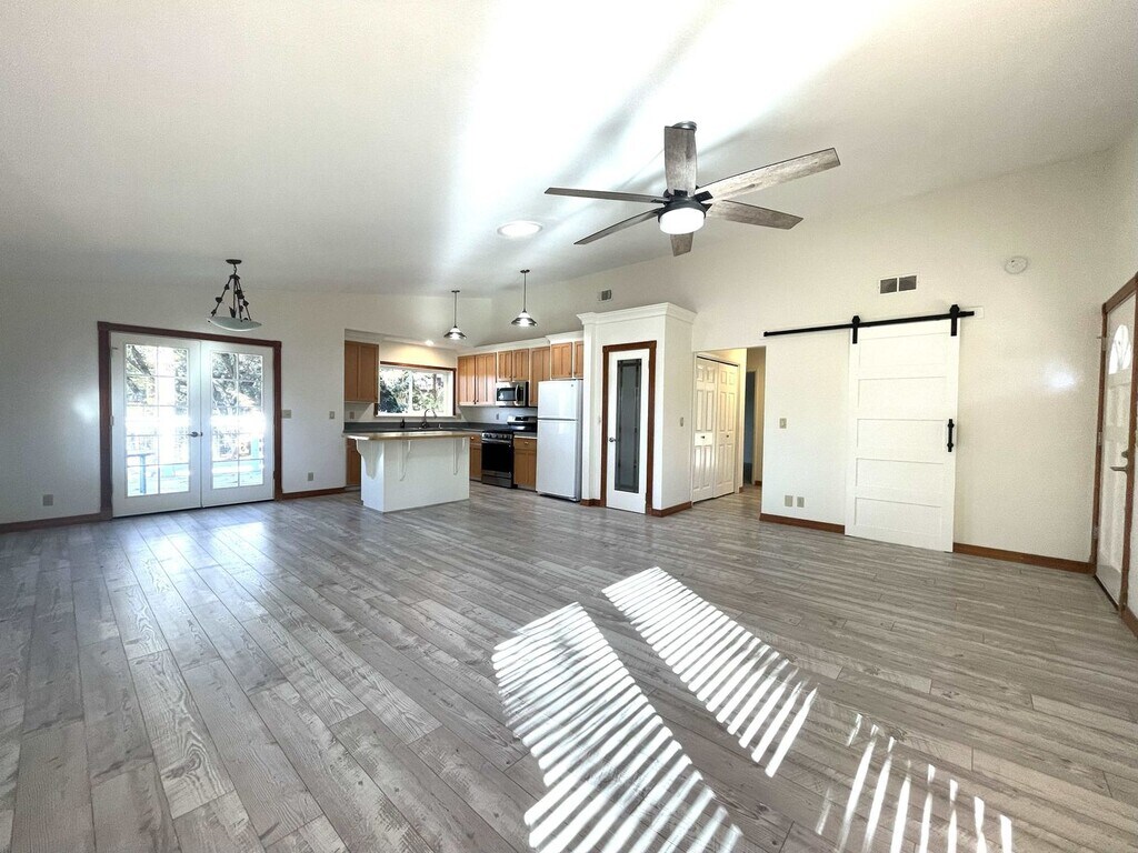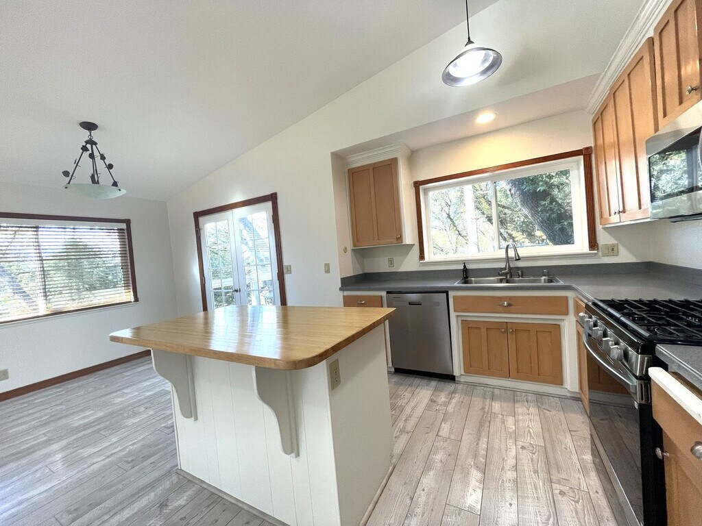 Home features vaulted ceilings, beautiful engineered flooring, ceiling fans, newly painted throughout. New upgraded kitchen appliances which are all included, center island eating bar, pantry closet. Dining area with French doors leading to the large back deck. Large great room with ceiling fan and solar tube for natural lighting. Master bedroom with back deck access. Guest bedroom and 3rd room which can be used as an office. Washer & Dryer included. Two car garage with long driveway with lots of space for additional guest parking. Large level private back yard. Home located close to the main gate. For more information or to schedule a viewing, please call Mary at .