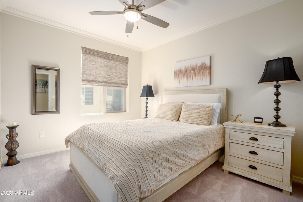 Welcome to your home away from home in the gated Monterey Ridge community -- a model-perfect 3 bed,2 bath townhome with a full 2-car garage. Located in the NE Valley close to the Phoenix Open,Barrett-Jackson,Spring Training,golf,dining,and more. Bright great room features plush upgraded carpet,crown molding,and a stone accent wall. The light-filled kitchen offers white cabinets with pull-out shelves,stainless appliances,pendant lighting,and ample counter space. The spacious king master suite includes blackout shades and a private balcony overlooking the pool -- ideal for morning coffee and restful nights. Bedrooms 2 and 3 are furnished with queen beds. Clean,comfortable,and turnkey -- this unit has everything you need to enjoy Arizona living. Just bring your toothbrush.