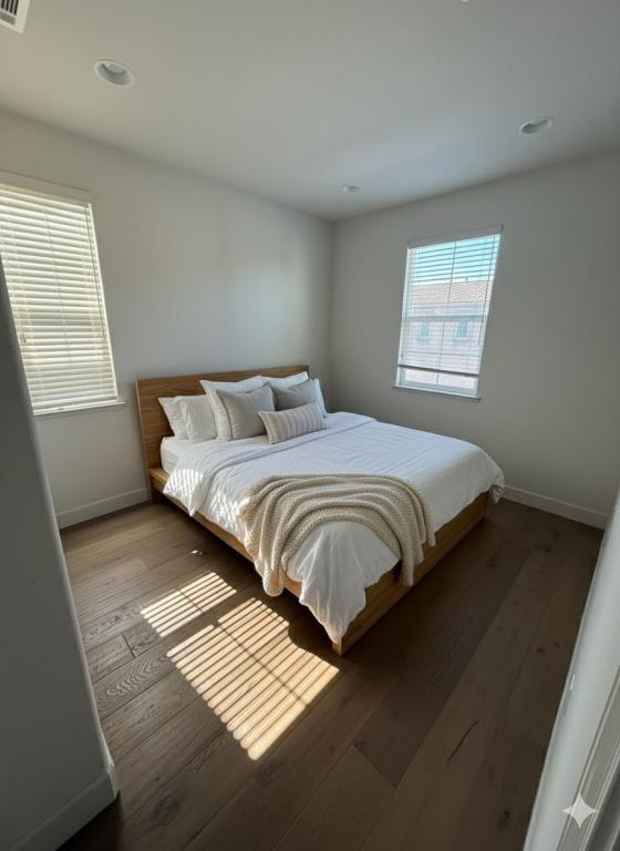 Modern and well maintained, this stylish 3-bedroom, 2.5-bath end-unit home (1,672 sq. ft.) is set in one of Milpitas' most desirable central neighborhoods. The open-concept layout is filled with natural light and enhanced by thoughtful upgrades throughout. The gourmet kitchen features stainless steel appliances, an oversized island with a breakfast bar, and a brand-new refrigerator. The spacious primary suite includes a walk-in closet and dual vanity. Additional highlights include hardwood floors, high ceilings, recessed lighting, two-zone central A/C, and in-unit washer and dryer. Enjoy the convenience of an attached two-car garage with resin-coated floors and storage racks, plus energy-efficient solar panels for lower utility costs. The well-maintained community offers a children's playground and easy access to major freeways (237, 880, and 680) for a quick commute to Silicon Valley hubs.