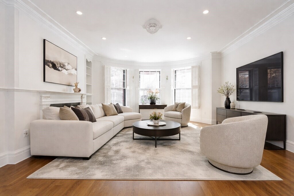 Beautifully renovated parlor duplex on the sunny side of tranquil Marlborough Street,offering direct access to a full parking space and a private garden. This exceptional residence is set within a grand 24-foot-wide building and features three bedrooms and three bathrooms,with oversized windows,soaring ceilings,and wood-burning fireplace. The home seamlessly blends classic elegance with modern comfort,featuring a central sitting room,a formal oval living room,and a high-end kitchen with new European appliances that opens to the dining area. A versatile home office or third bedroom adds flexibility to the layout. The spacious primary suite offers three generous closets and a marble en-suite bath with a soaking tub. The second bedroom is served by an additional full bath & provides access to the mudroom,garden and private parking.Located within a boutique four-unit building this home is just steps from the Charles River,Newbury St.,Public Garden & some of Boston’s finest dining MLS# 73494236