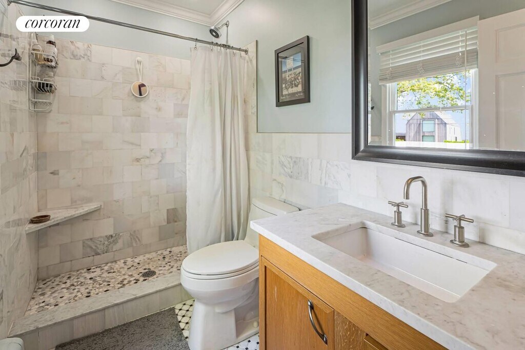 A true summer retreat! Spacious water view gourmet cottage with mature garden. This 5 bedroom, 3 bath home in the desirable Sag Harbor Village location of Redwood by the water. Layout contains 3 bedrooms on the main level with recently updated bathrooms, gourmet kitchen, pantry/mudroom and charming dining/living room areas. Inviting great room with fireplace, custom wine bar, and spacious high ceiling open area combining with the gourmet kitchen, ideal for family time and entertaining. Finished lower level with private entrance ideal for guests or personal support, including an additional 2 bedrooms, full laundry and ample living room/TV office space. Wonderful backyard with fire pit, bar, jacuzzi, 2 outdoor showers and bbq area; charming and secluded backyard offers the perfect Hamptons summer retreat. Pet friendly (for dogs up to 30 pounds) with a large, mature fenced in garden. Close access to a boat/paddleboard launch, and minutes to the heart of village.