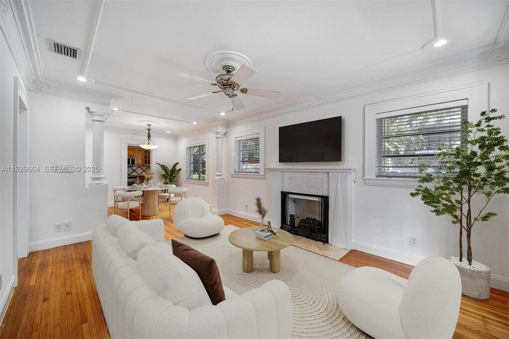 Welcome to this charming 2/1 residence tucked away in the heart of North Coconut Grove. Light-filled interiors showcase a cozy fireplace, spacious bedrooms with oversized cedar-lined closets, a screened-in patio, and a thoughtfully designed floor plan. The updated kitchen is equipped with GE appliances, granite countertops, and a water filtration system, while the bathroom features sleek glass tile and modern fixtures. Additional highlights include oak floors, high ceilings, a generous yard, a garage with washer/dryer, central air, a security alarm system, and an expansive driveway with ample parking. Easy to show!