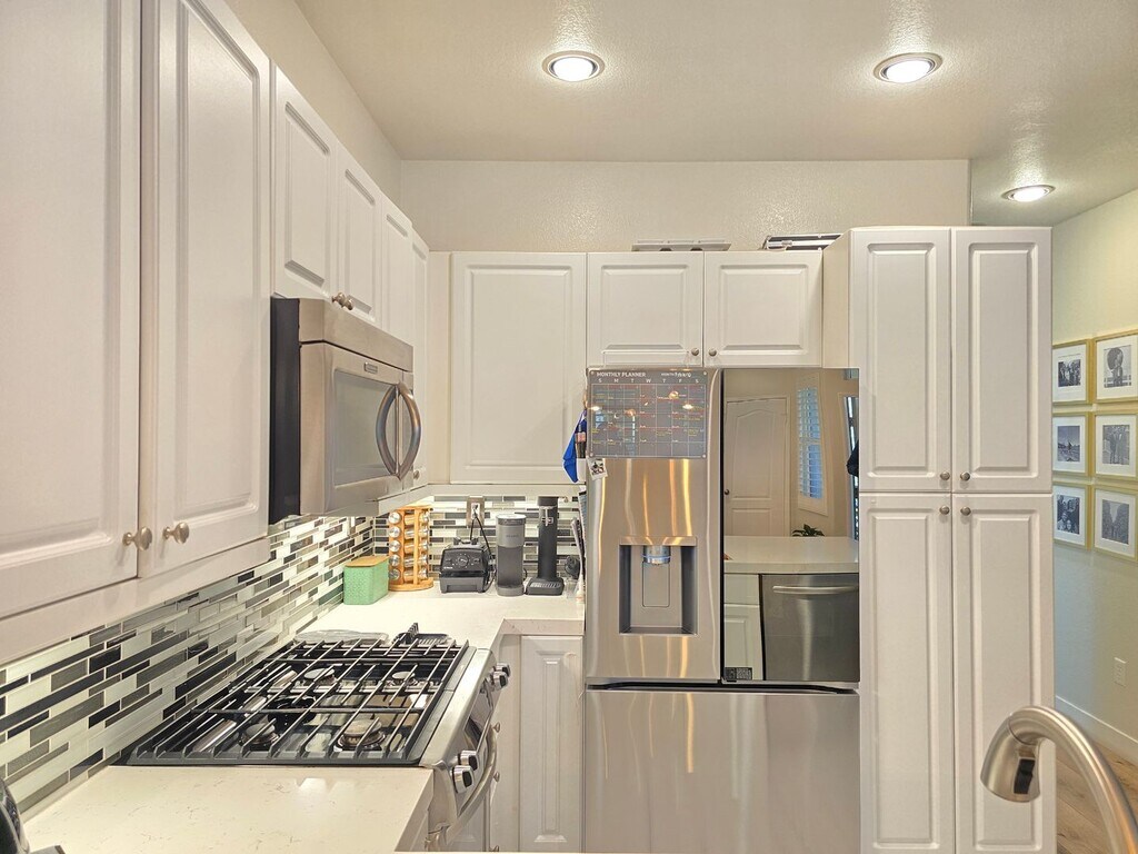 Now available for rent beginning May 1, 2026, this beautifully upgraded corner-unit townhouse offers 2 bedrooms, 2 bathrooms and approximately 1,044 sq. ft. of living space in the highly desirable Canyon Country area of Santa Clarita, conveniently located just minutes from the 14 Freeway. This bright and inviting home features a modern open floor plan with vinyl plank flooring throughout, creating a clean and contemporary feel. The spacious living room includes a cozy fireplace and large windows with plantation shutters that allow natural light to fill the space. The upgraded kitchen features white shaker cabinets, recessed lighting, quartz countertops, a modern tile backsplash, and stainless steel appliances, making it both stylish and functional. The kitchen opens to a breakfast bar and dining area, perfect for entertaining or everyday living. All major appliances are included for your convenience: • Stove • Microwave • Dishwasher • Refrigerator • Washer & Dryer The home also offers central air conditioning and heating to keep you comfortable year-round. The primary bedroom is spacious and bright and connects to a large ensuite bathroom with dual sinks and a full shower/tub combination. The second bedroom is ideal for guests, a home office, or additional living space. Enjoy outdoor relaxation on the private covered patio located just off the living room, perfect for morning coffee or evening wind-downs. Additional features include: • 1-car private garage • 1 additional assigned parking space near the unit • Water included in rent • Corner unit for added privacy Residents also enjoy access to a beautifully maintained gated community featuring resort-style amenities including: • Swimming pool • Spa • BBQ area • Tennis courts • Basketball court • Lush landscaping and walking paths Located close to shopping, dining, parks, and commuter routes, this home offers the perfect balance of comfort, convenience, and community living. Address: 17941 Lost Canyon Rd #4 Santa Clarita, CA 91387 Available: May 1, 2026 This is a wonderful opportunity to live in one of Santa Clarita’s most convenient and well-maintained communities.