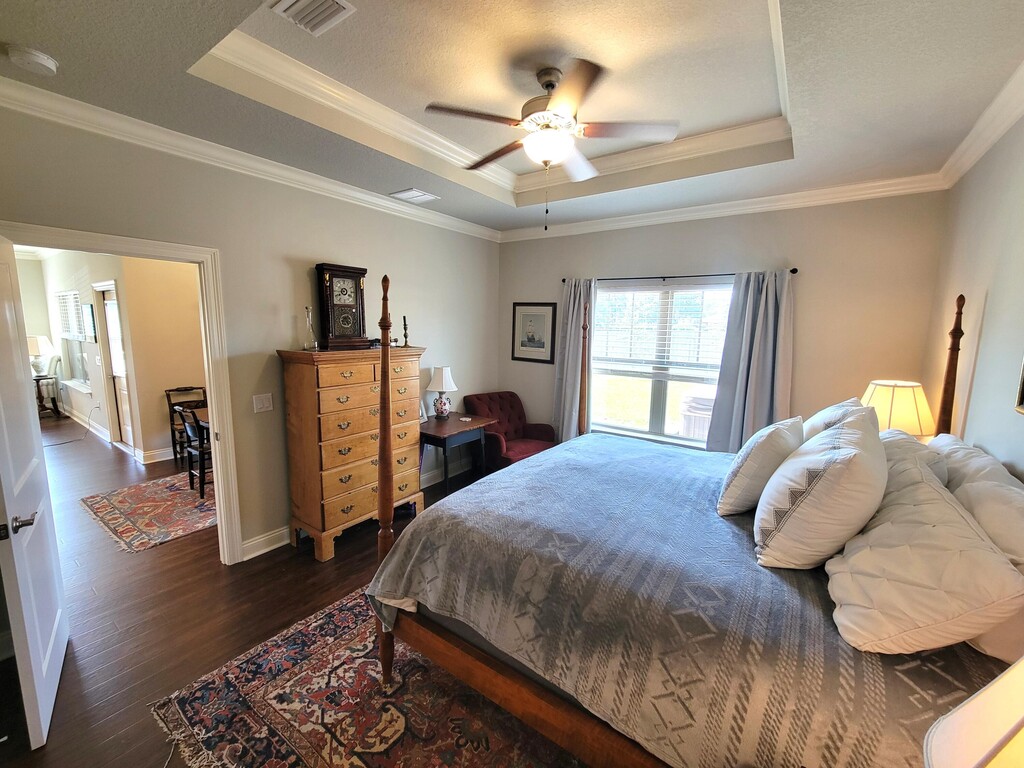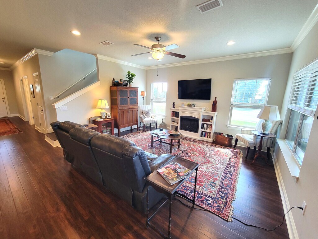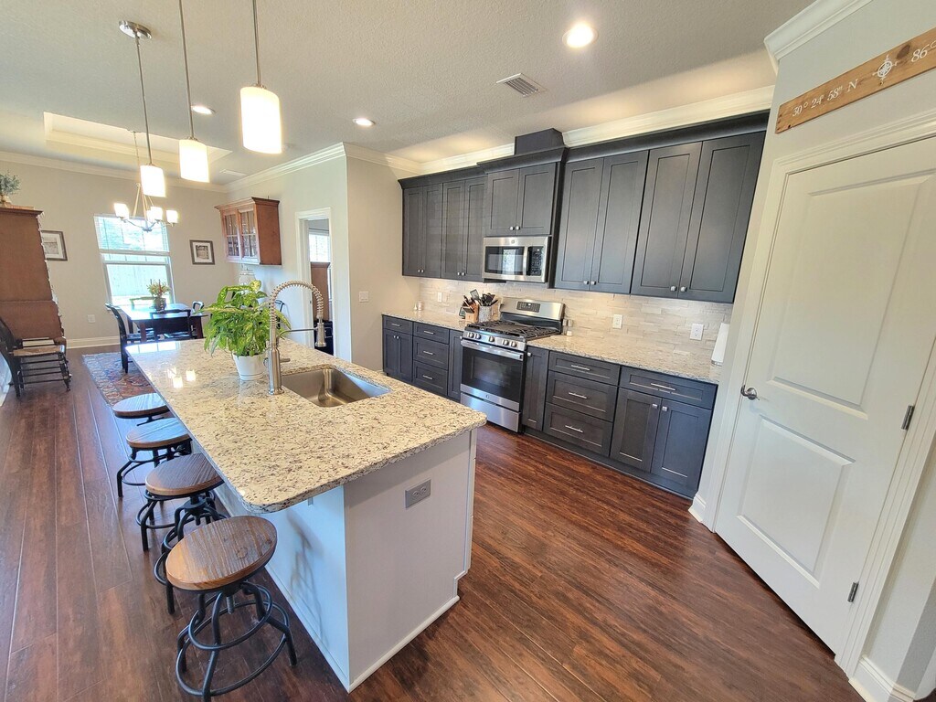 Presenting a remarkable rental opportunity in the sought-after Medlin Preserve community in east Navarre. This well-appointed home, constructed in 2021, stands out with its robust exterior of brick and cement fiber board, accentuated by an architectural shingled roof. Enjoy views of the sound from your front porch or relax in the private, fully fenced backyard featuring a luxurious hot tub.Inside, the home impresses with thick wood laminate flooring throughout, complemented by neutral tiles in the bathrooms and laundry room. The first-floor primary bedroom and dining room feature sophisticated tray ceilings, and the functional layout includes an additional bedroom and full bath on the first level, with two more bedrooms and a full bath located upstairs.