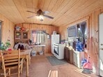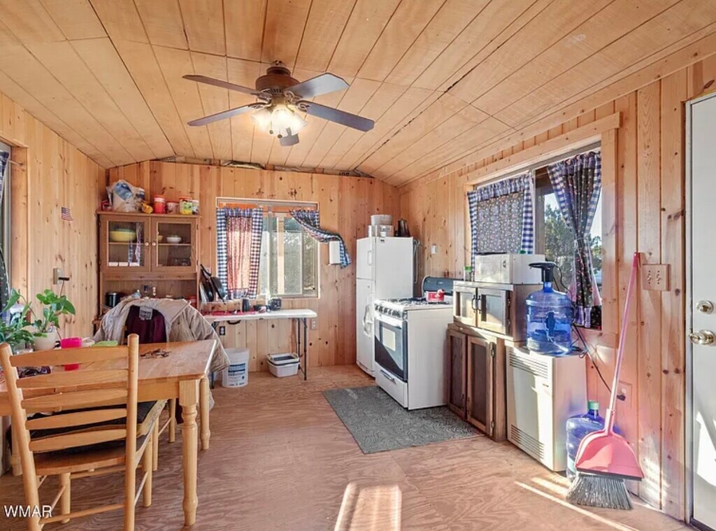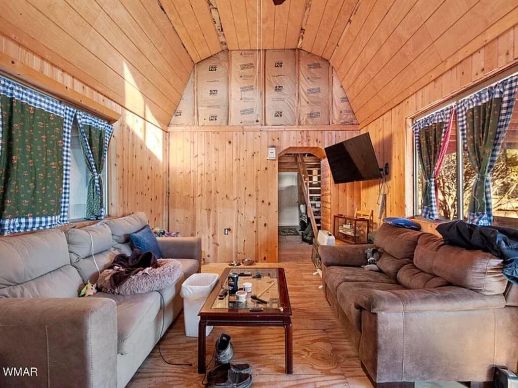 Unfinished 680 square foot cabin, with solar power, a porch swing, one bedroom, one bathroom, a small loft, a closet, a living room, plus a kitchen/dining area. A solar powered gate opens to the cabin on a property, 3.5 fenced acres, shared with the main house (on the other side of the property). Cabin does have it’s own address.