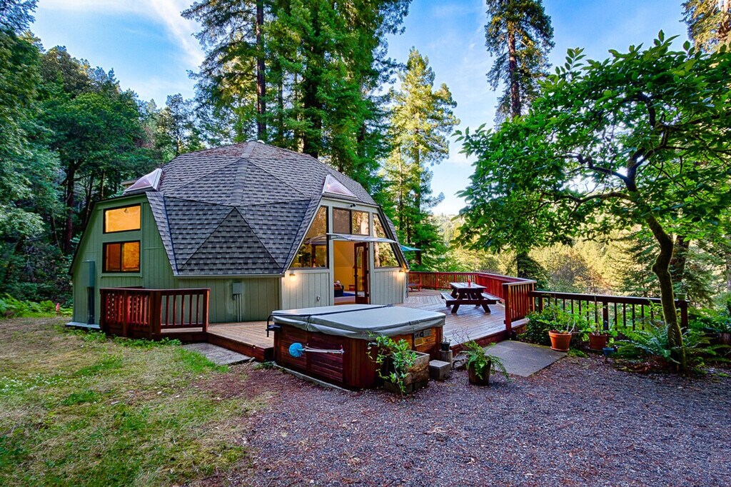 The advertised rate of $9,676/month is the lowest available price, based on a 30 day(s) stay with a move-in date of October 12, 2026. Rates vary depending on the duration of stay, season, and other parameters. For exact pricing and additional pricing components, please visit our website and enter your desired move-in and move-out dates. The rate is applicable when billed upfront; it can be higher if billed in multiple payments. Feel at home in the Redwood Dome, a unique geodesic dome on 2.5 acres of private property in Russian River. This 1-bedroom, 1-bathroom retreat is ideally located within minutes of hikes, the river, wineries, and the Sonoma coastline. This private sanctuary features an open, high-ceiling layout with a spacious living room, dining room, and kitchen. Skylights and high ceilings create the perfect getaway. The upstairs bedroom has a skylight and a writer's nook, and the downstairs bathroom is comfortable and spacious. Enjoy sweeping forest views from the spacious living room, which includes a 92" HD projector and screen with Netflix. There are throw blankets throughout for an extra touch of coziness. A wood-burning stove is available for use in the fall and winter. There are two decks that look out onto the forest, and the upper deck has an outdoor bench for dining al fresco. Enjoy your own private hot tub. Russian River is a wonderful part of Sonoma County, boasting beautiful redwoods, breathtaking views, wineries, hikes, and beaches. You'll be about 15 minutes away from Highway 1 and the Pacific Ocean, and 15 minutes away from Downtown Guerneville. A car is needed to get to the Redwood Retreat. This space is best used for quiet retreats and reconnecting with nature. Absolutely no guests outside of the reservation are allowed; any external guests are grounds for immediate cancellation without refund and may incur an additional charge of $150 per guest, per night. While private, there are neighbors, so please keep noise levels down. Quiet hours are between 10 PM and 7 AM. If the hot tub requires a deep cleaning (drain and clean) after a stay, the guest agrees to pay $200. No drugs or smoking are allowed. There are outdoor cameras for your and our protection. Fire starters are strictly prohibited as they can do serious damage to the stove and can pose a fire risk. High-speed internet is readily available. Includes a writer's desk overlooking the redwoods for work or creative inspiration. Registration Number: 2565N [SI]