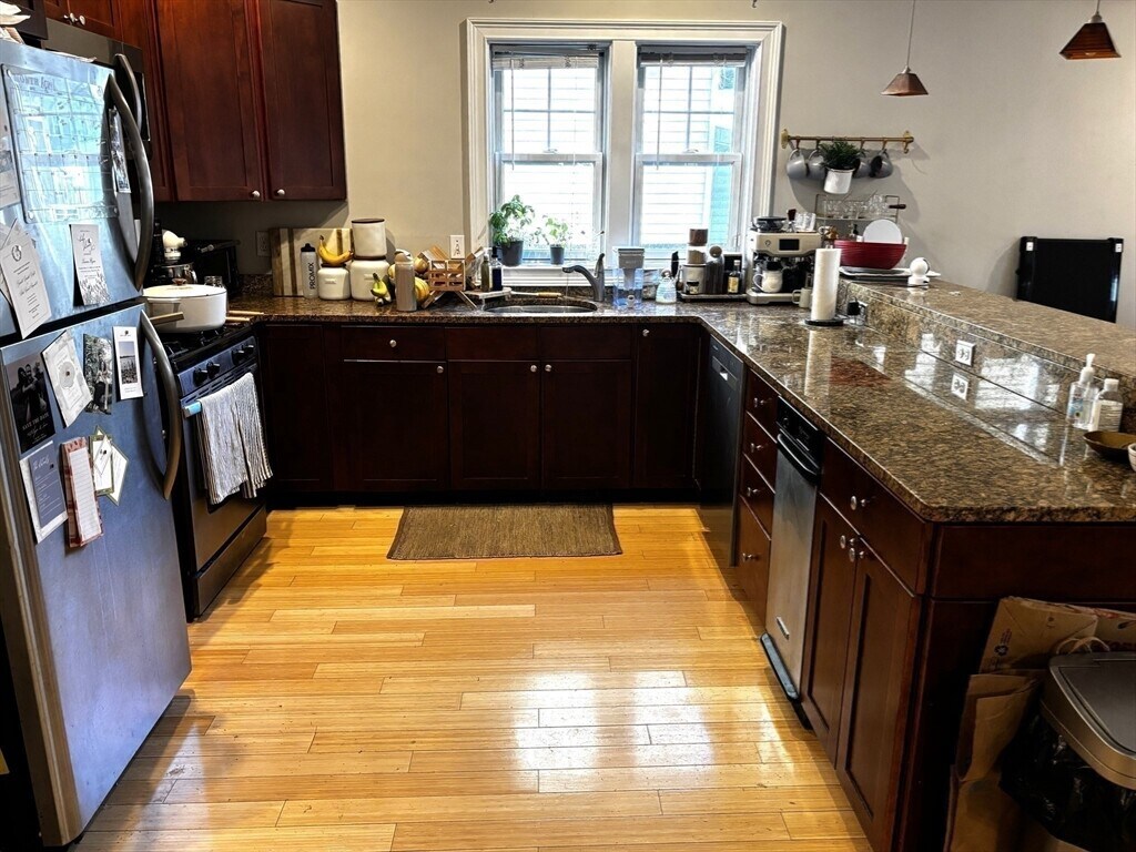 JUNE 1st. 15 month Lease until 8/31/27 with option to renew for 12 months. Large (1535 sq ft) 3 bed,2.5 bath Duplex with one off street parking spot. Hardwood floors on the main level and new laminate floors in the lower level. One bedroom has a private full bath. Open floorplan. Kitchen has granite counters and stainless appliances. Living room has a gas fireplace. Central A/C. Private deck. Washer and dryer in the unit. Private storage space. Utilities not included. Sorry no pets or smoking allowed. MLS# 73500564